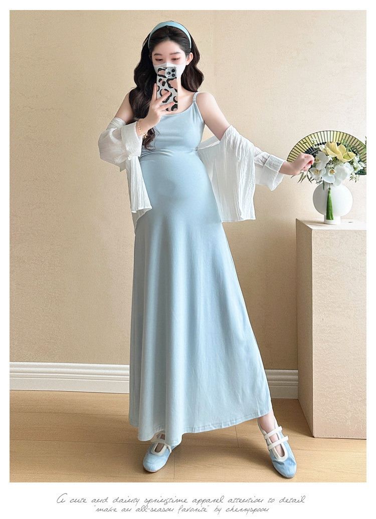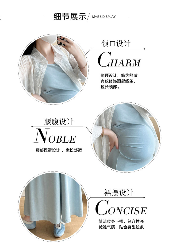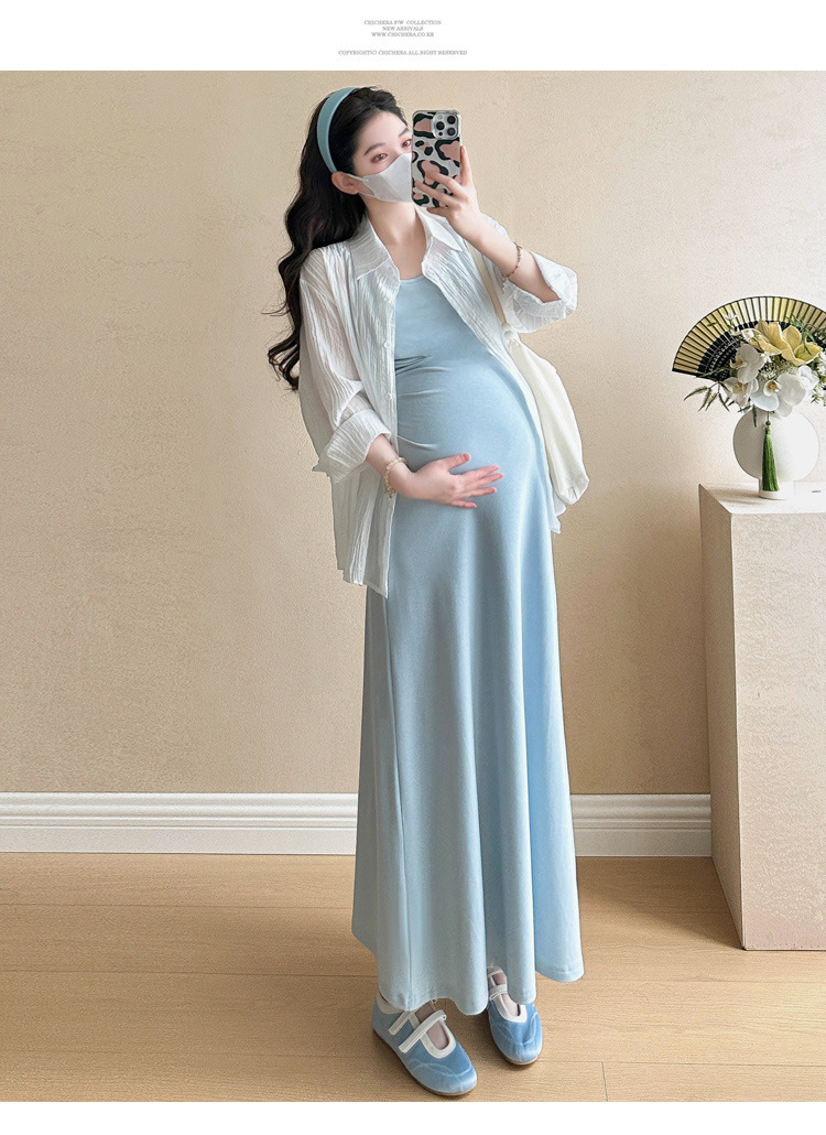 2025 여름 출산 원피스 프랑스 간단한 두 조각 새로운 긴팔 셔츠 주름 디자인 임산부 여성 슬립 스커트