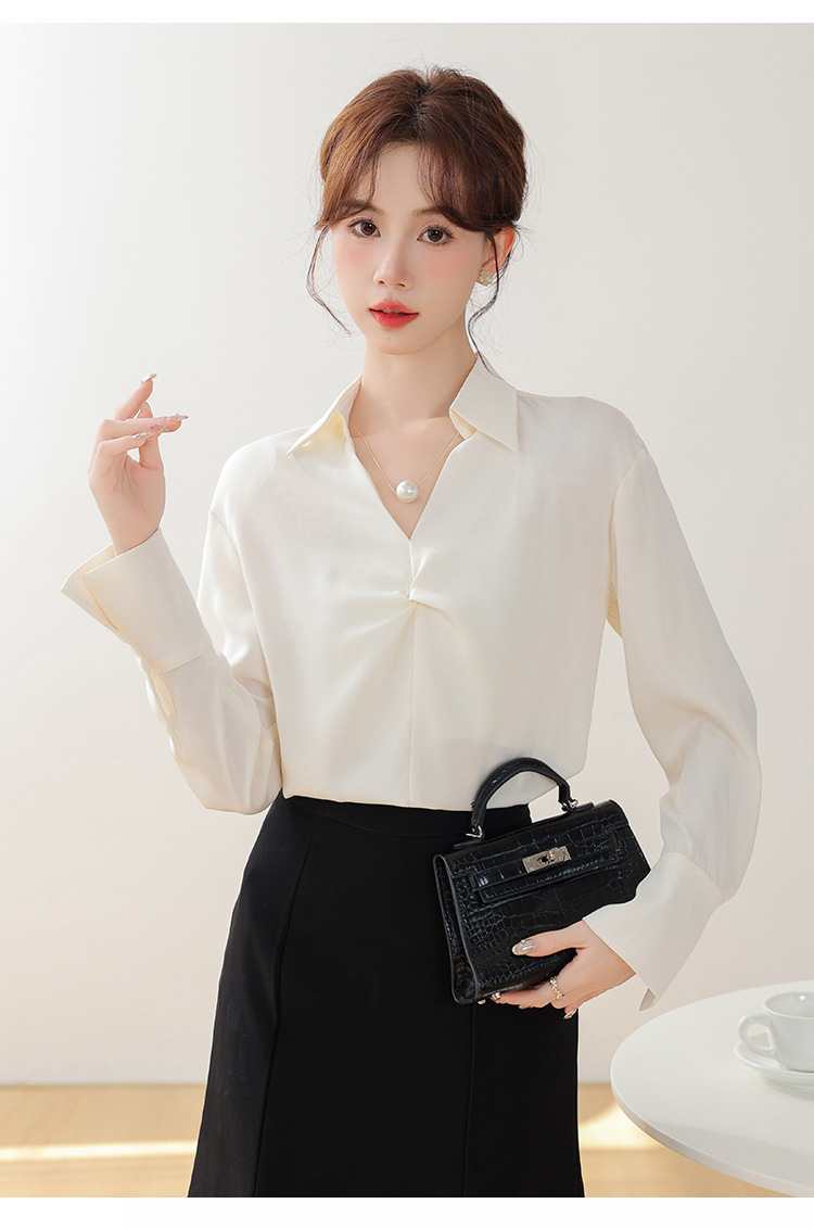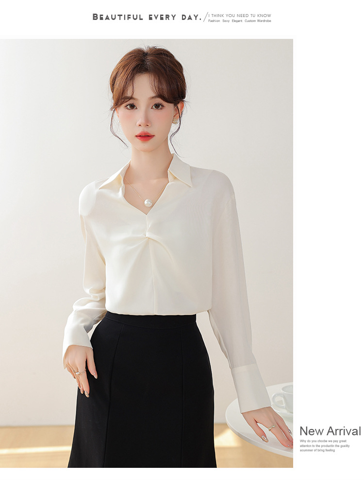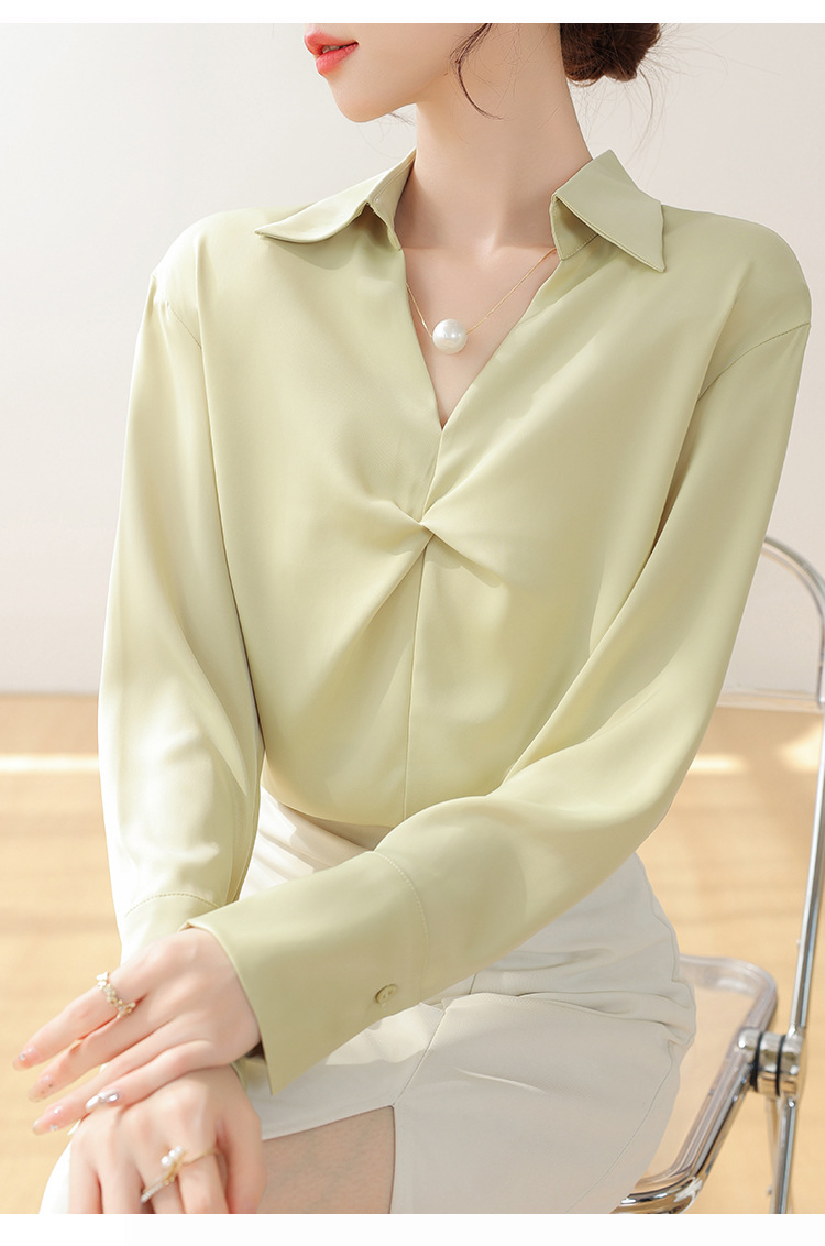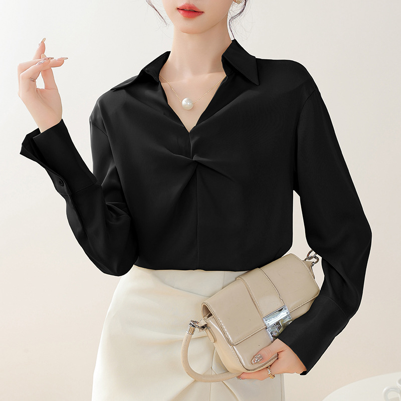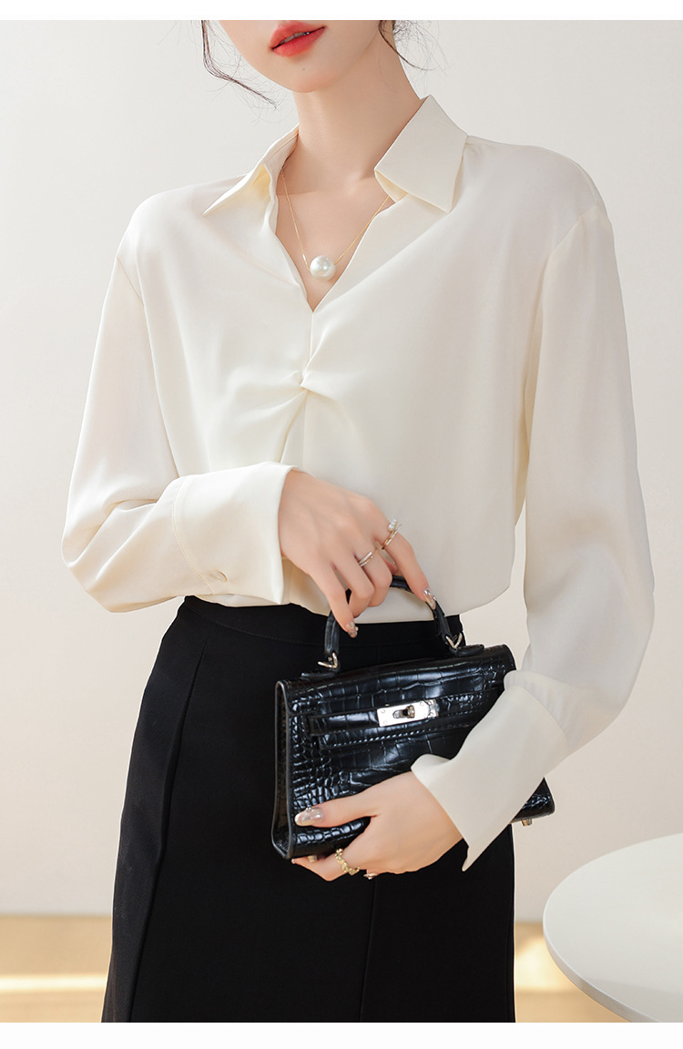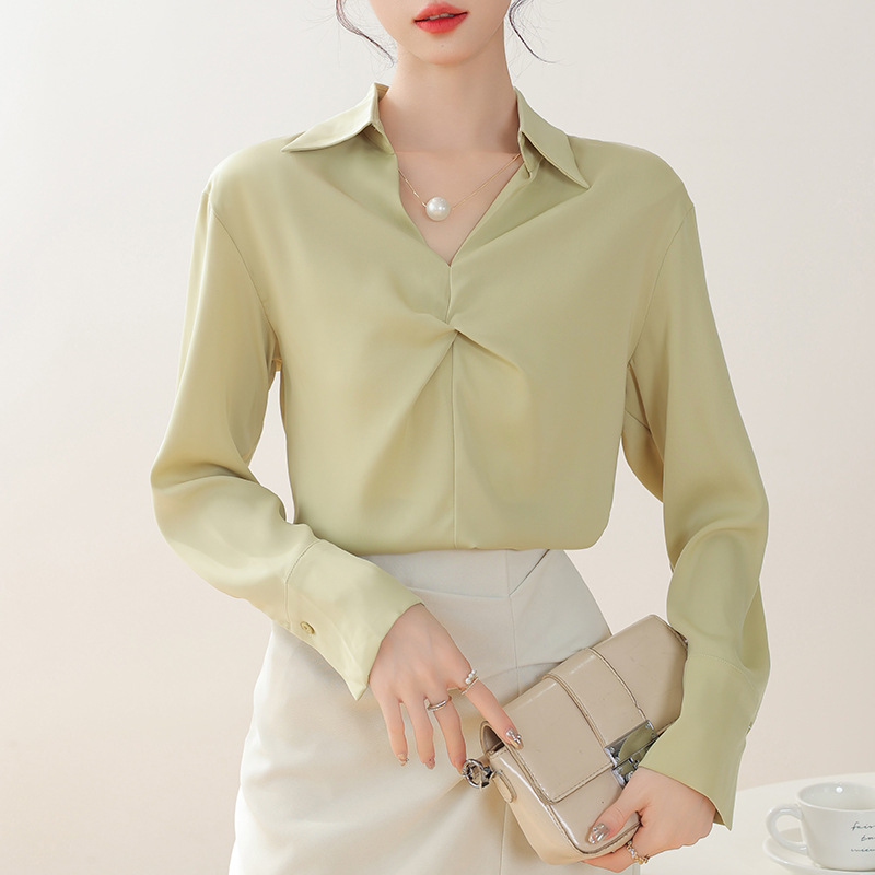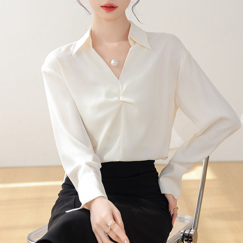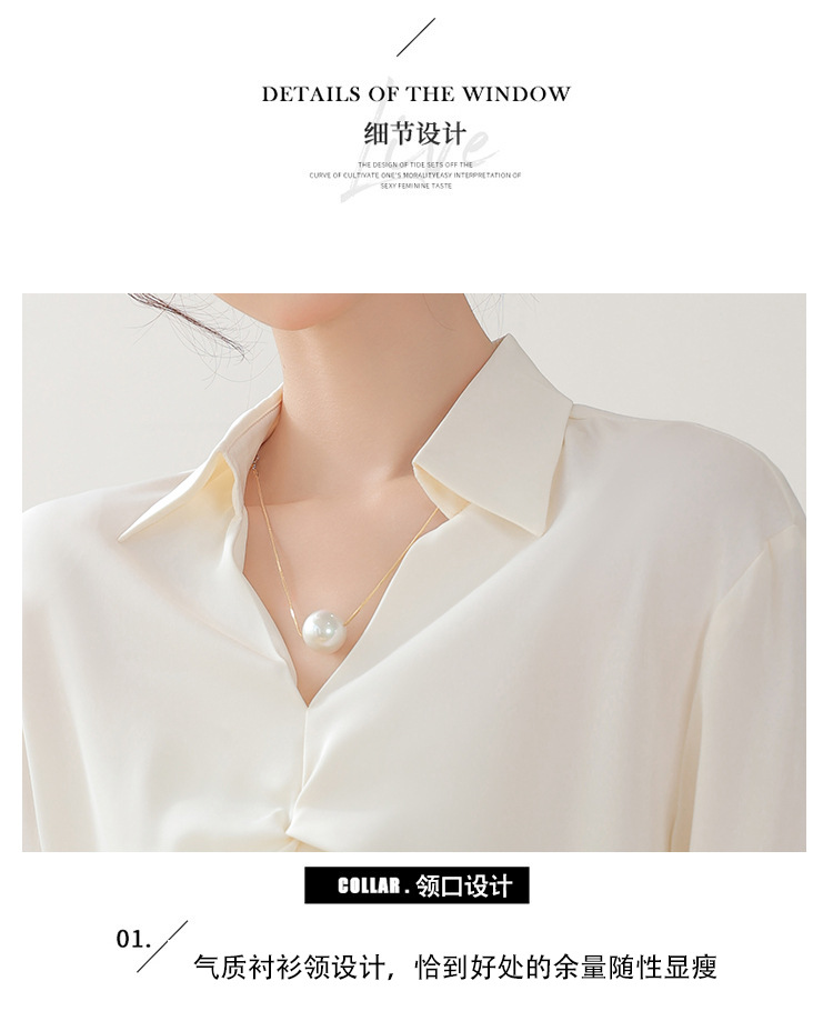 프랑스 스타일 디자인 우아한 새틴 셔츠 여성의 봄 새로운 통근 슬리밍 진주 목걸이 전문 탑