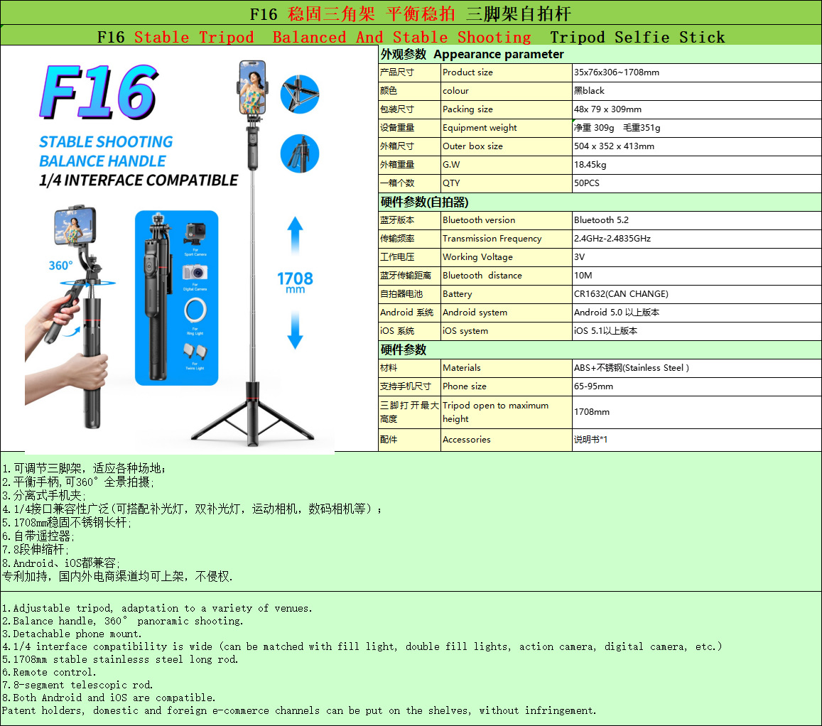 • F16 [블랙 스탠다드 에디션] 밸런스 핸들 1.7m 스테인레스 스틸 로드*360°밸런스 핸들*업그레이드된 용골 3각 지지대*1/4 인터페이스
