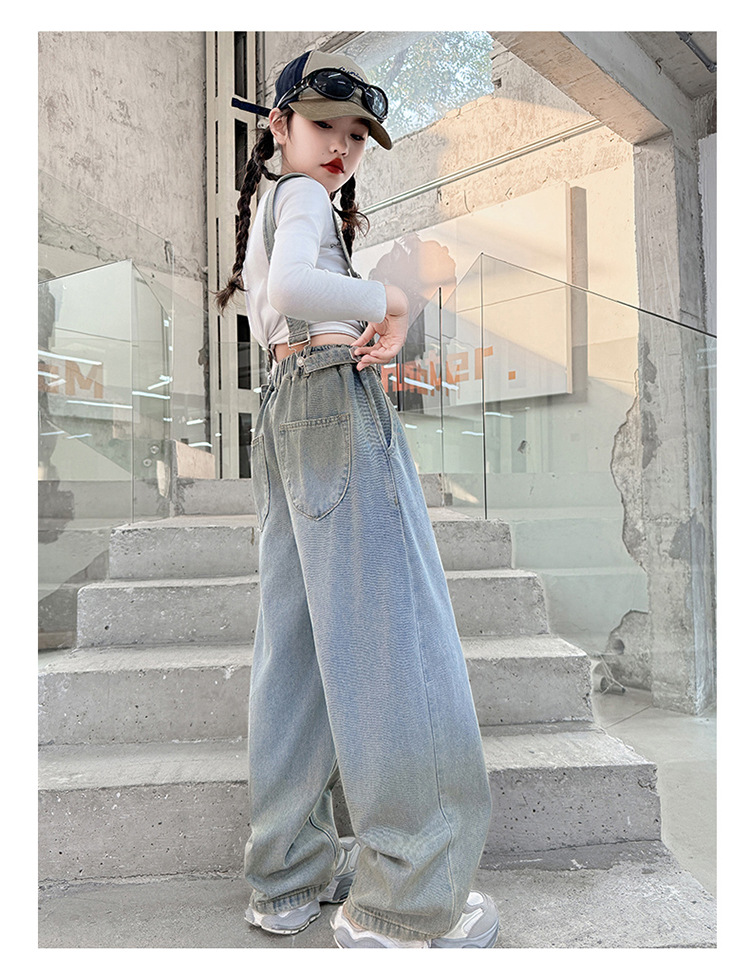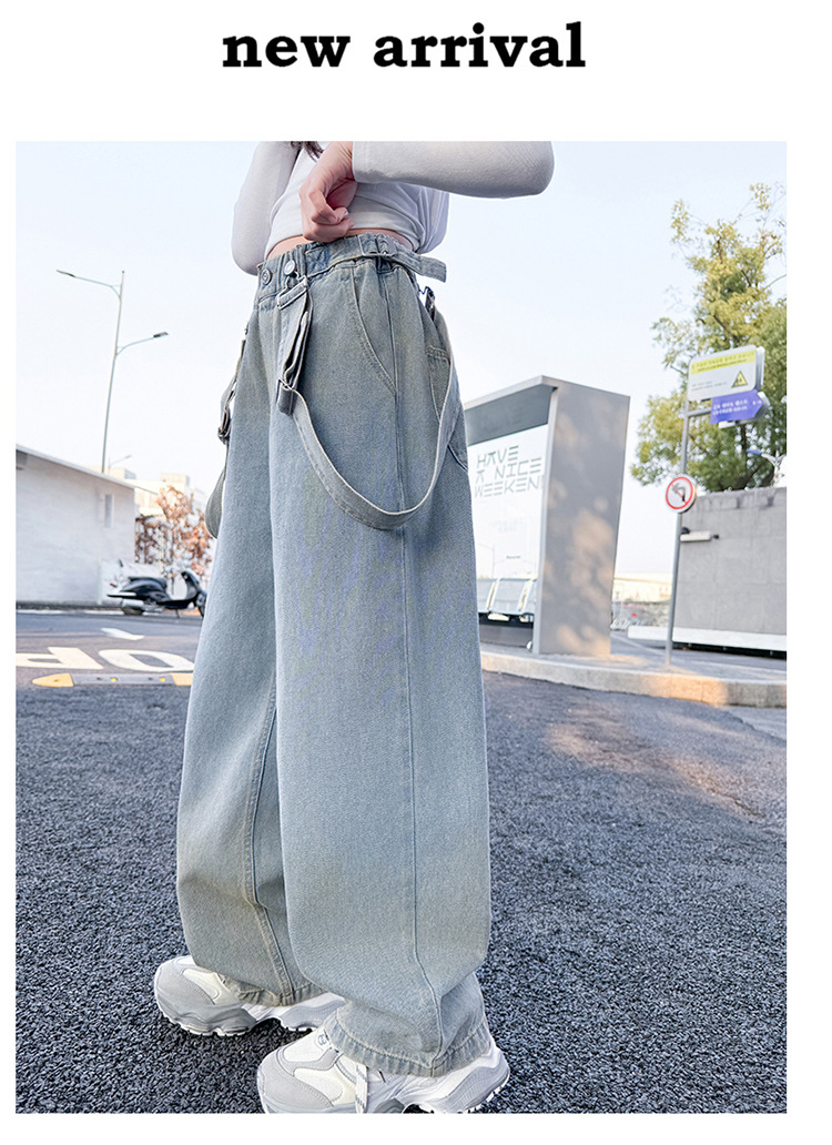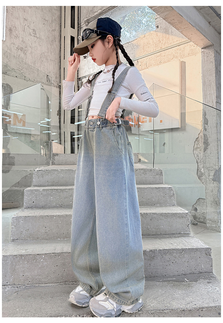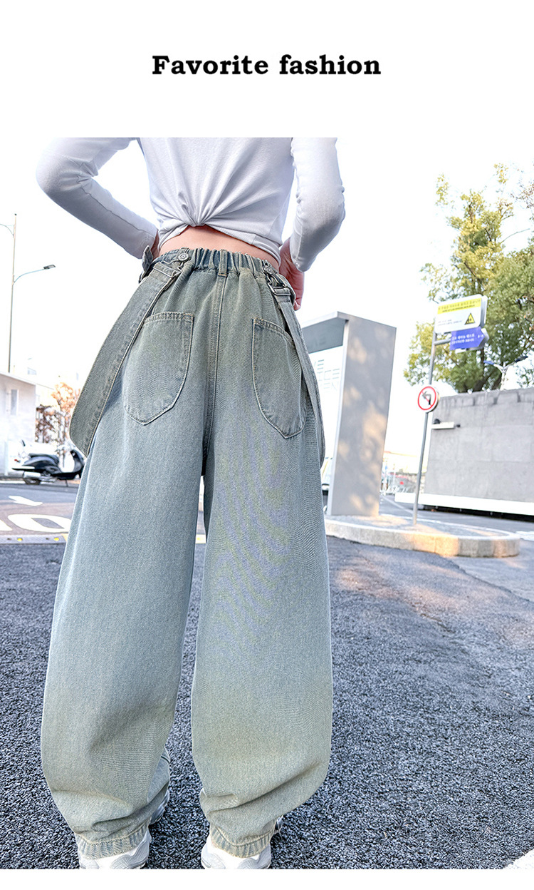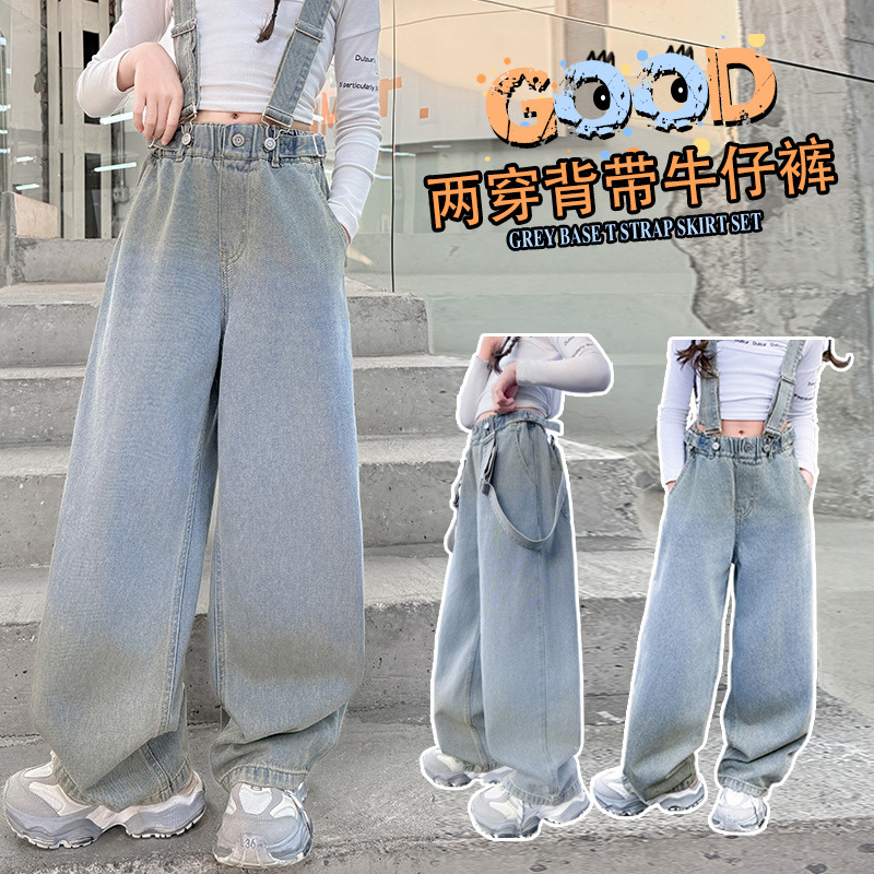 소녀 바지 봄 2025 새로운 서양 스타일 미드 빅 어린이 스트랩 청바지 어린이 봄과 가을 느슨한 넓은 다리 바지스토어 가기