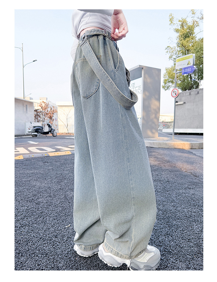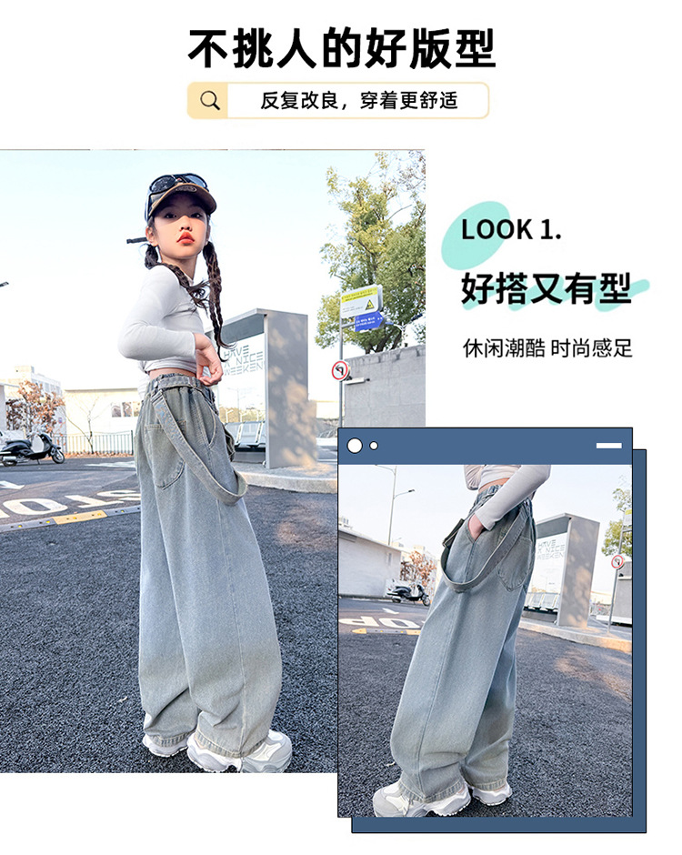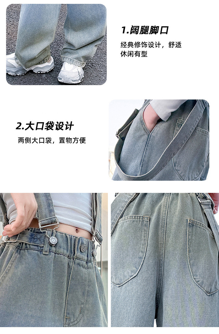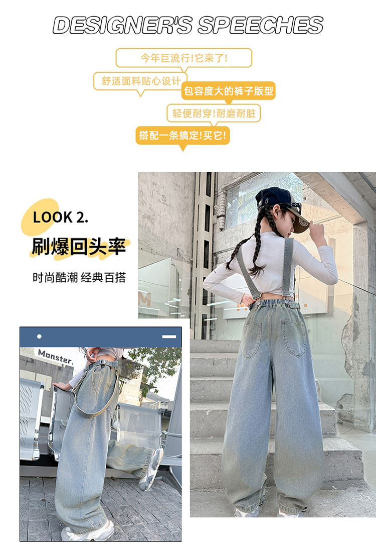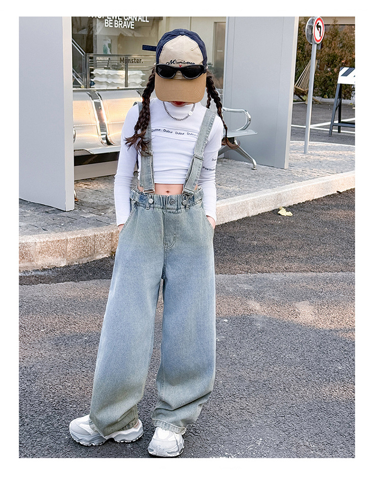 소녀 바지 봄 2025 새로운 서양 스타일 미드 빅 어린이 스트랩 청바지 어린이 봄과 가을 느슨한 넓은 다리 바지스토어 가기