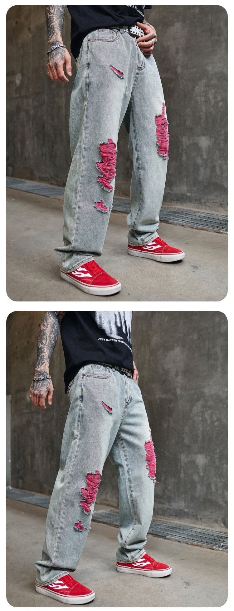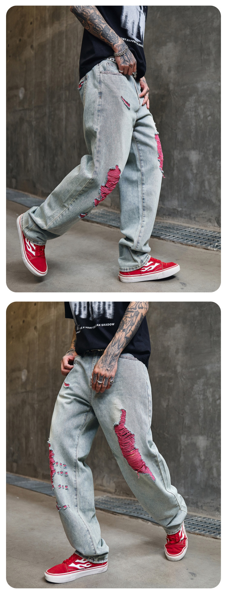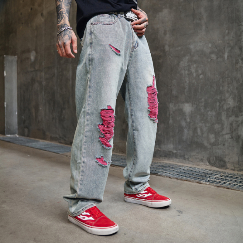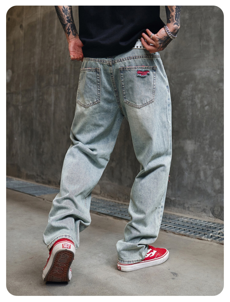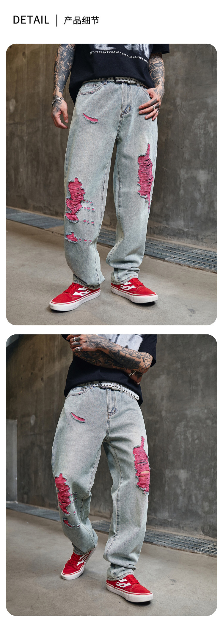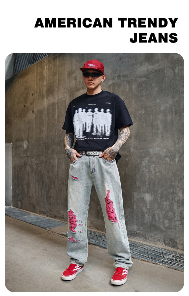 위안 세탁 데님 아메리칸 스타일 플래시 홀 전기 바지 유행 남성 느슨한 스트레이트 남성용 청바지스토어 가기