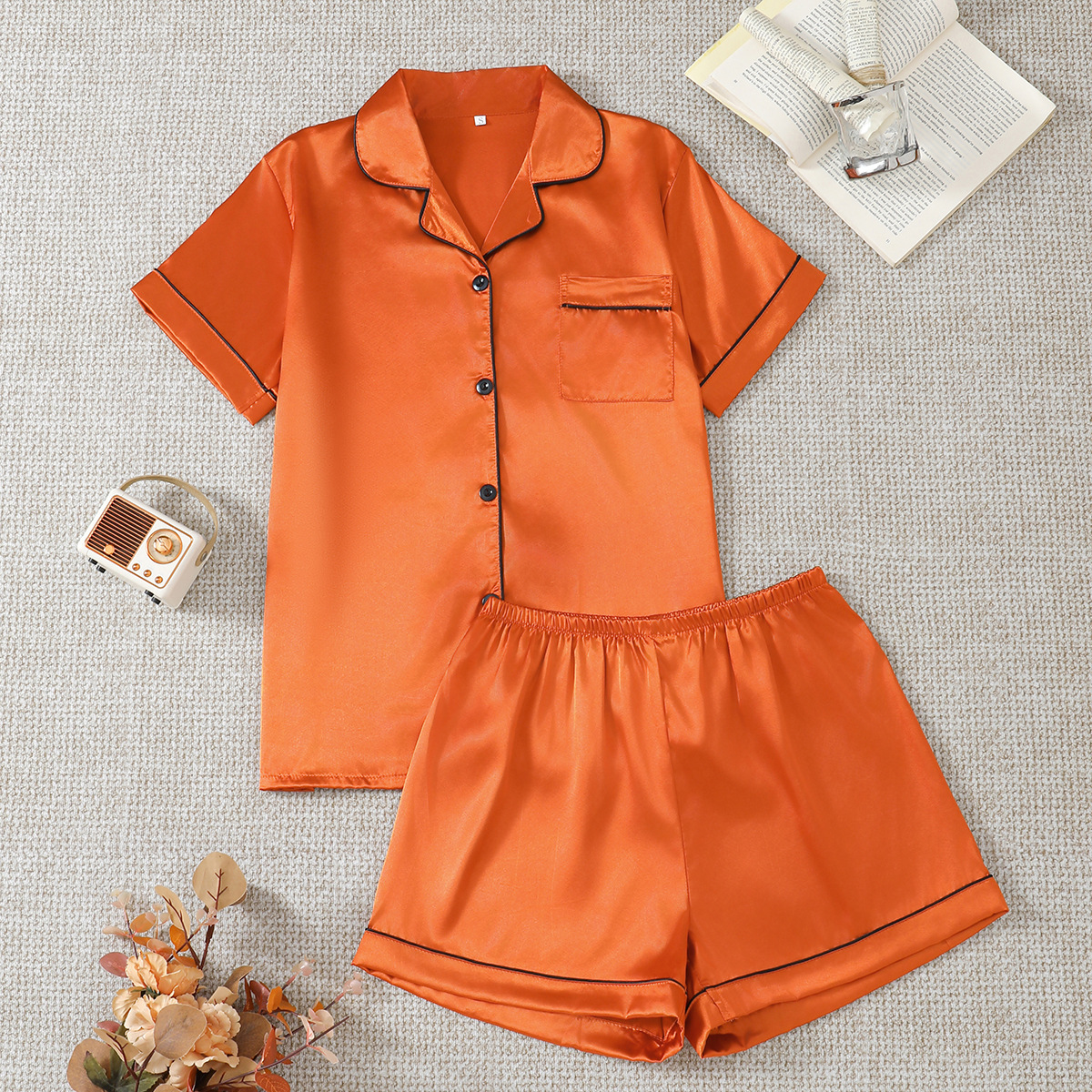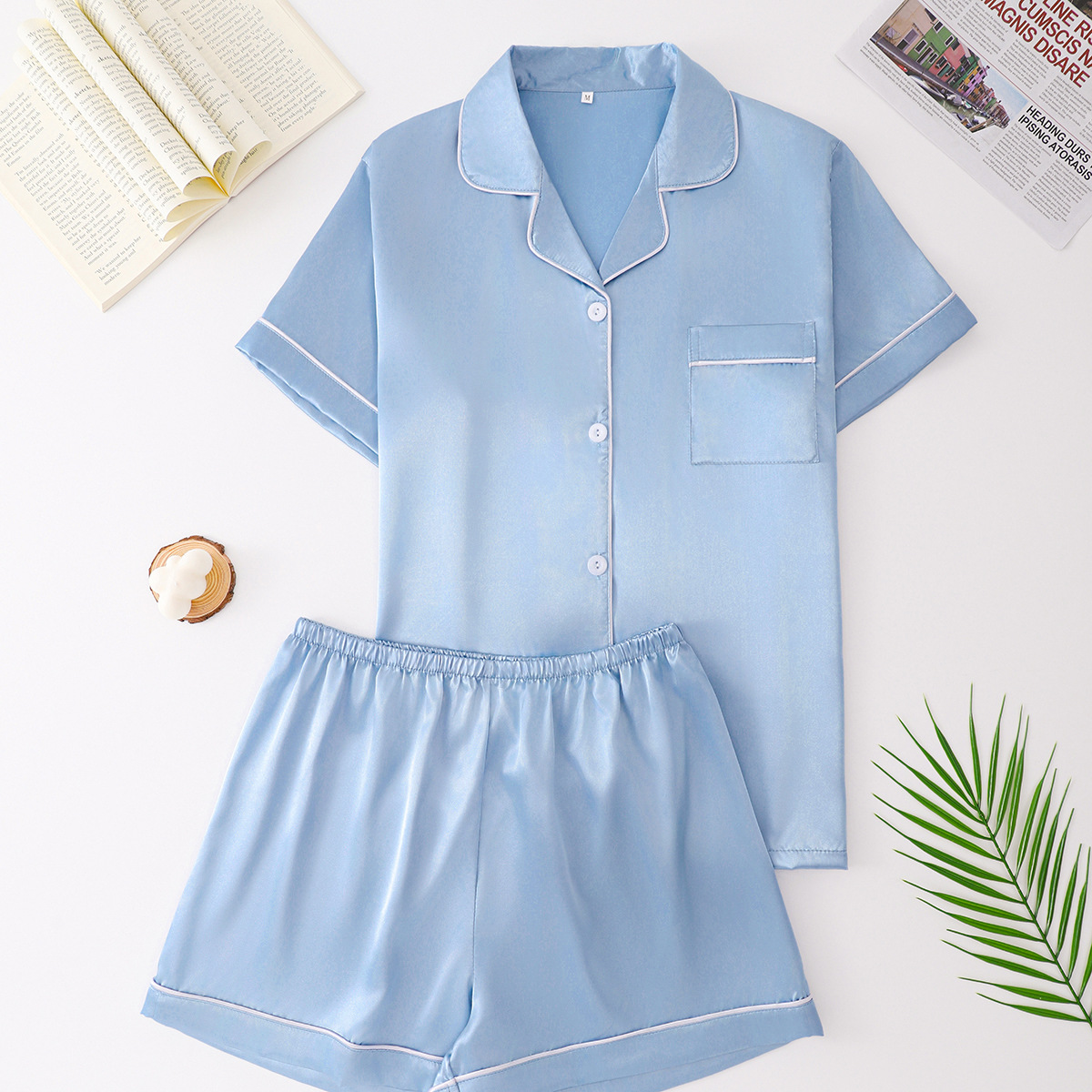여성용 잠옷 유럽과 미국의 반팔 반바지 여성용 홈웨어 국경 모조 실크 대형 옷깃 캐주얼 잠옷 세트