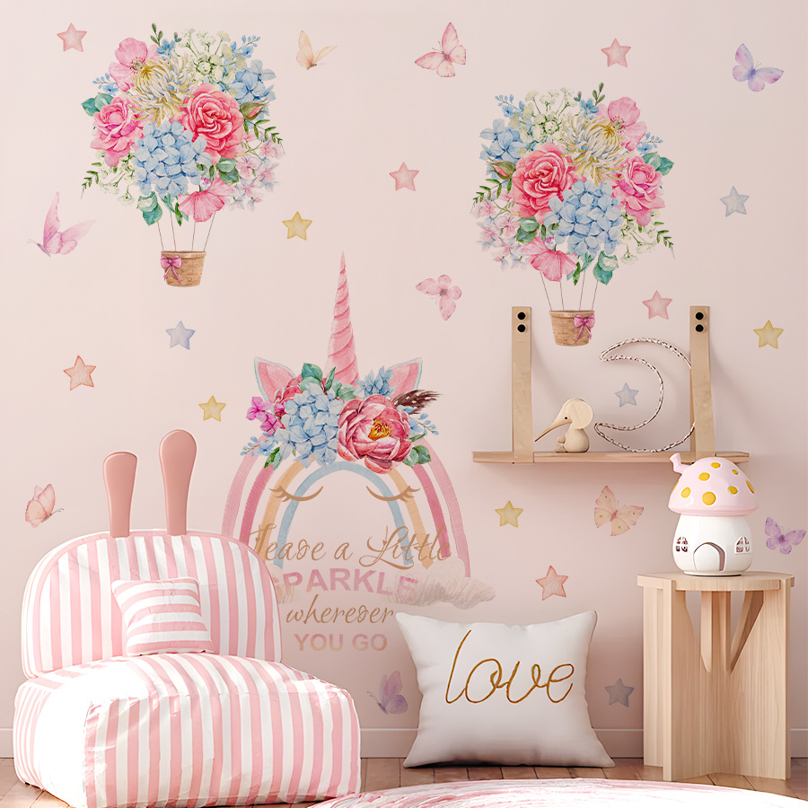 BR3549M 만화 유니콘 무지개 꽃 나비 셀프 접착 벽 스티커 침실 기숙사 어린이 방 장식 스티커