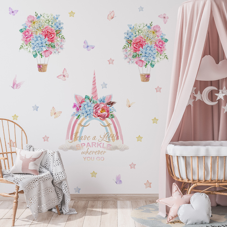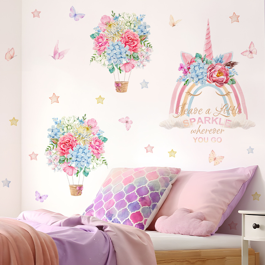 BR3549M 만화 유니콘 무지개 꽃 나비 셀프 접착 벽 스티커 침실 기숙사 어린이 방 장식 스티커스토어 가기