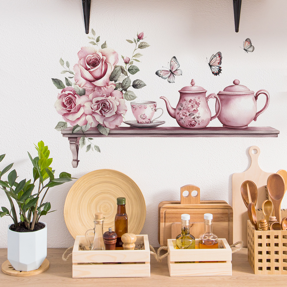 Fun-b129 수채화 장미 차 세트 주방 레스토랑 벽 배경 미화 장식 벽 스티커 도매