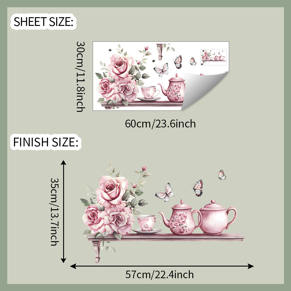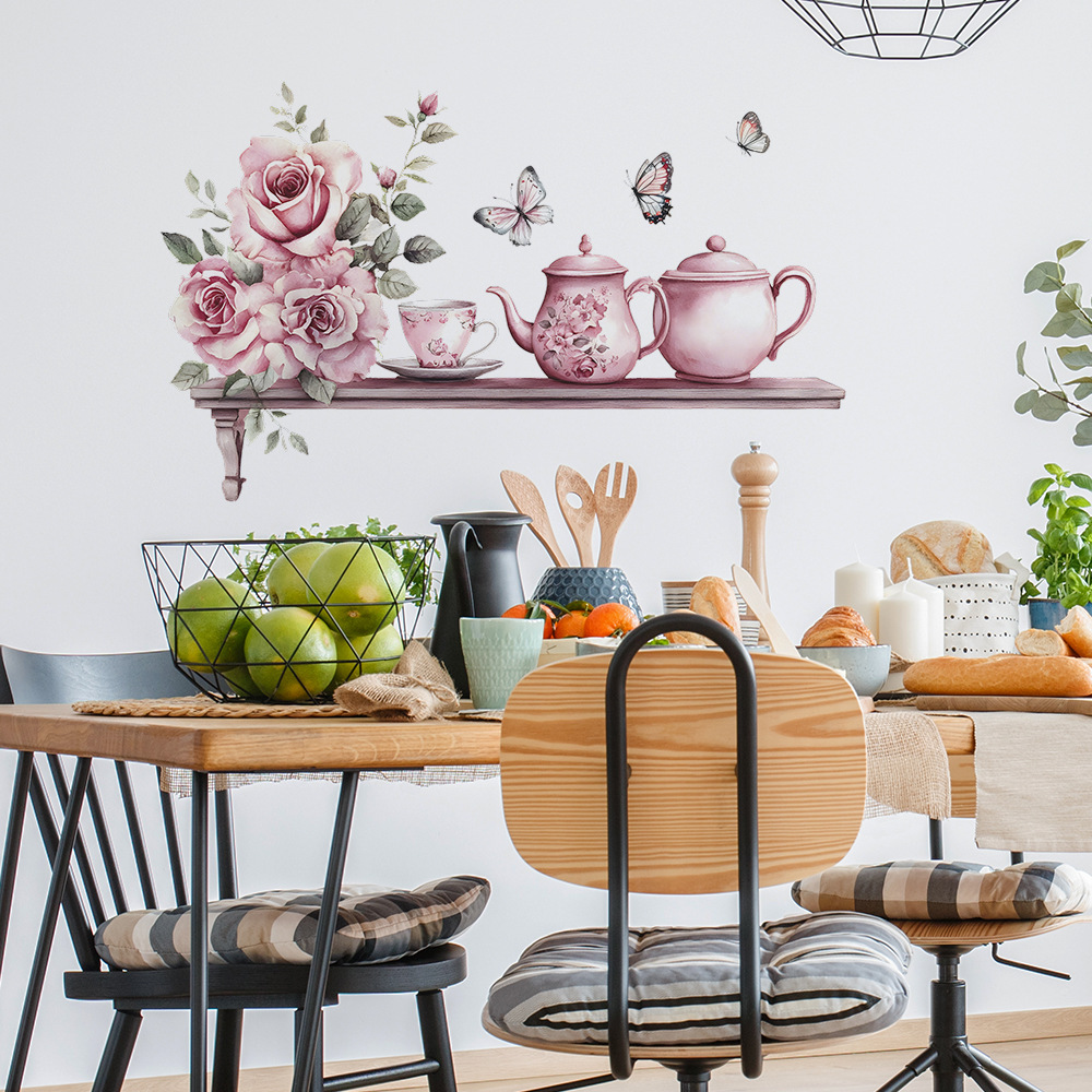 Fun-b129 수채화 장미 차 세트 주방 레스토랑 벽 배경 미화 장식 벽 스티커 도매스토어 가기