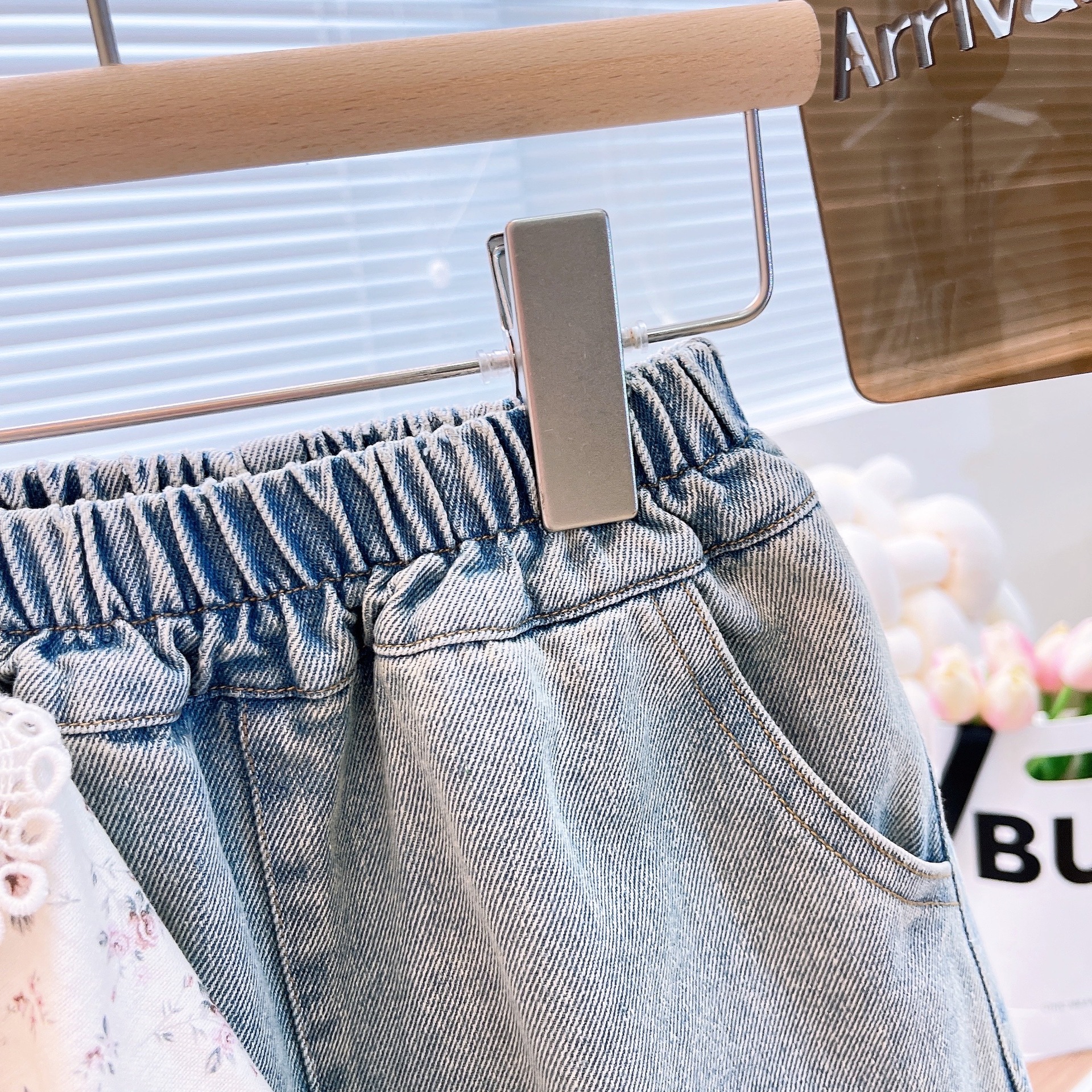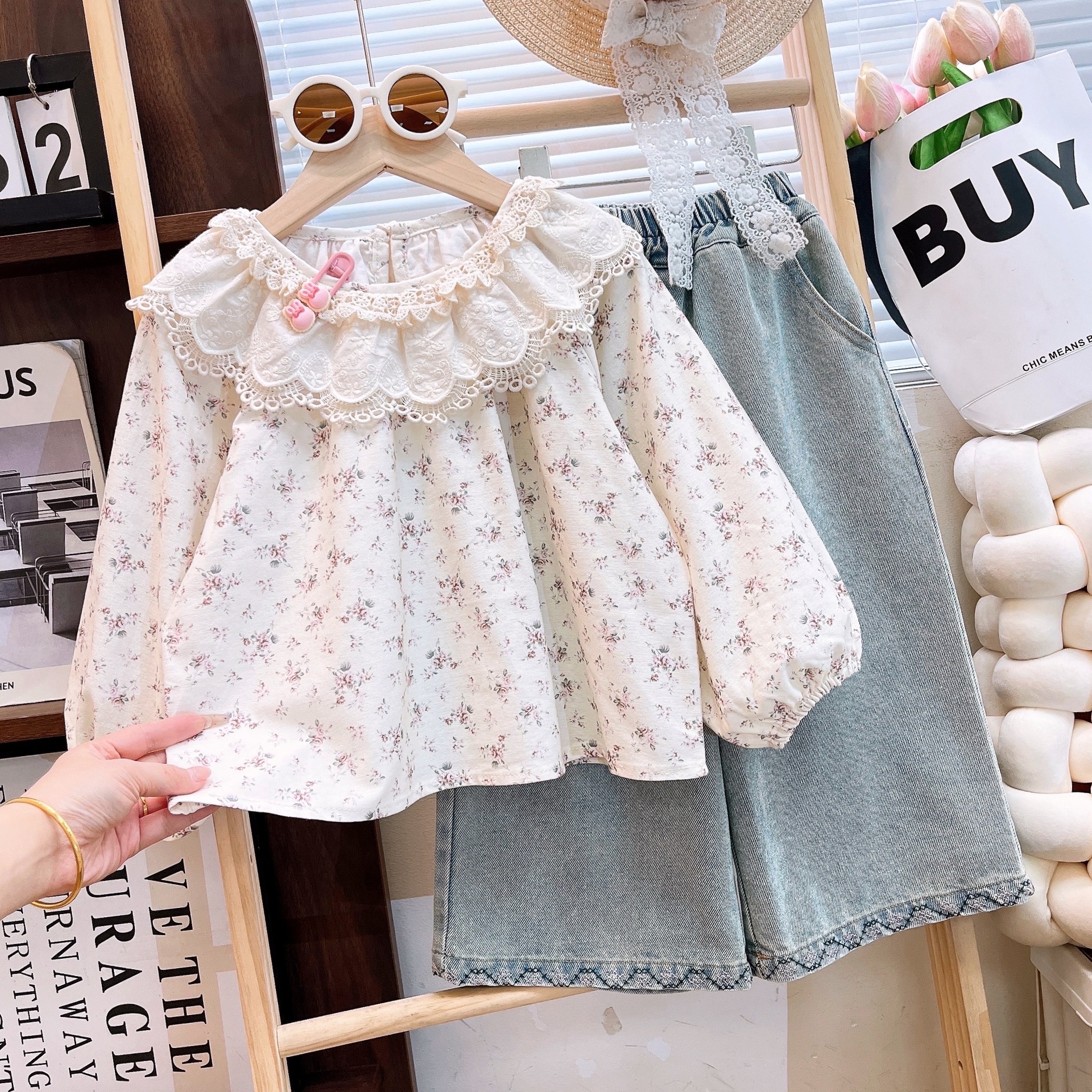 2025 봄과 가을 새로운 소녀 인형 칼라 꽃 셔츠 플러스 청바지 세트 소녀 귀여운 투피스 세트스토어 가기