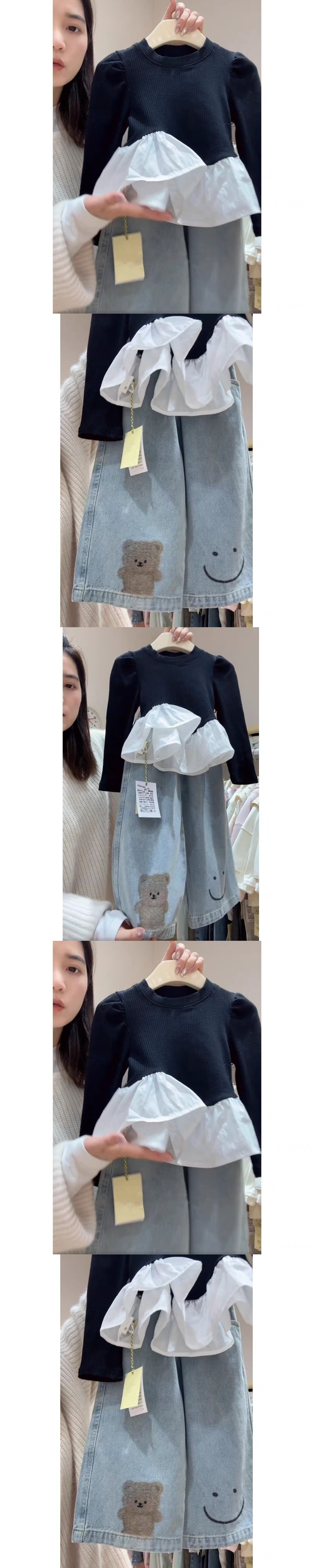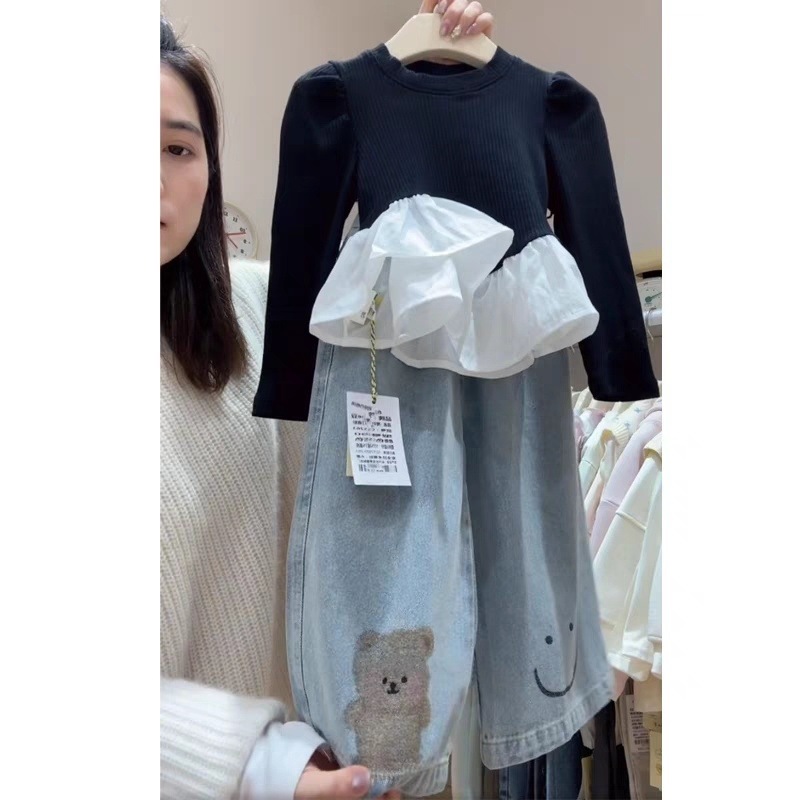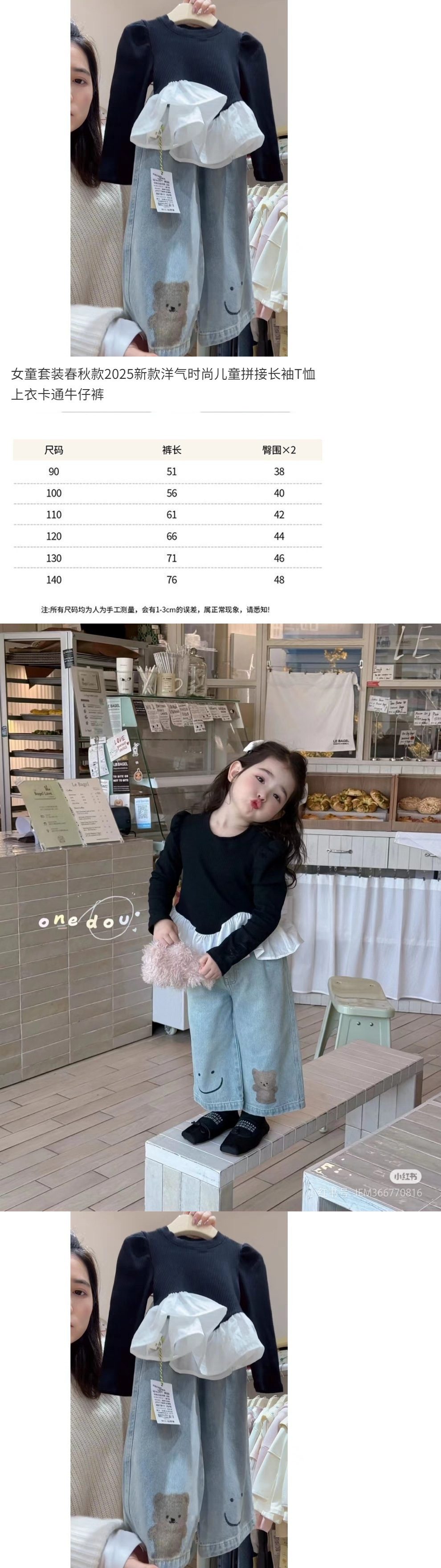 소녀 세트 봄과 가을 2025 새로운 서양 스타일 패션 어린이 바느질 긴 소매 티셔츠 최고 만화 청바지