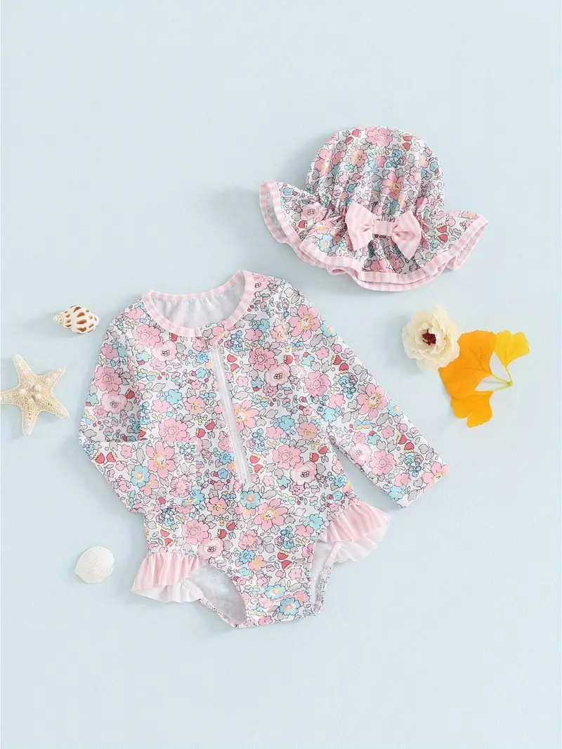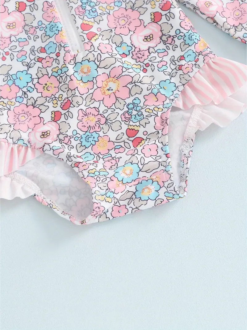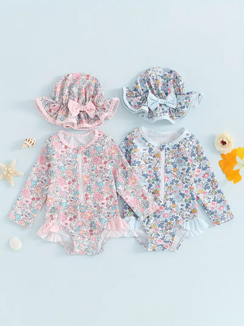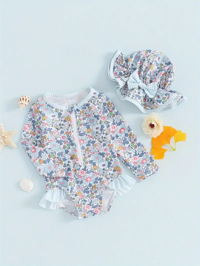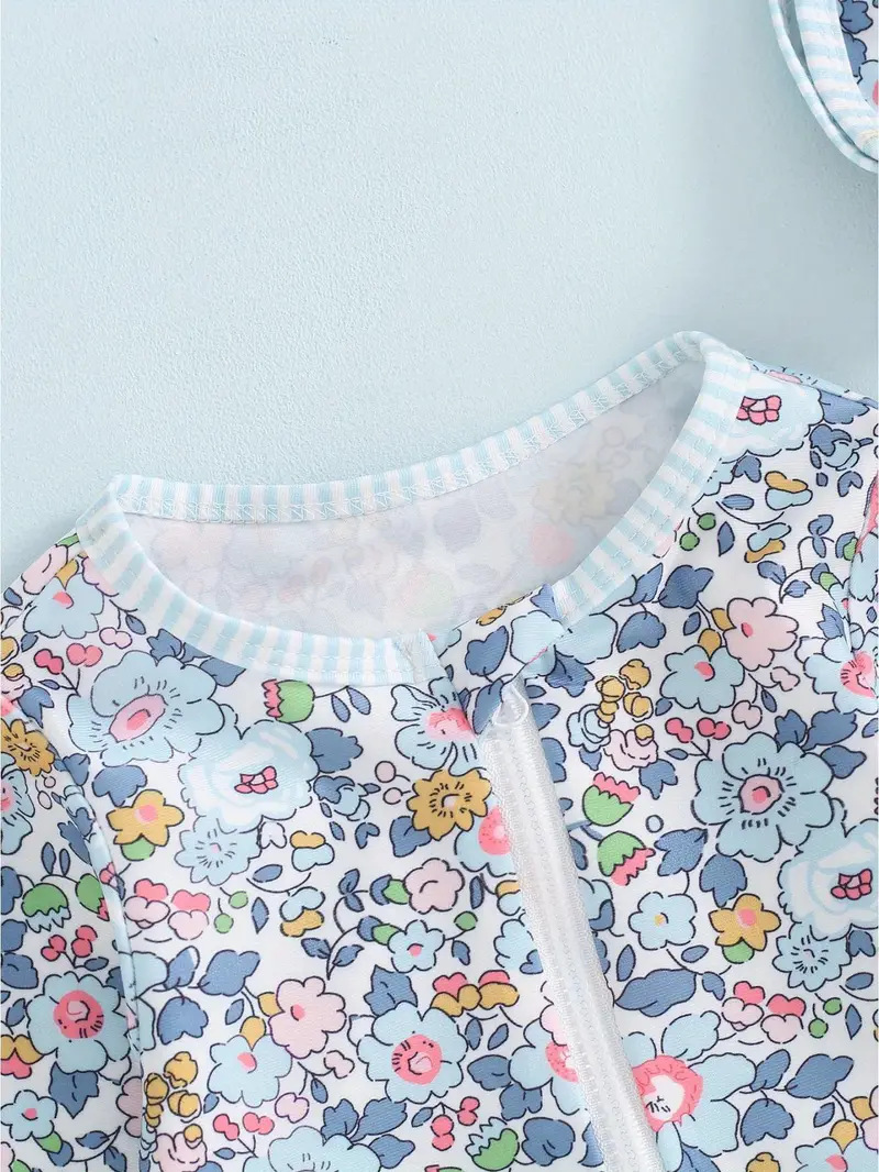 2025 새로운 소녀 Ins 우아한 원피스 수영복 여름 옷 어린이 꽃 선 스크린 빠른 건조 긴팔 수영복