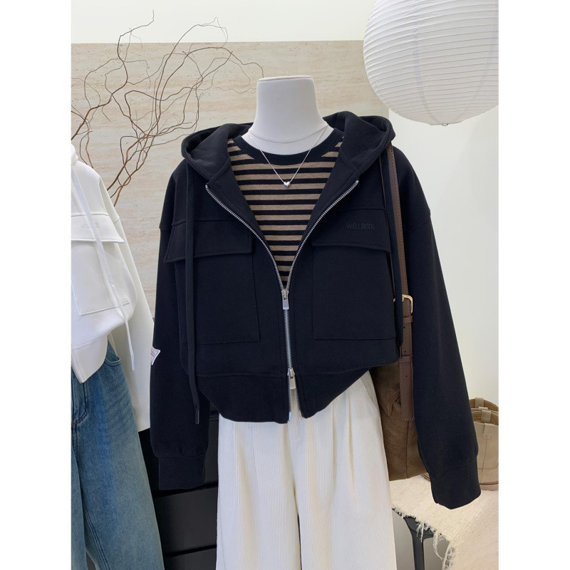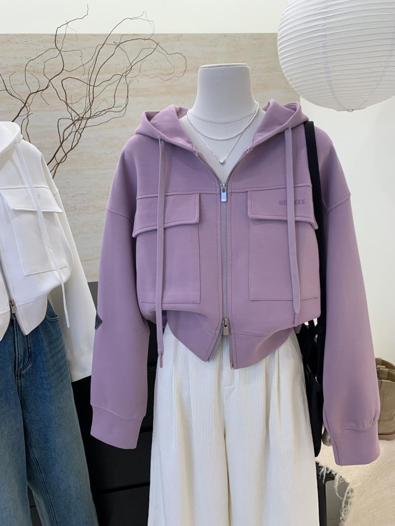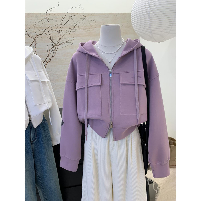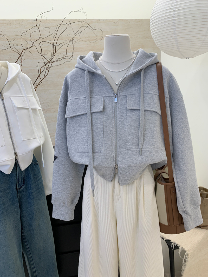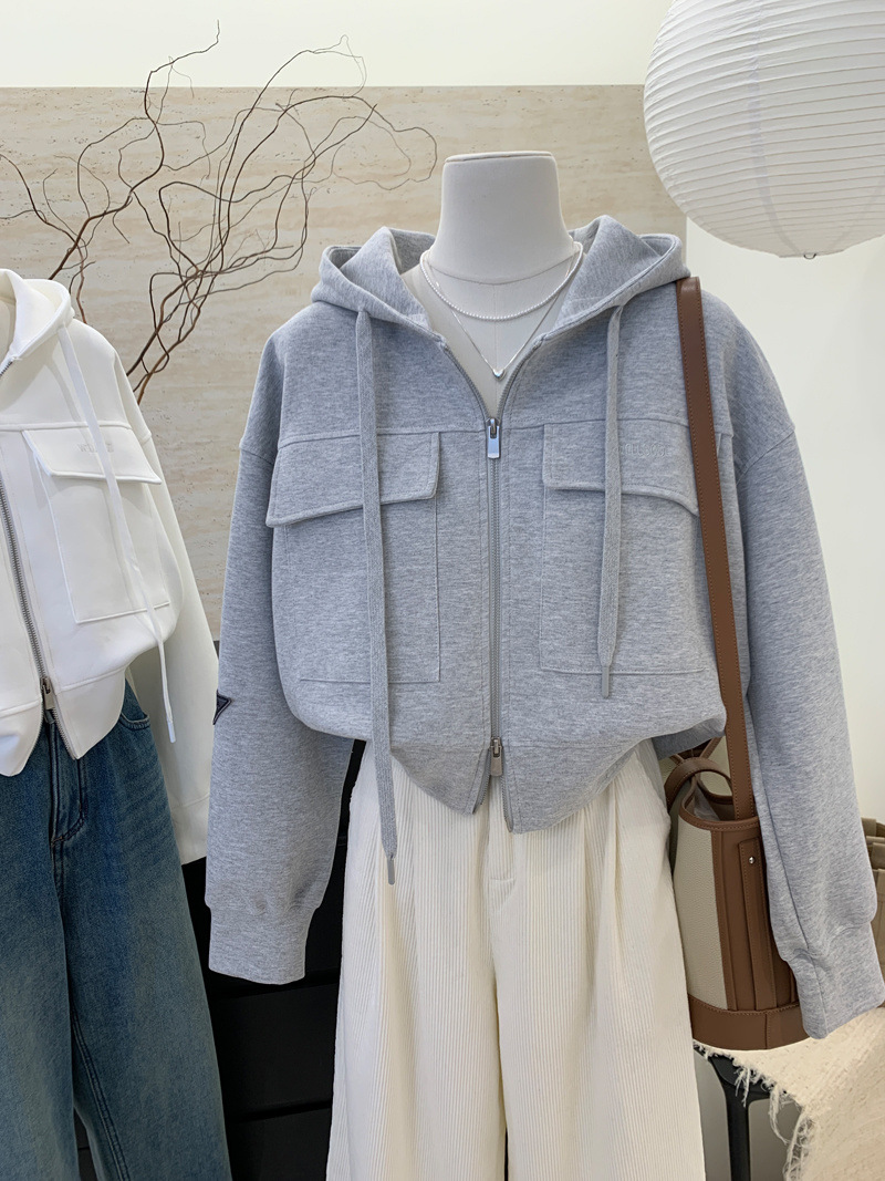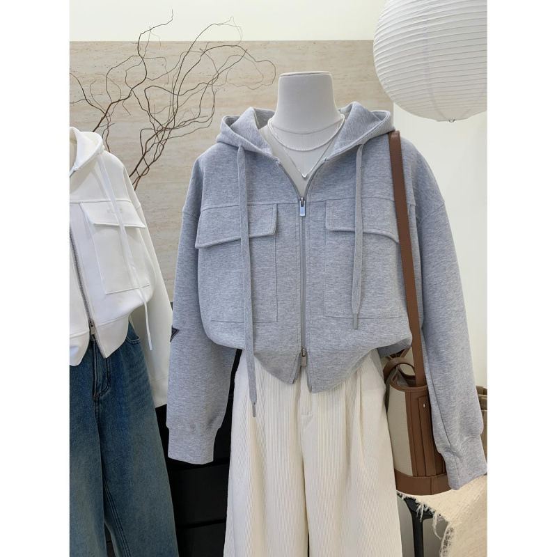 봄 새로운 하이 엔드 센스 루즈 캐주얼 올 매치 후드 지퍼 짧은 카디건 스웨터 재킷 여자 트렌디 탑
