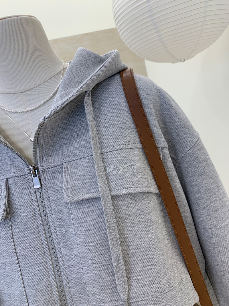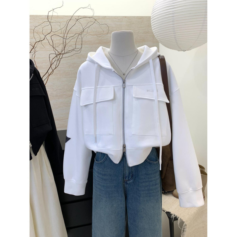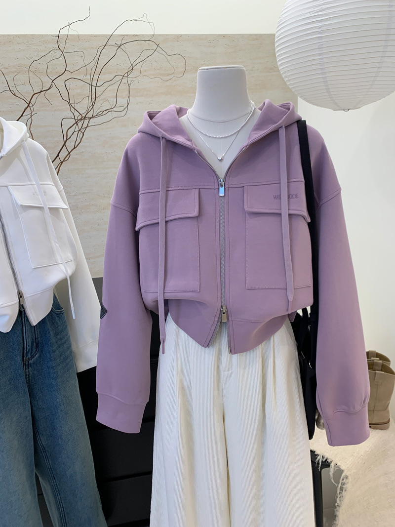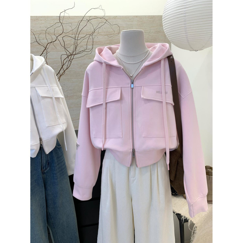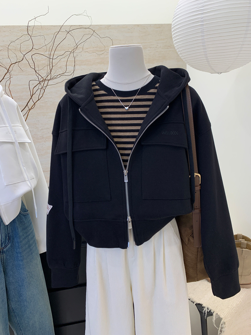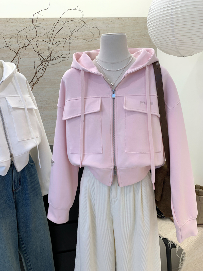 봄 새로운 하이 엔드 센스 루즈 캐주얼 올 매치 후드 지퍼 짧은 카디건 스웨터 재킷 여자 트렌디 탑