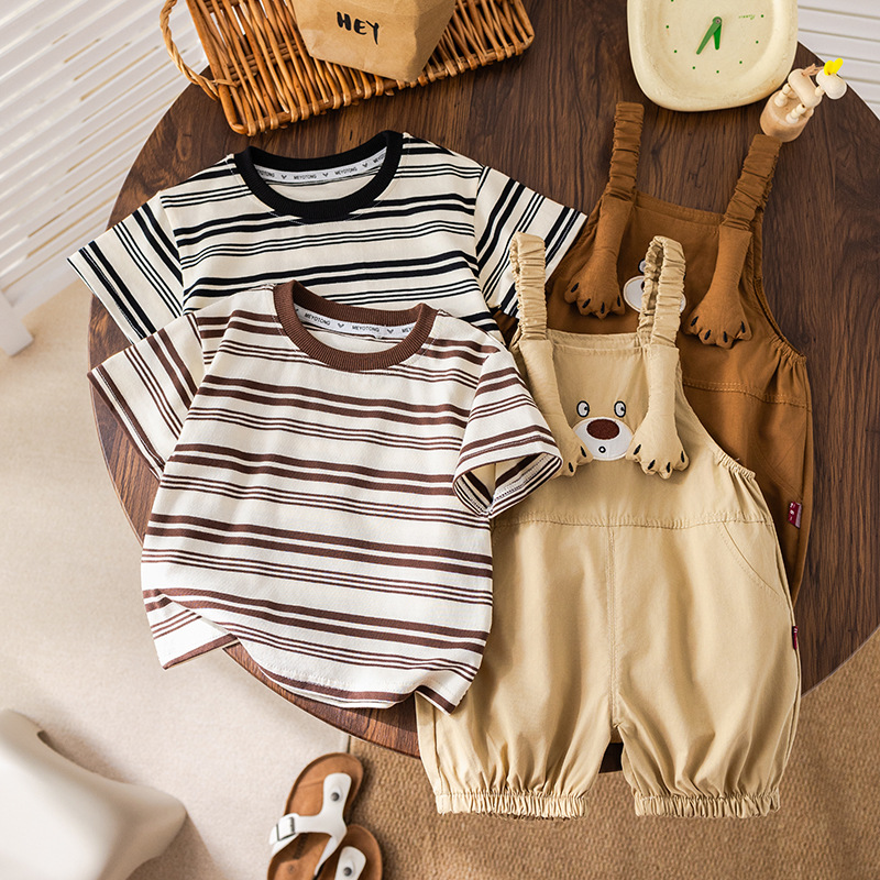 어린이 의류 소년 아기 여름 줄무늬 티셔츠 만화 멜빵 새 여름 어린이 반팔 세트스토어 가기