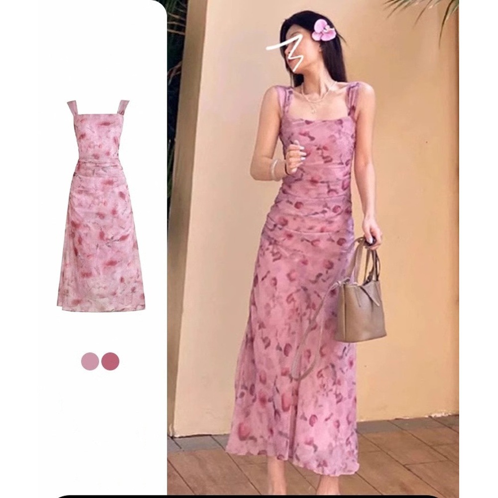 핑크 슬링 꽃 원피스 여자 여름 새로운 올 매치 요정 우아한 슬림 핏 슬리밍 허리 롱 스커트