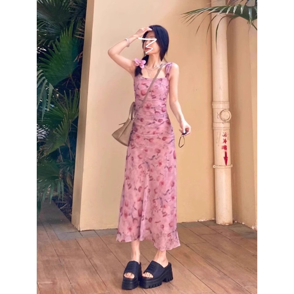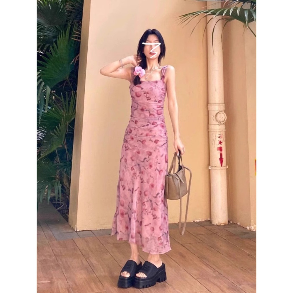 핑크 슬링 꽃 원피스 여자 여름 새로운 올 매치 요정 우아한 슬림 핏 슬리밍 허리 롱 스커트스토어 가기