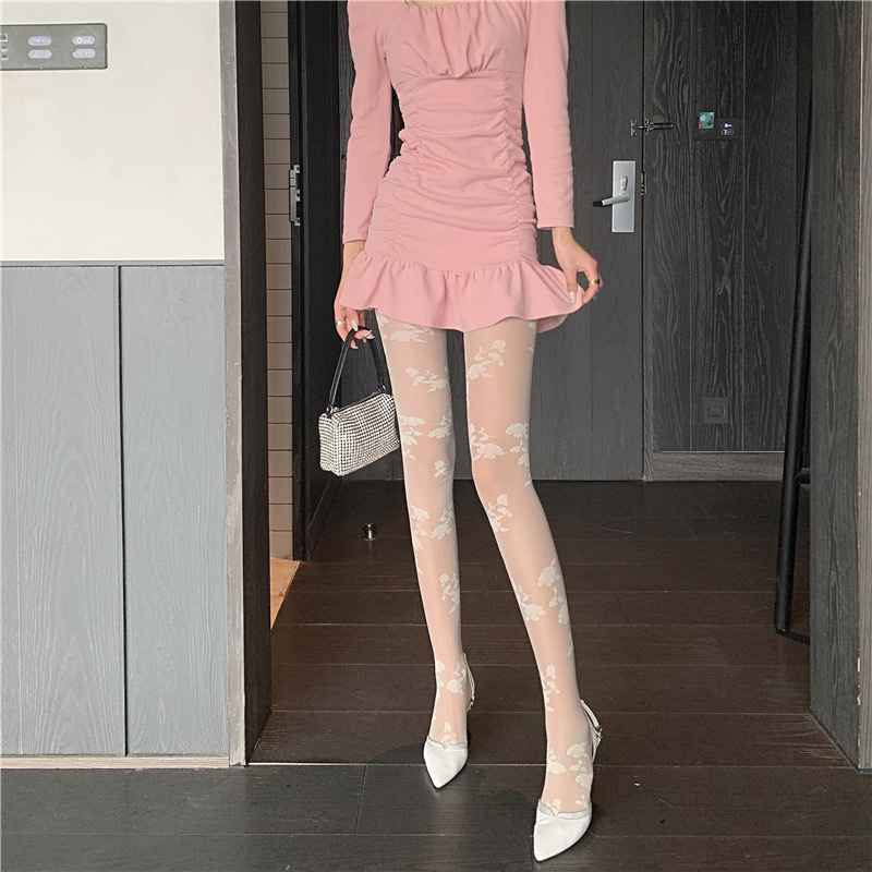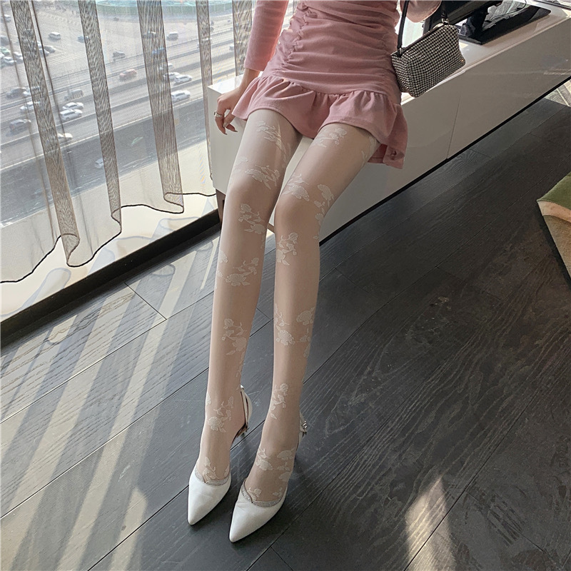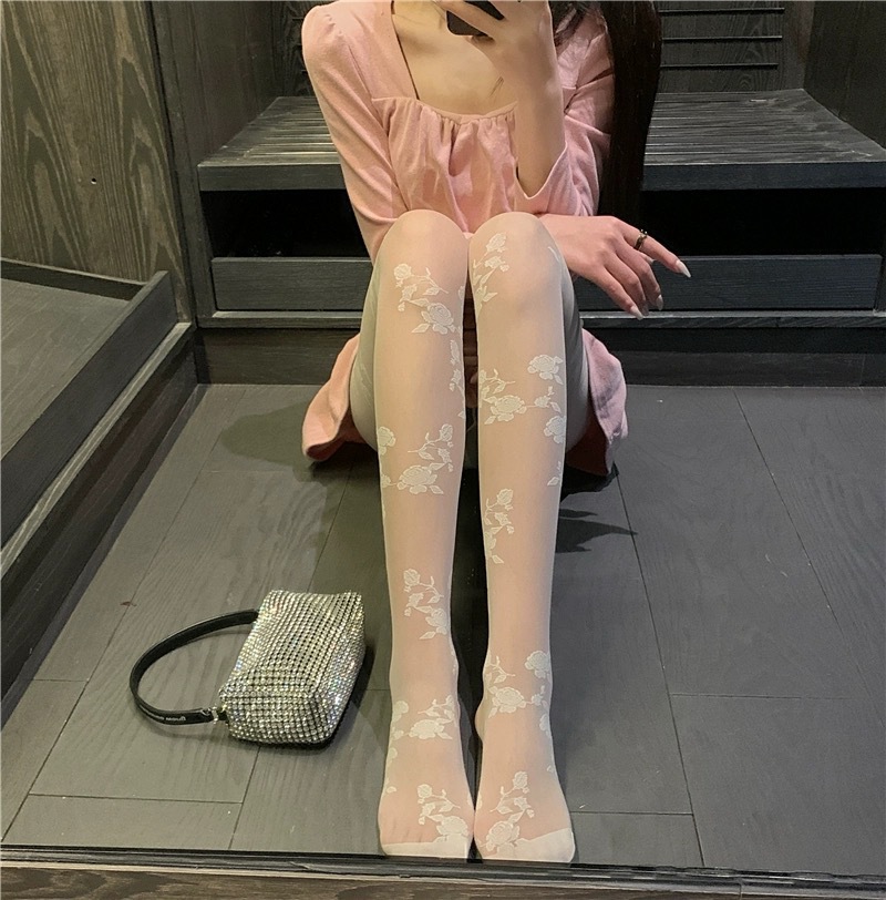 국경 간 프랑스 소녀 부드러운 바람 요정 뷰티 양말 화이트 레트로 로즈 자카드 안티 훅 실크 팬티 스타킹 여성
