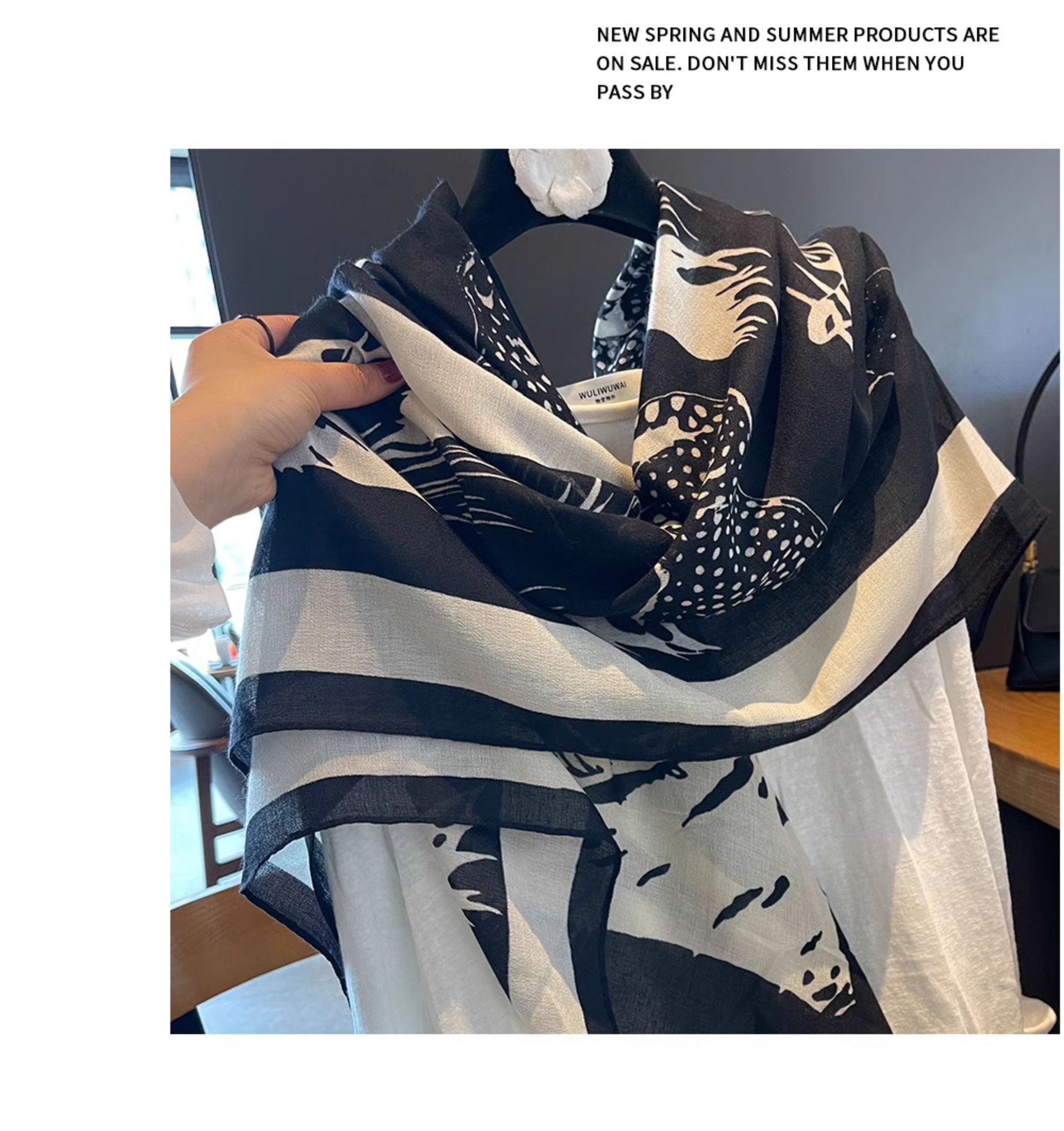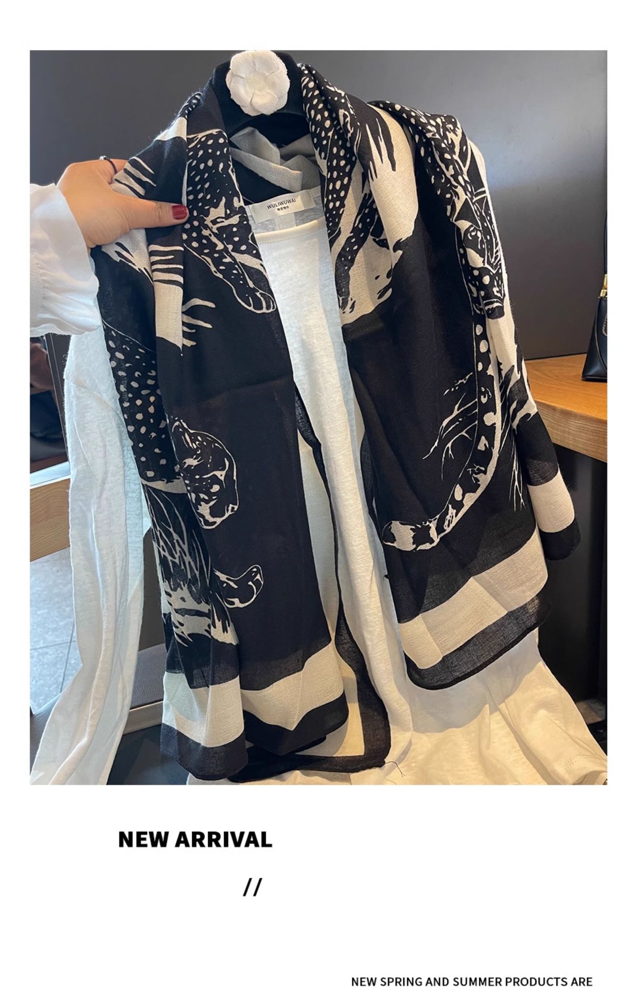 简约黑白豹子亚麻手感大方巾女士春夏季旅游拍照外搭披肩围巾两用