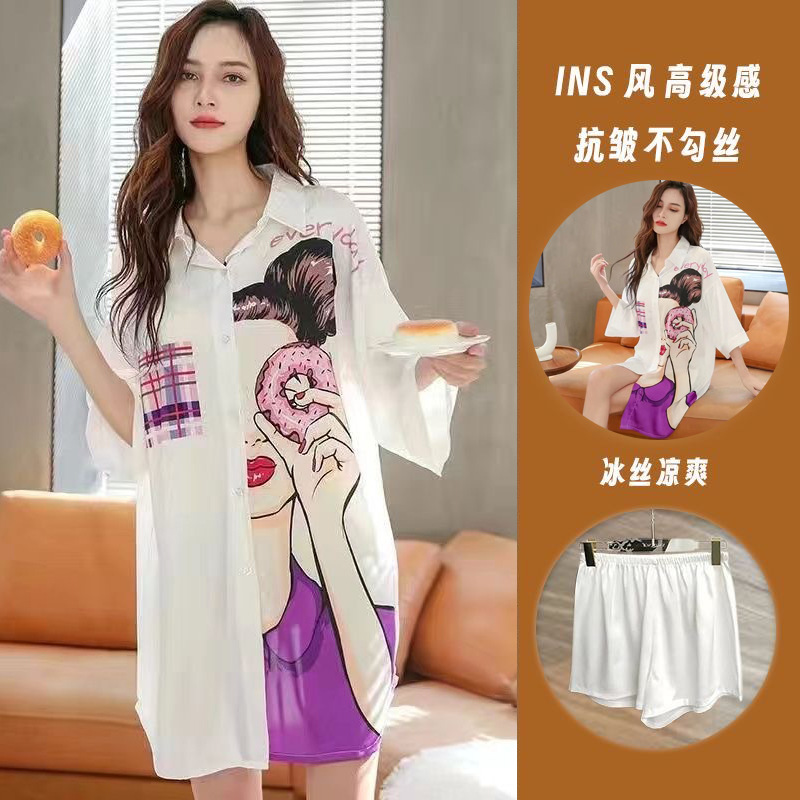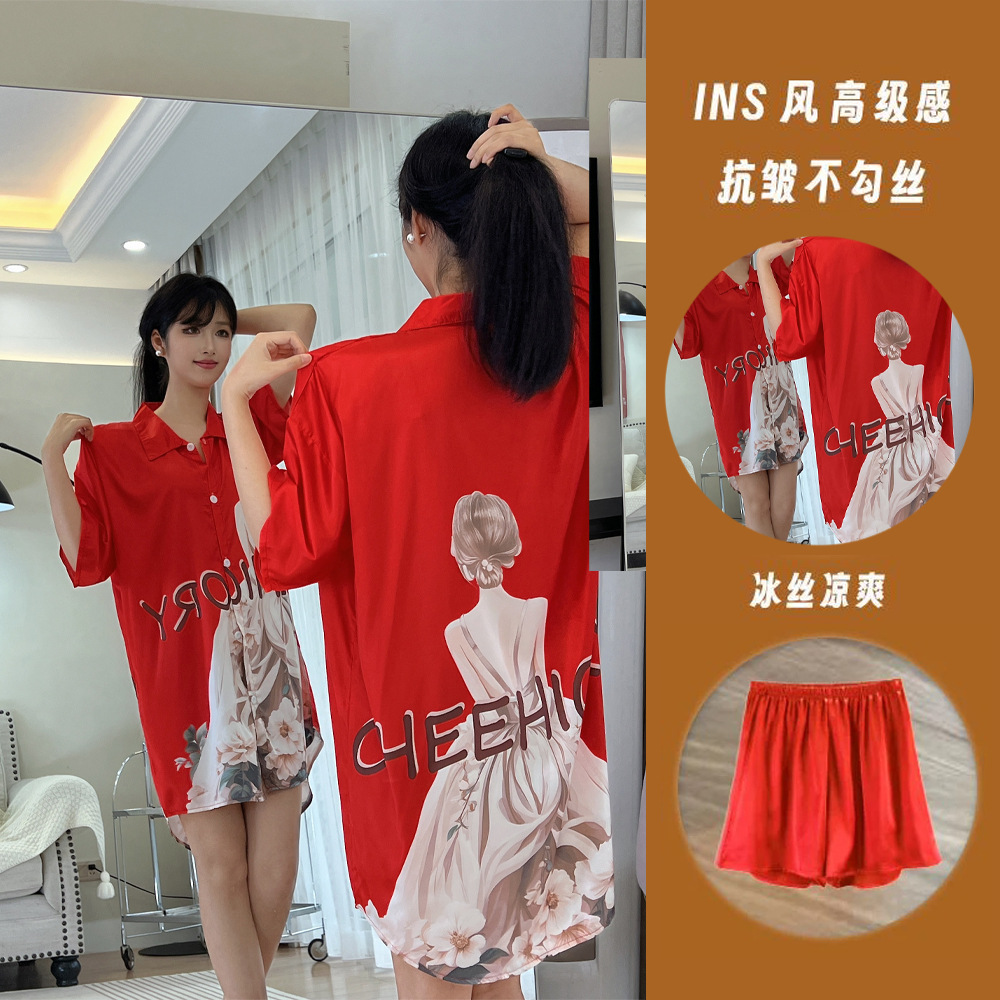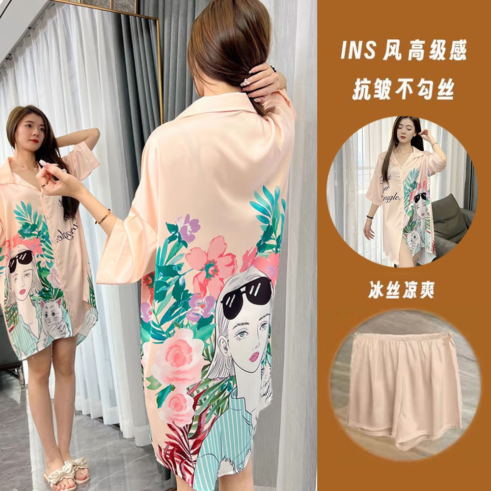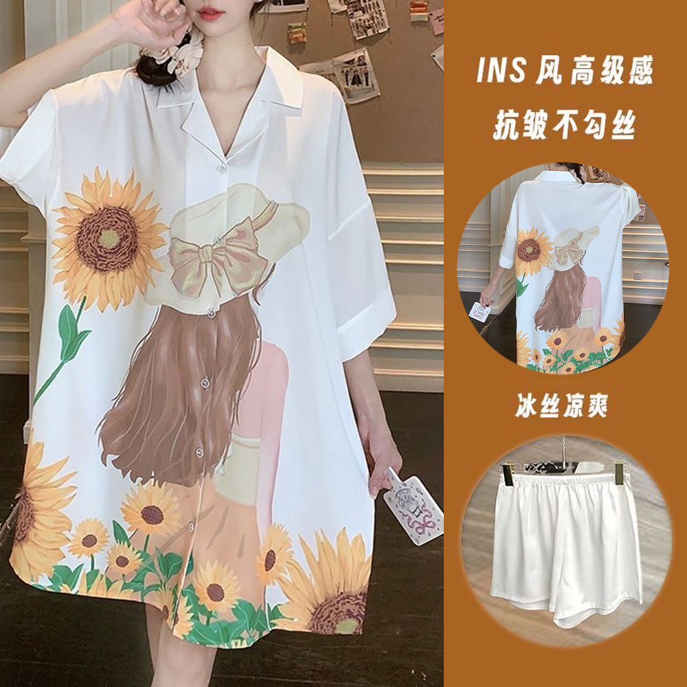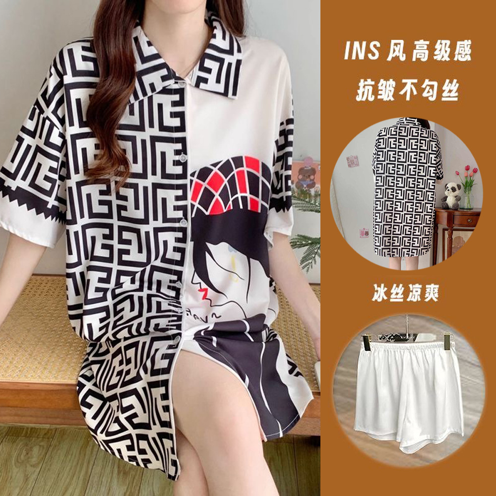 여름 셔츠 잠옷 섹시한 아이스 실크 반팔 잠옷 여성의 인쇄 달콤한 만화 느슨한 얇은 홈 의류 세트