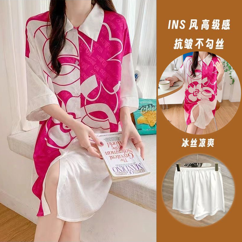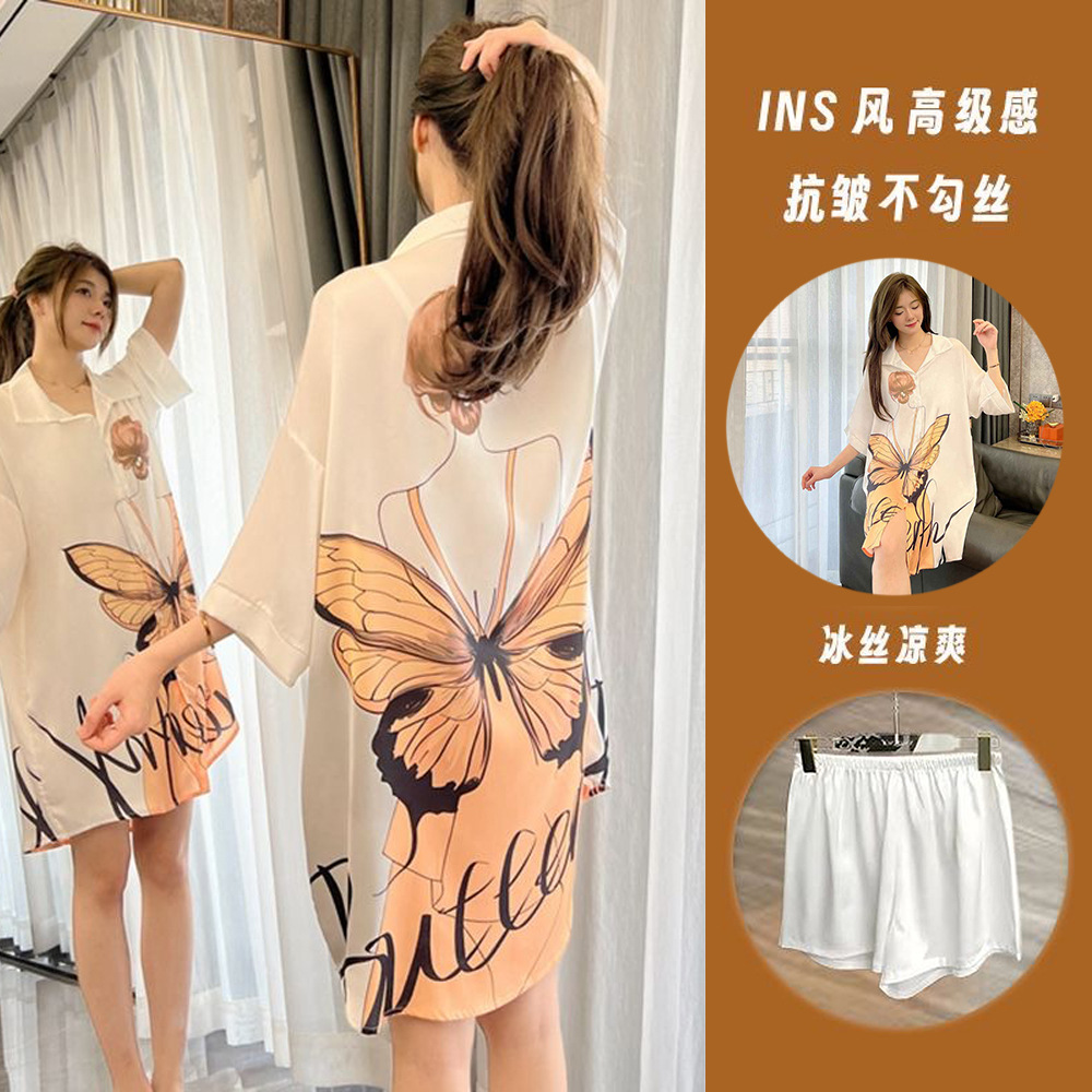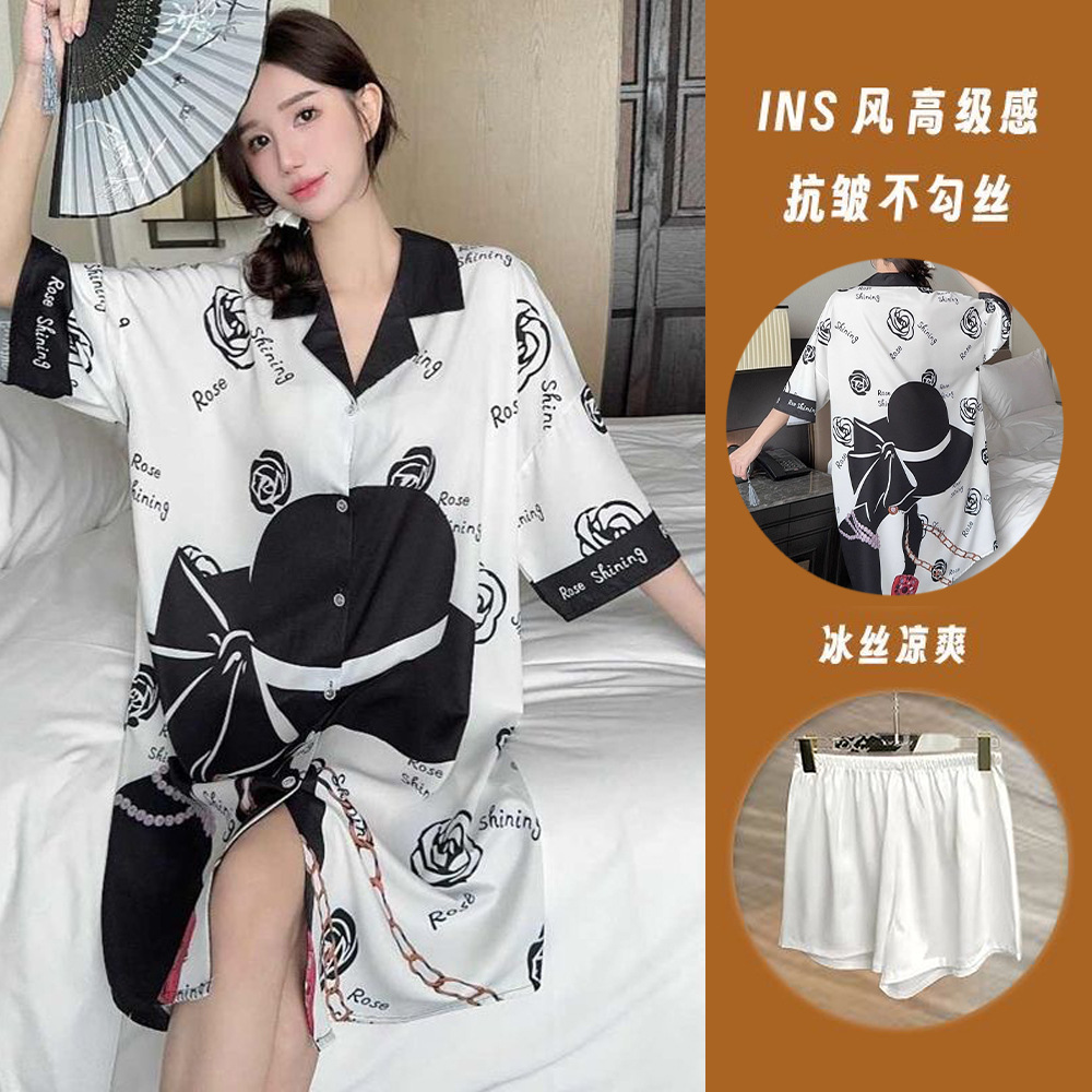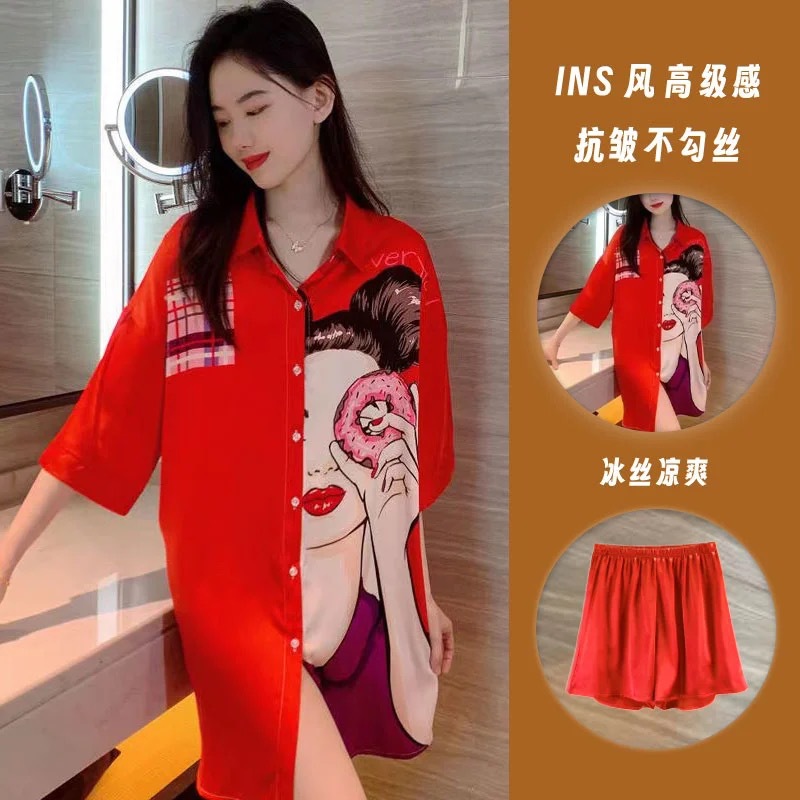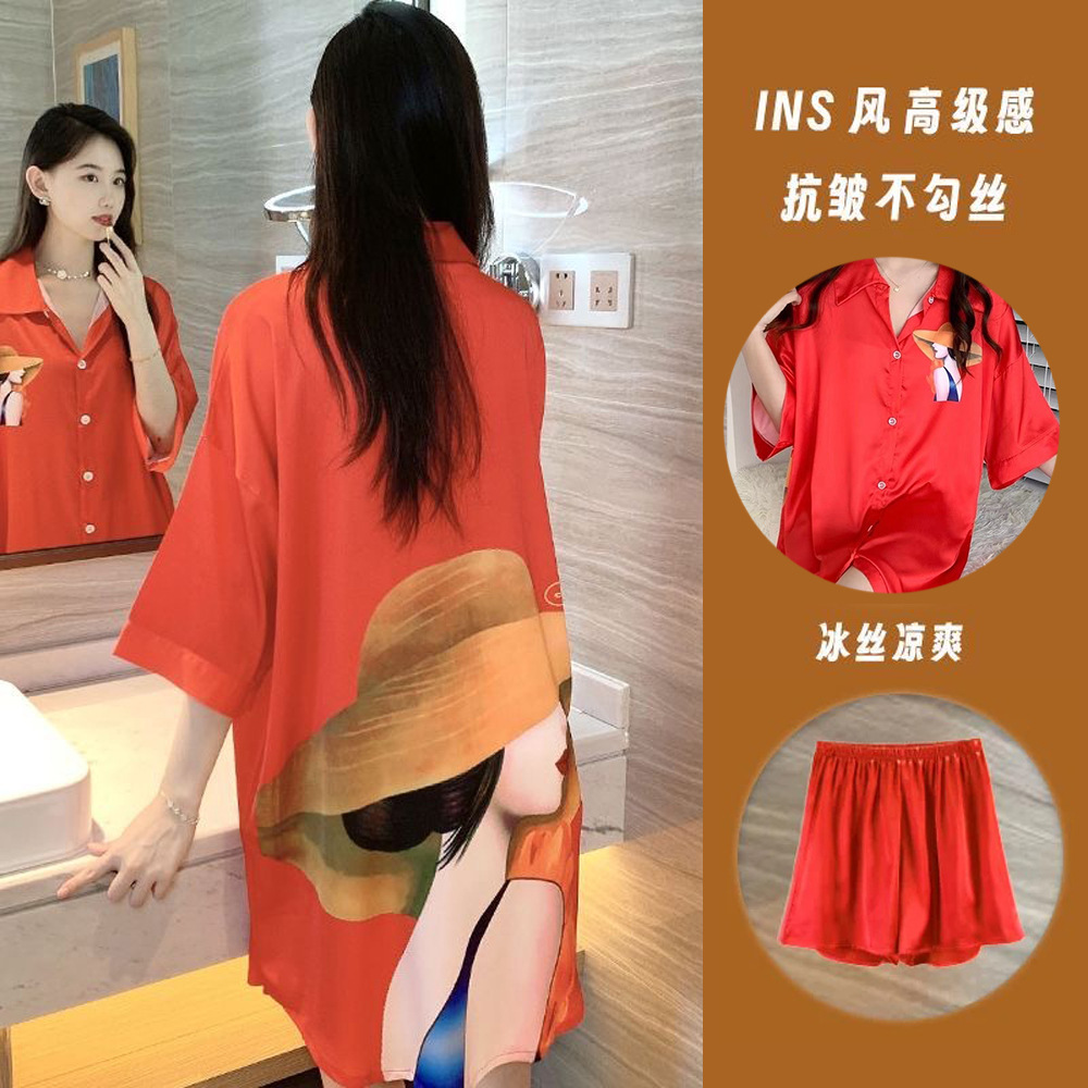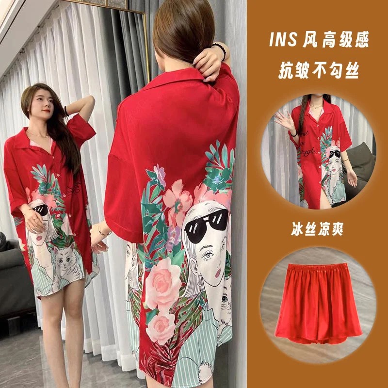 여름 셔츠 잠옷 섹시한 아이스 실크 반팔 잠옷 여성의 인쇄 달콤한 만화 느슨한 얇은 홈 의류 세트
