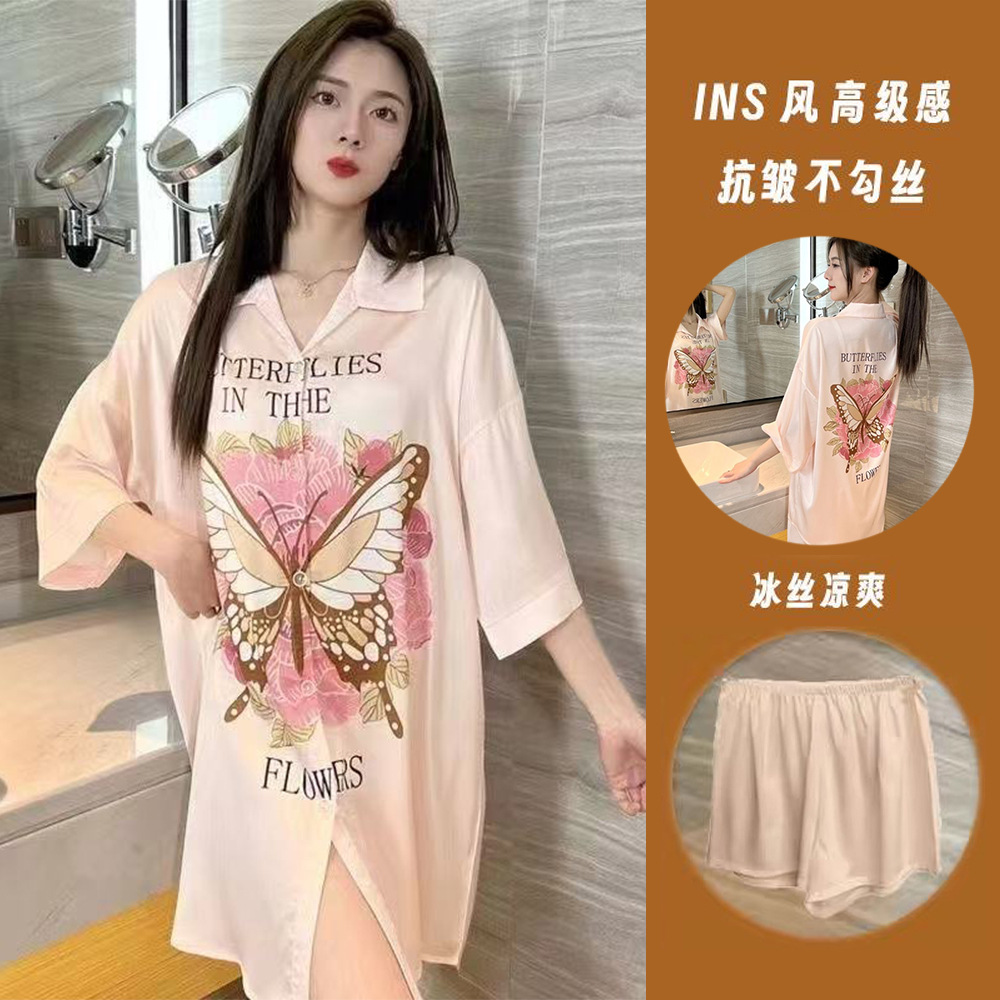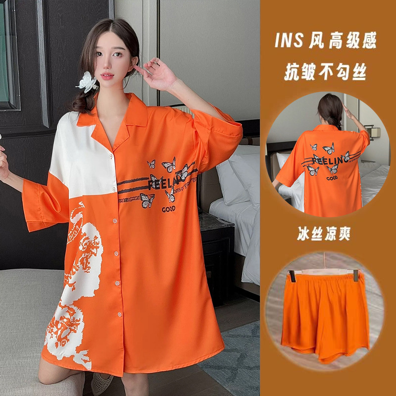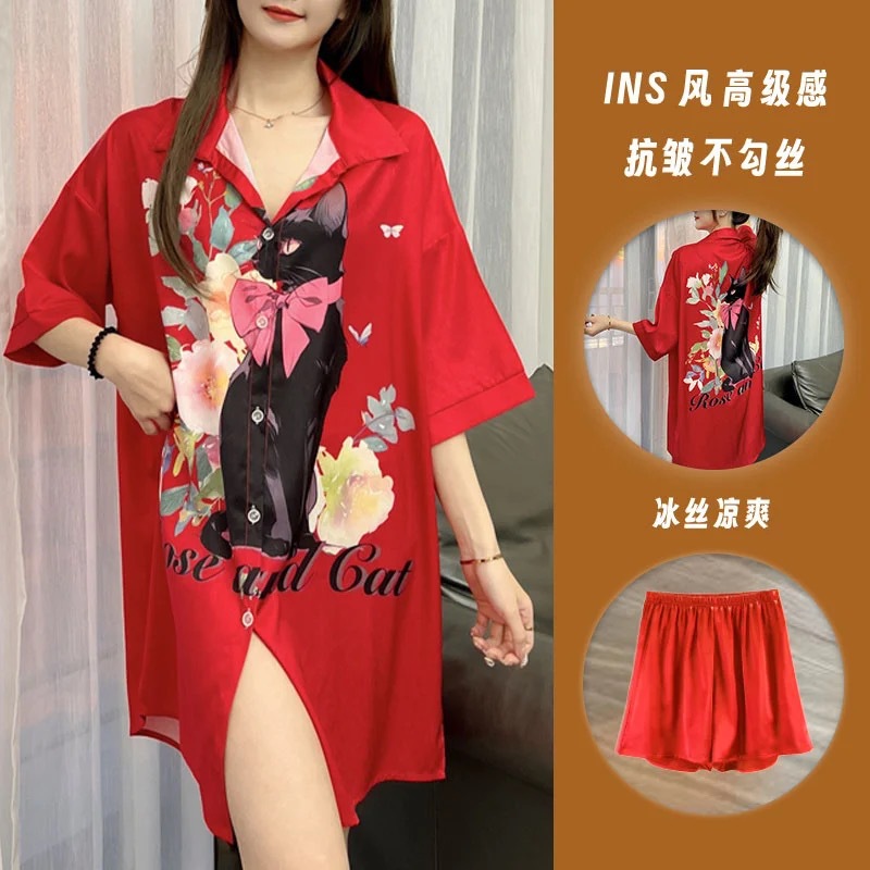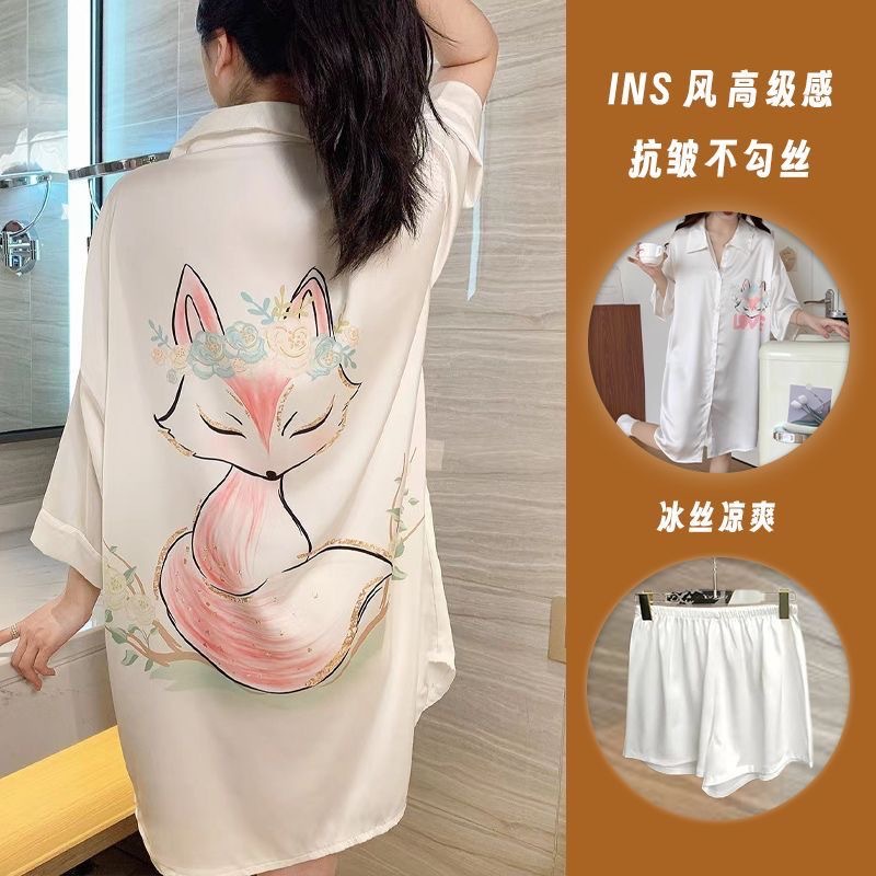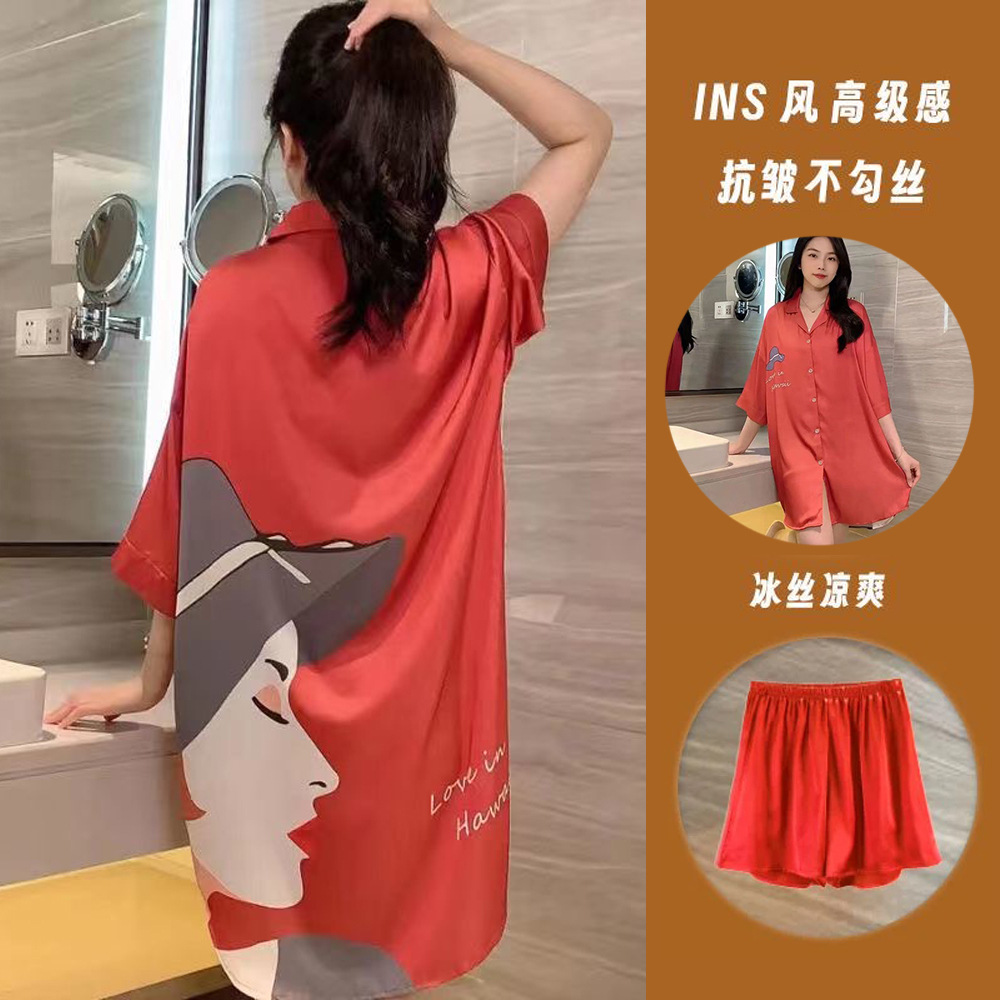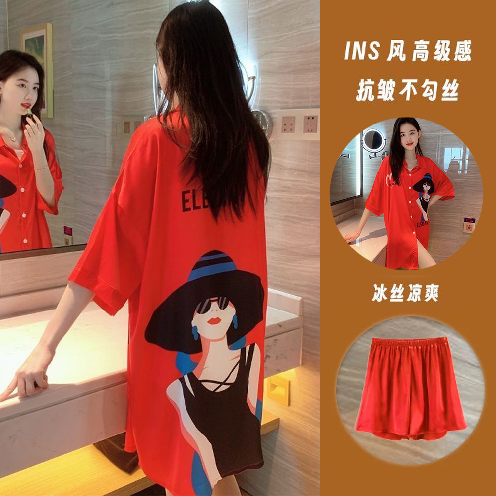 여름 셔츠 잠옷 섹시한 아이스 실크 반팔 잠옷 여성의 인쇄 달콤한 만화 느슨한 얇은 홈 의류 세트