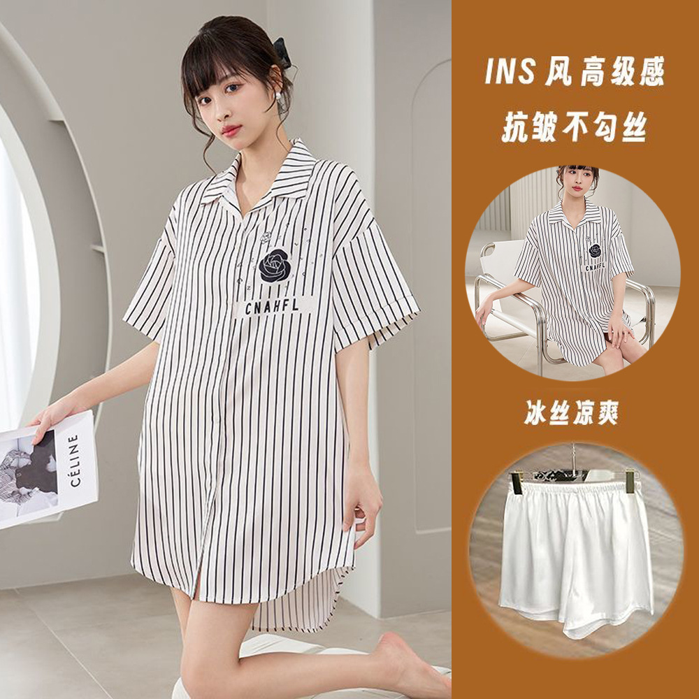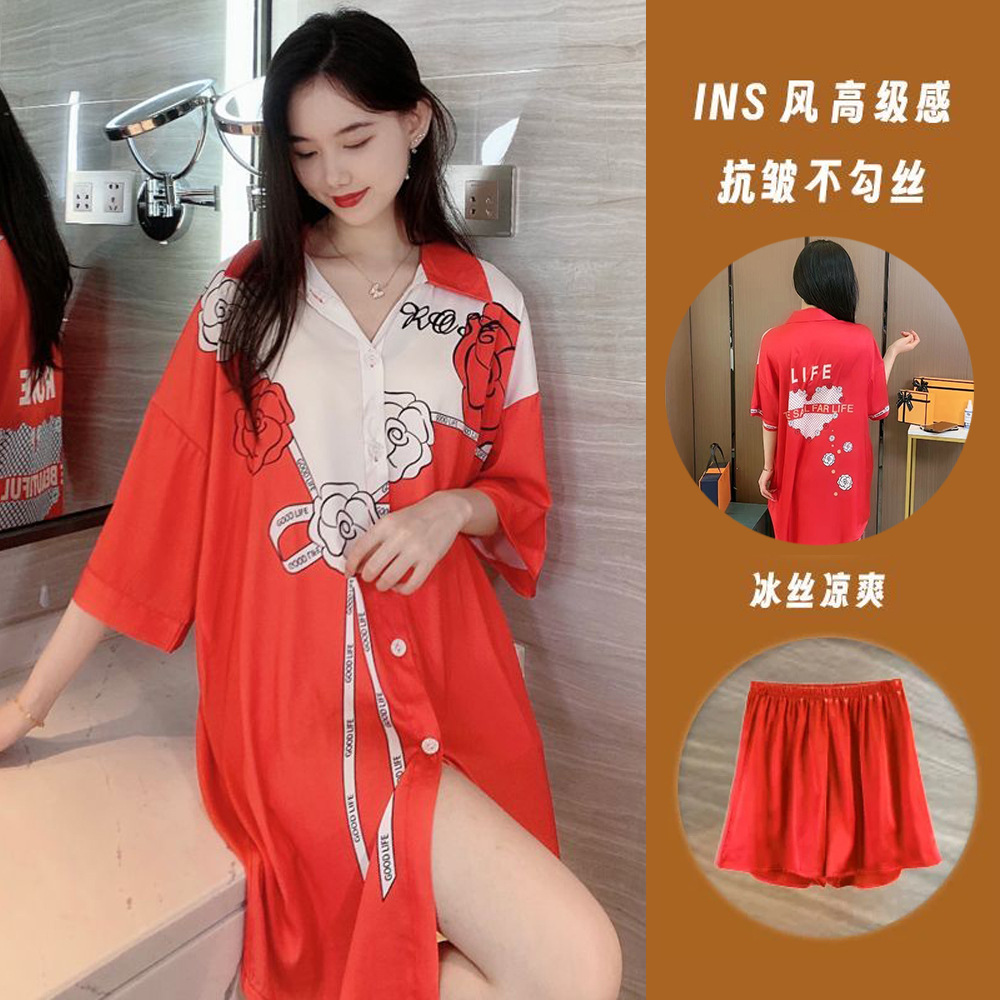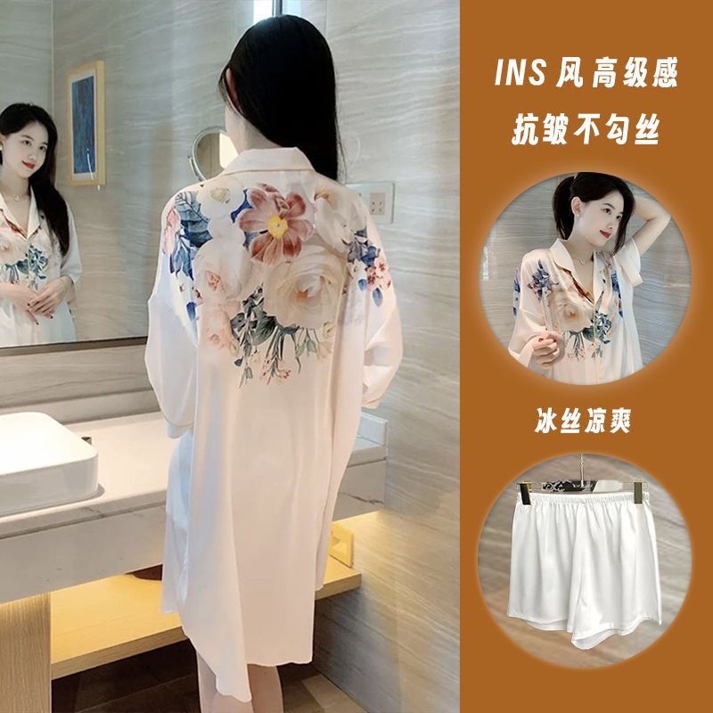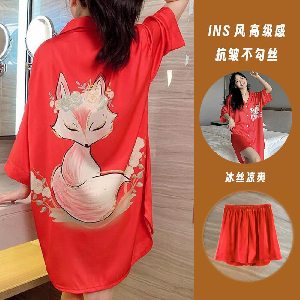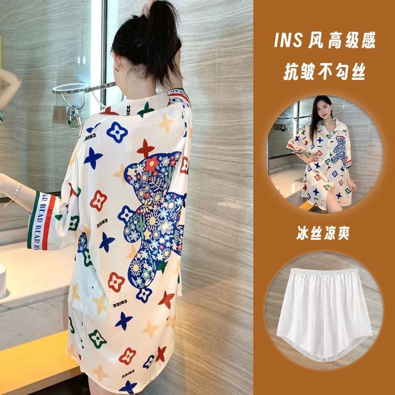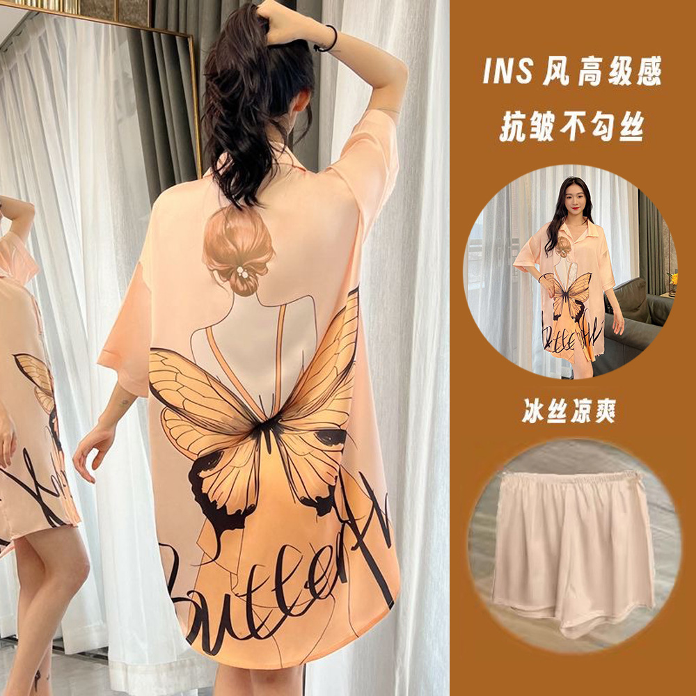 여름 셔츠 잠옷 섹시한 아이스 실크 반팔 잠옷 여성의 인쇄 달콤한 만화 느슨한 얇은 홈 의류 세트