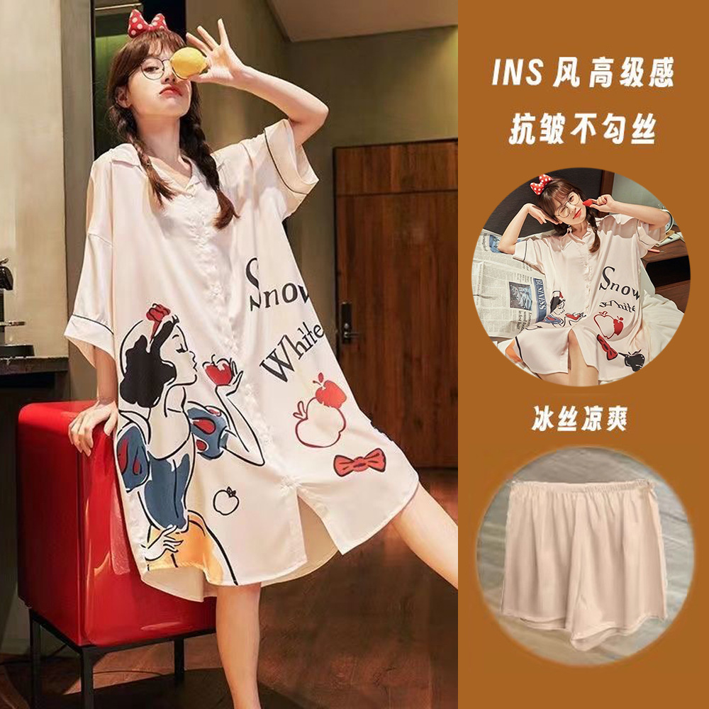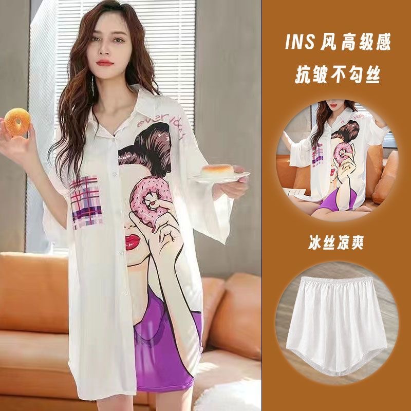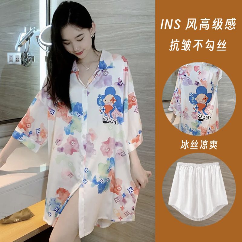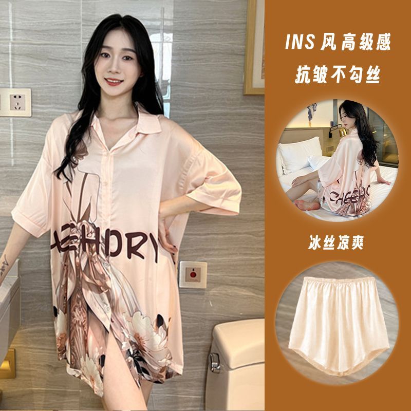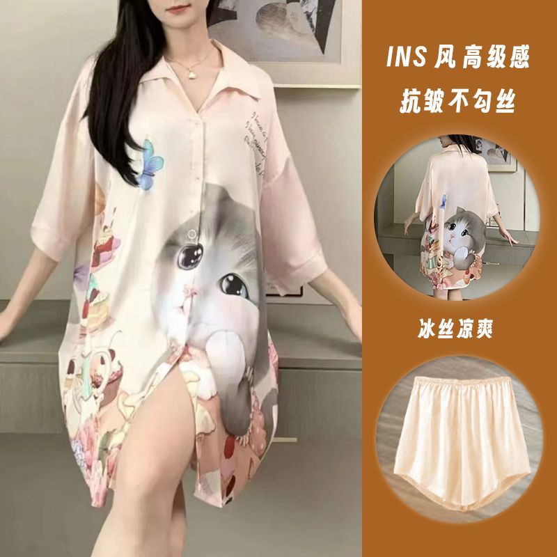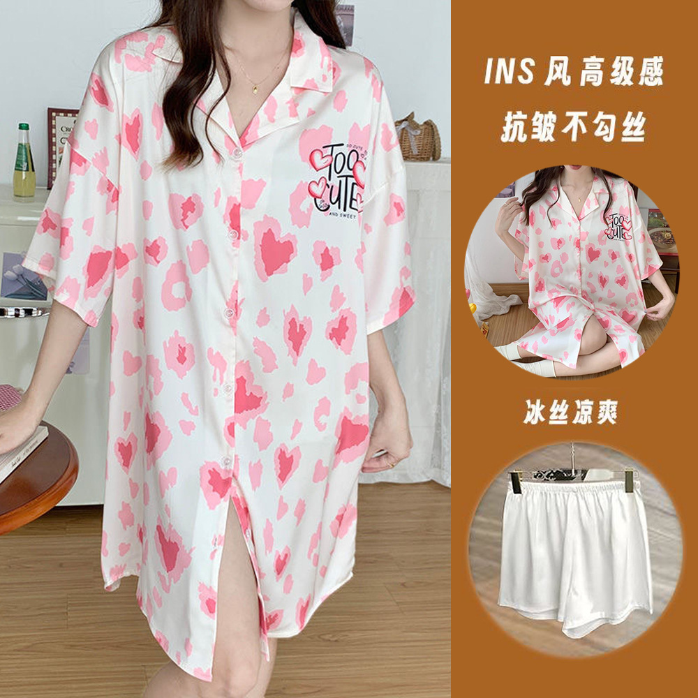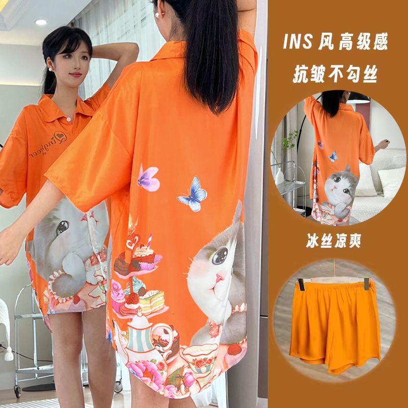 여름 셔츠 잠옷 섹시한 아이스 실크 반팔 잠옷 여성의 인쇄 달콤한 만화 느슨한 얇은 홈 의류 세트스토어 가기