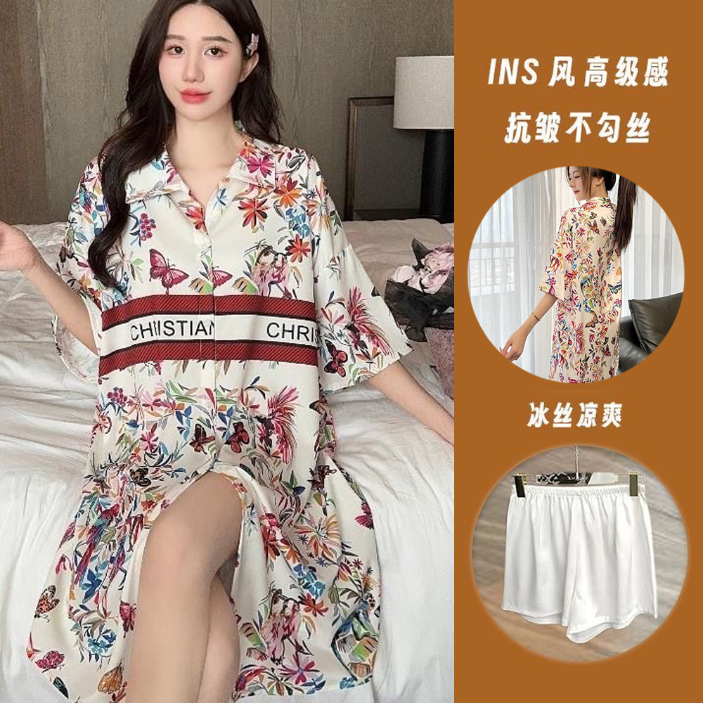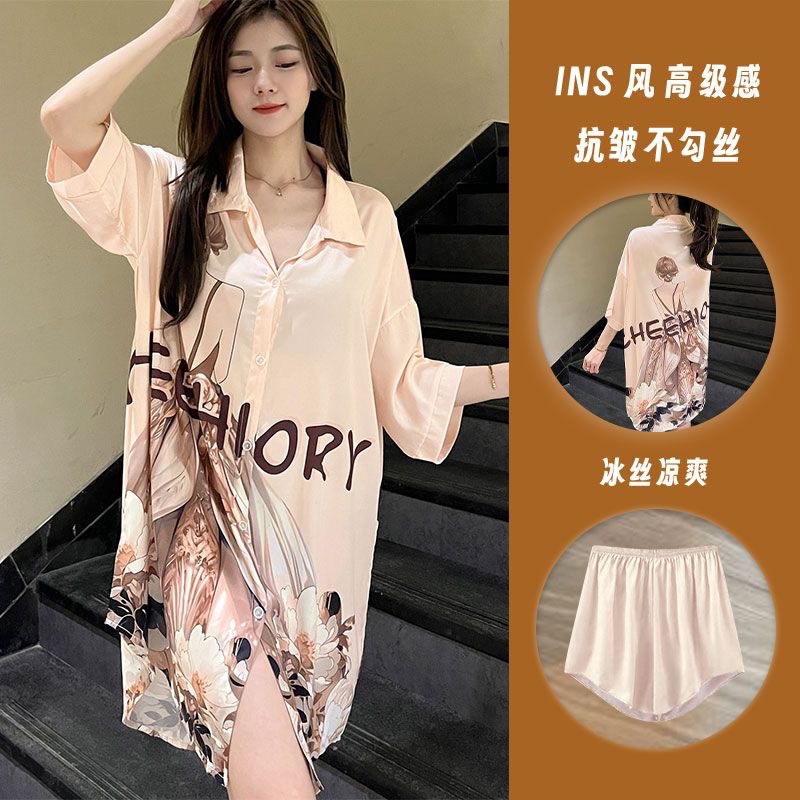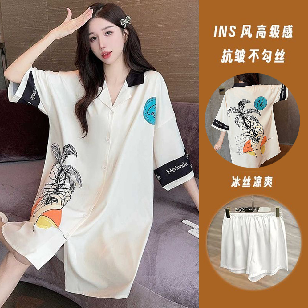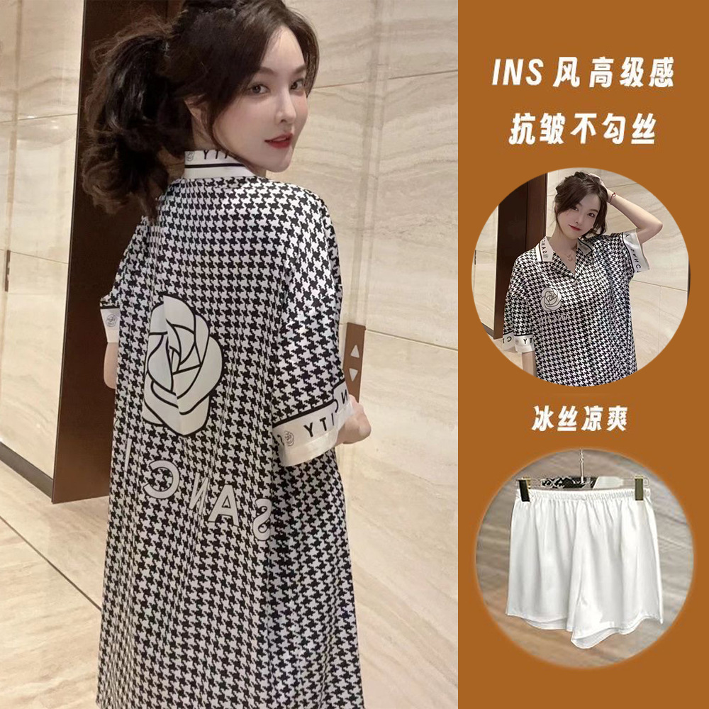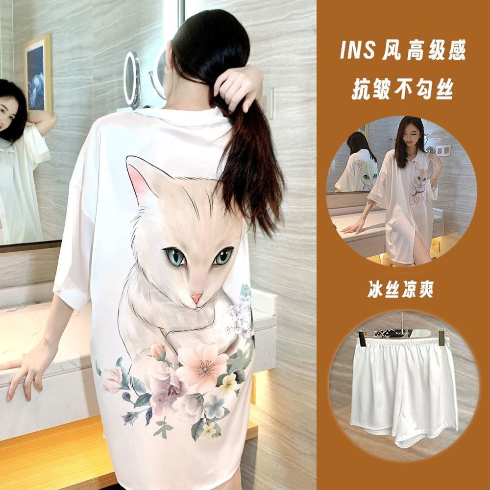여름 셔츠 잠옷 섹시한 아이스 실크 반팔 잠옷 여성의 인쇄 달콤한 만화 느슨한 얇은 홈 의류 세트스토어 가기