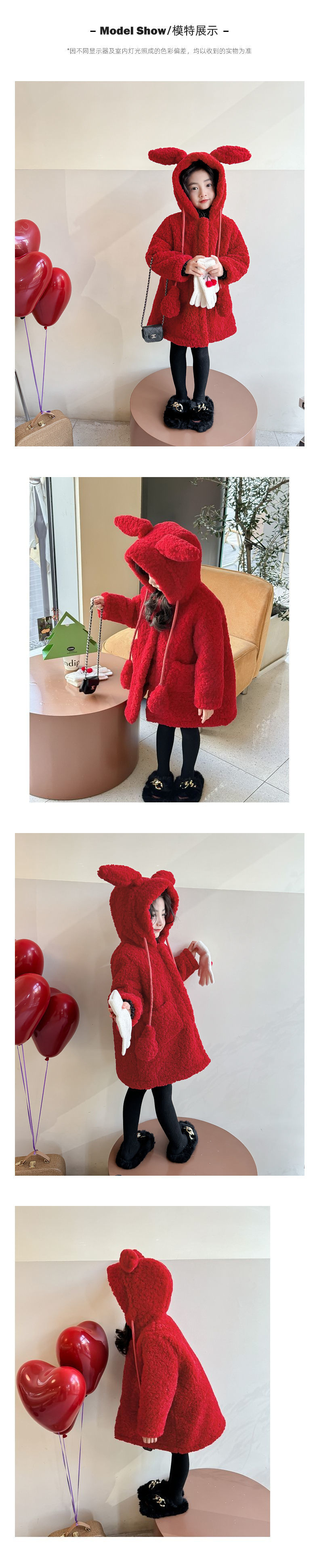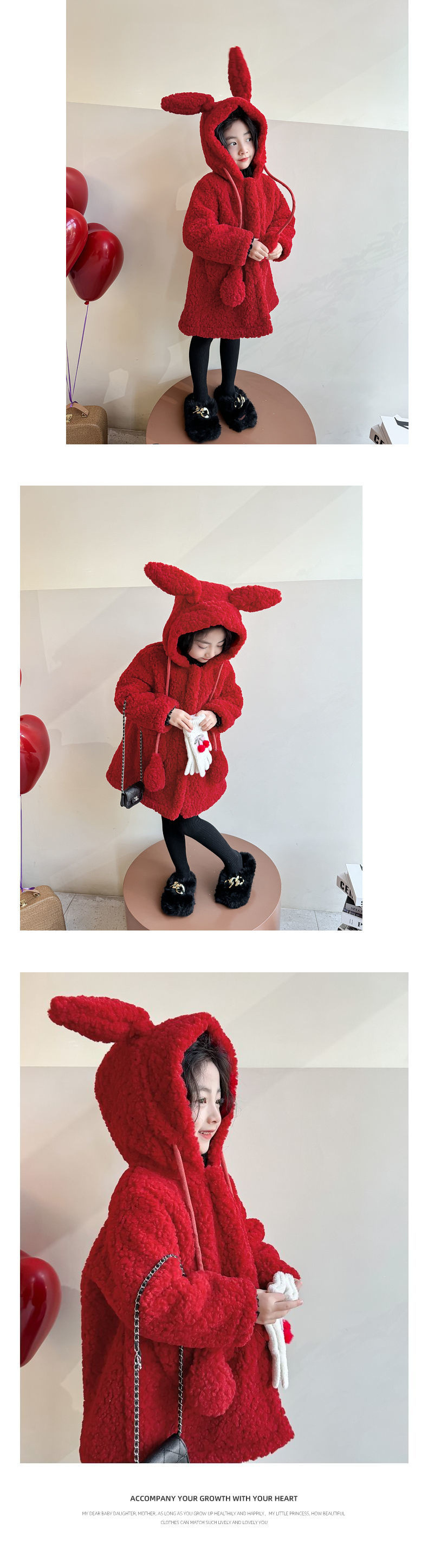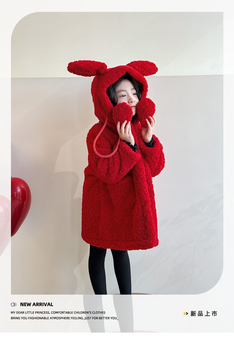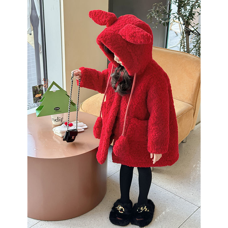 소녀 코트 토끼 귀 2025 새로운 어린이 겨울 두꺼운 새해 의류 양고기 벨벳 붉은 새해 옷스토어 가기
