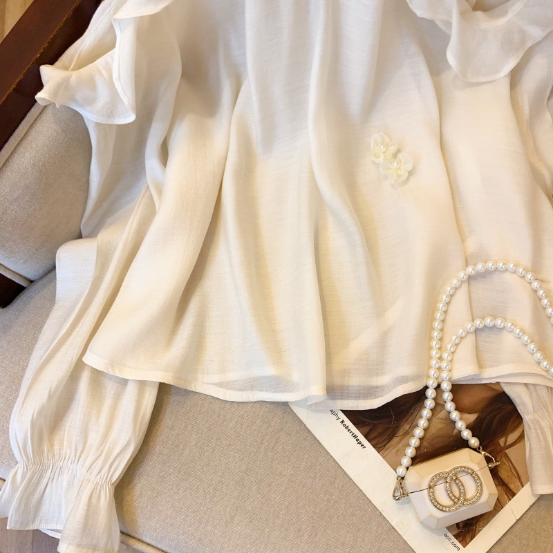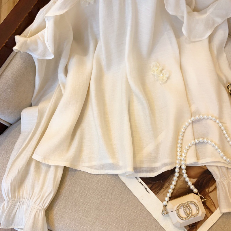 보라색 주름진 어깨 목 셔츠 여성용 2025 봄 새로운 긴 소매 3 차원 꽃 쉬폰 셔츠 탑스토어 가기