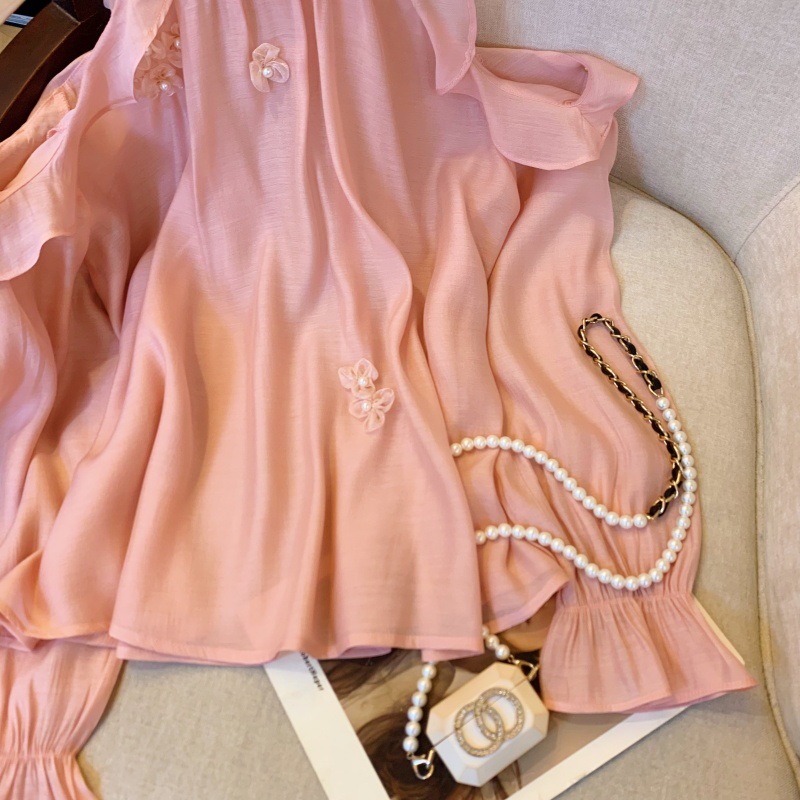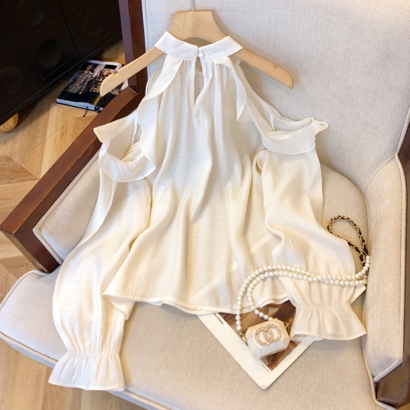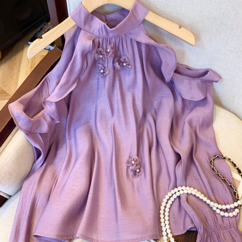 上实拍~紫色荷叶边露肩挂脖衬衫春季款长袖立体花朵雪纺衫