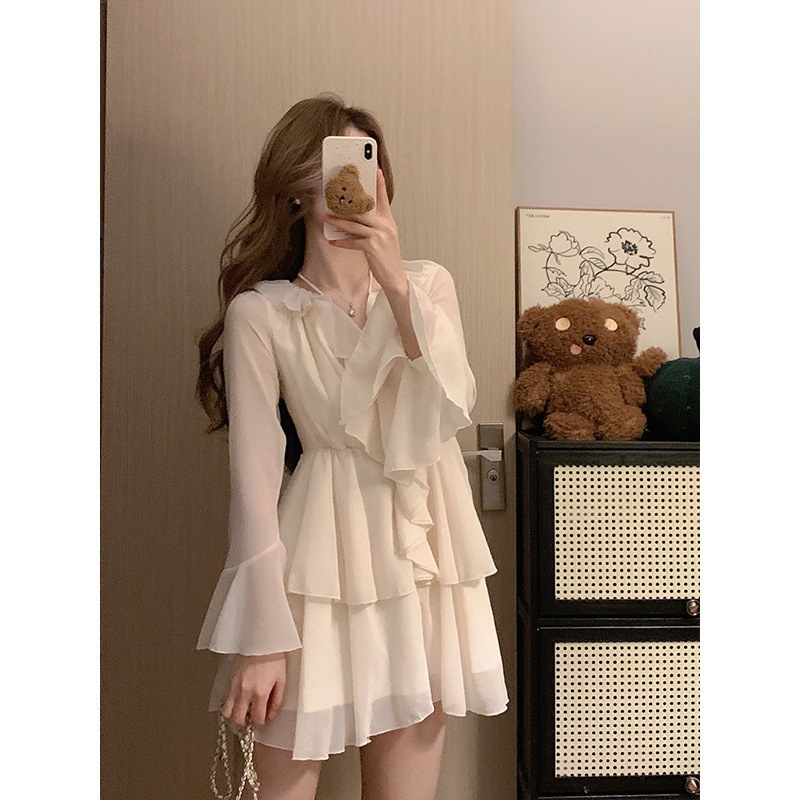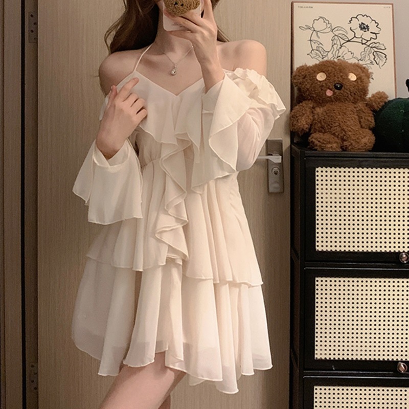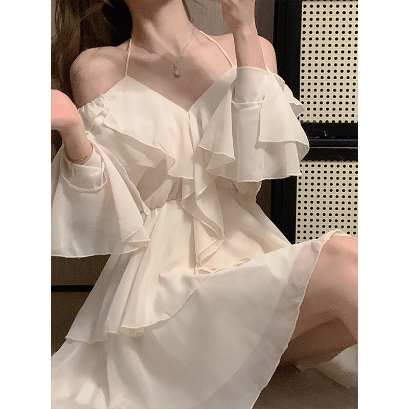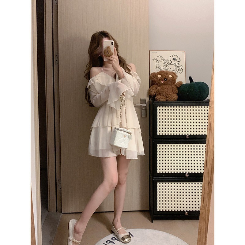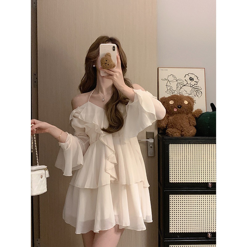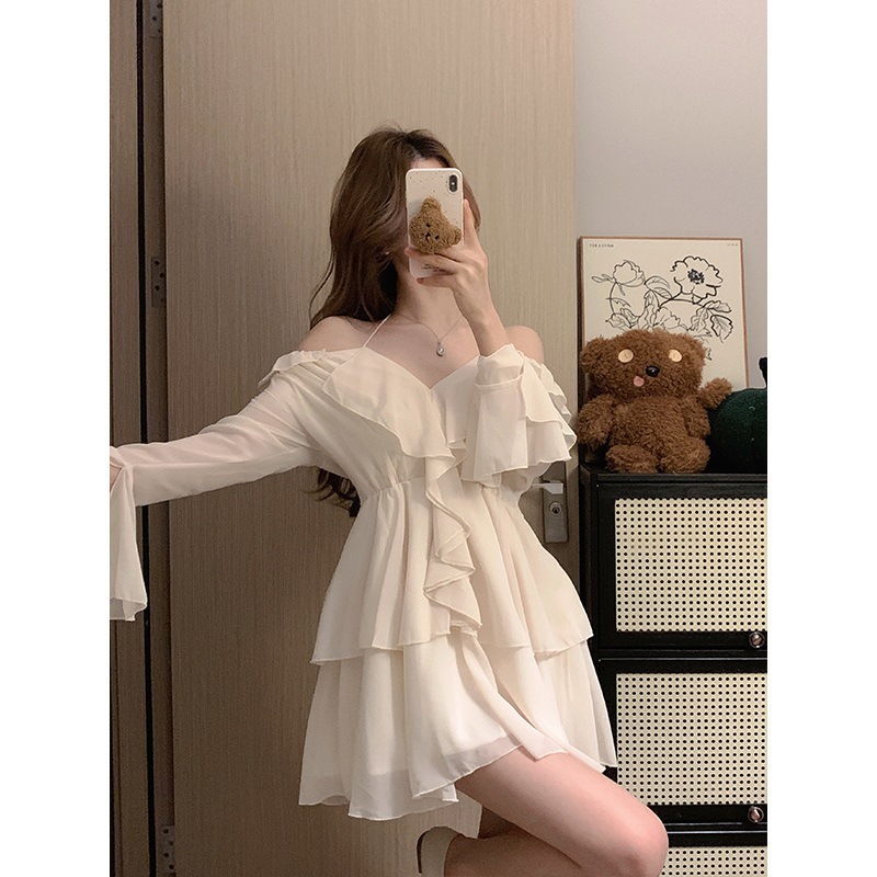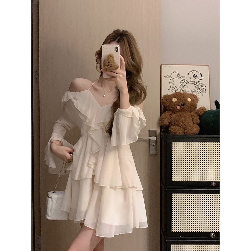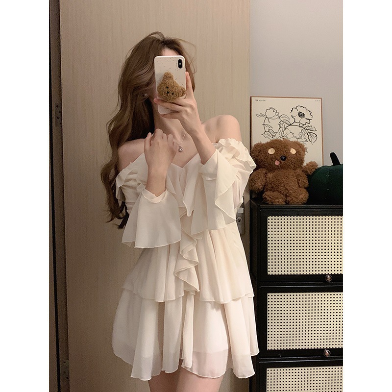 통통한 mm2024 여성의 가을과 겨울 새로운 프랑스 스타일 섹시한 오프 숄더 넥 러플 시폰 화이트 원피스스토어 가기