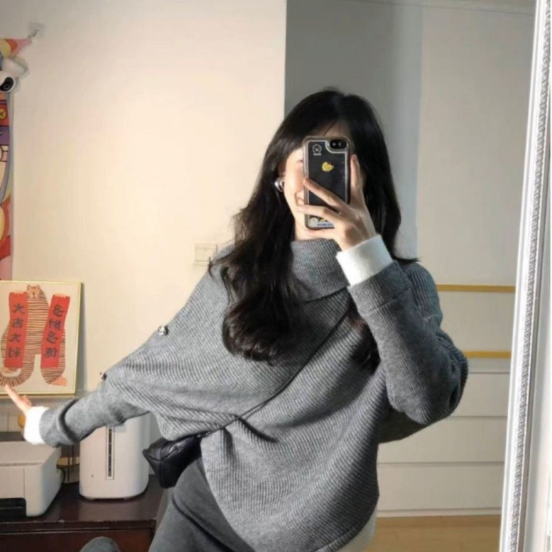 두 조각/세트 한국식 하이 엔드 센스 디자인 센스 니트 불규칙한 높은 목 긴 소매 스웨터 여성의 타이트 허리 스커트스토어 가기