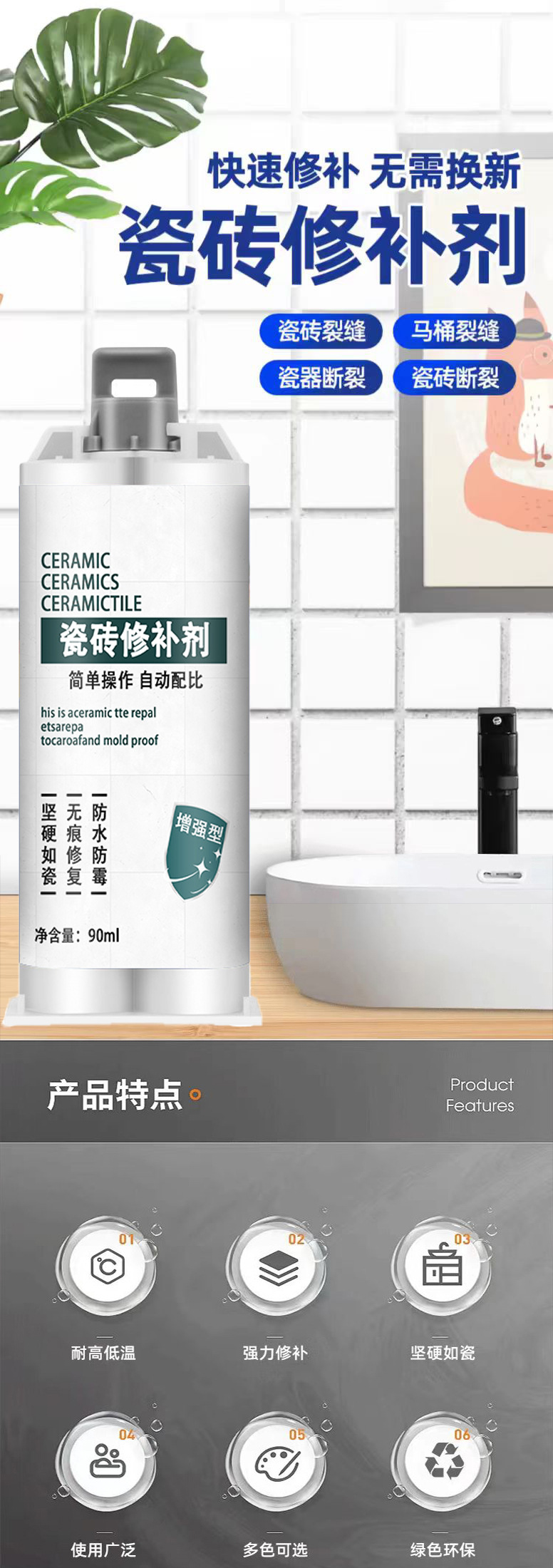 흰색 타일 수리 접착제 세면기 화장실 세라믹 대리석 균열 접착제 유약 흰색 타일 특수 수리스토어 가기