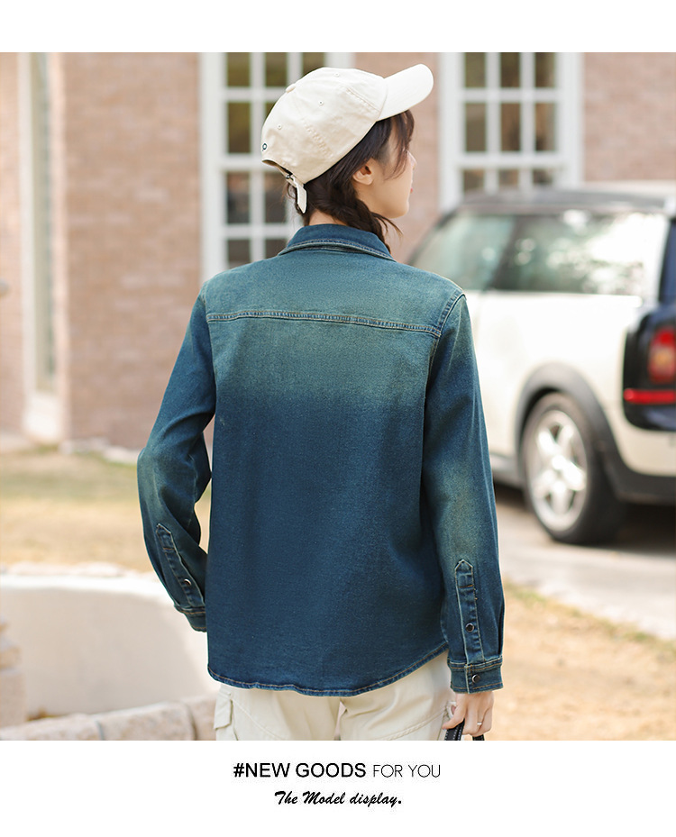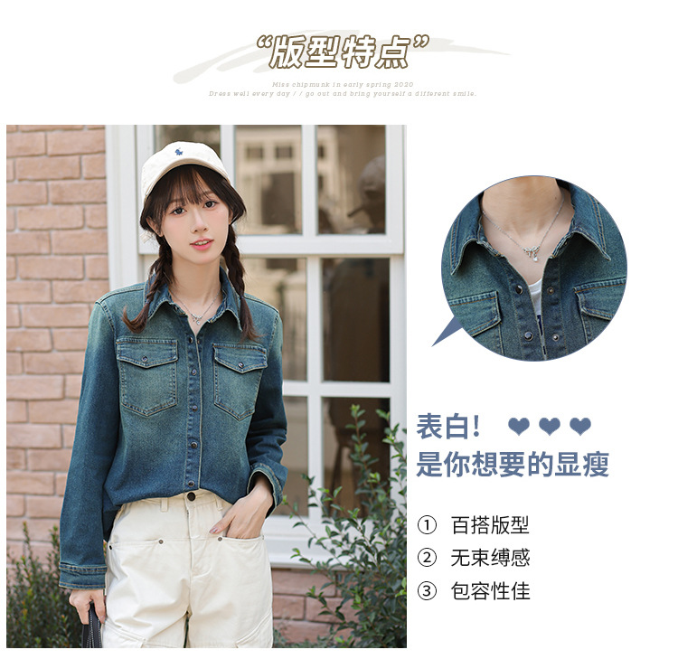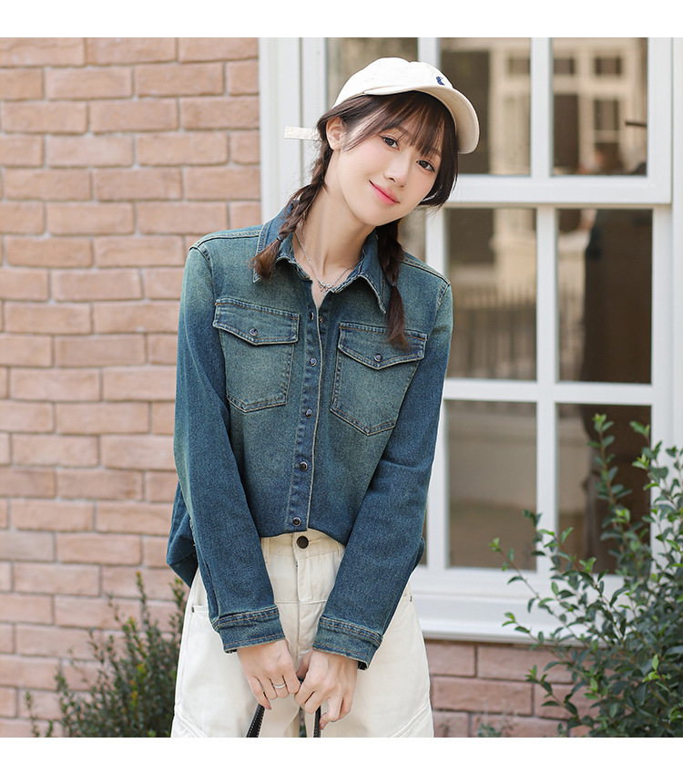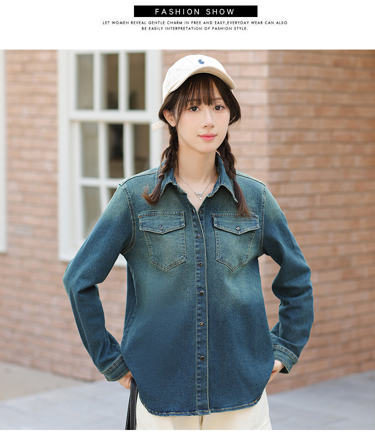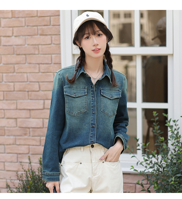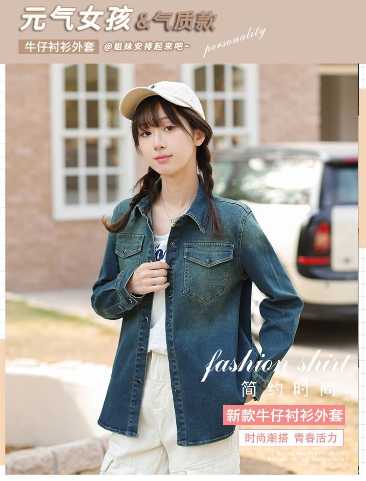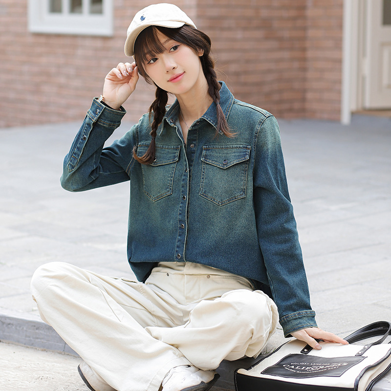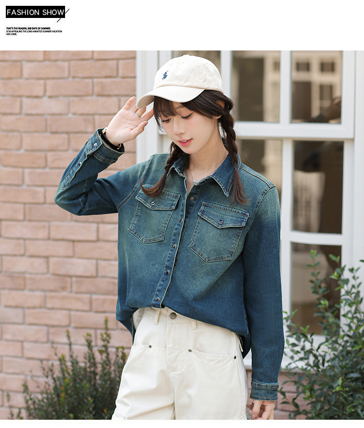 봄 2025 새로운 한국 스타일 복고풍 세련된 디자인 센스 포켓 엘 긴 소매 데님 셔츠스토어 가기