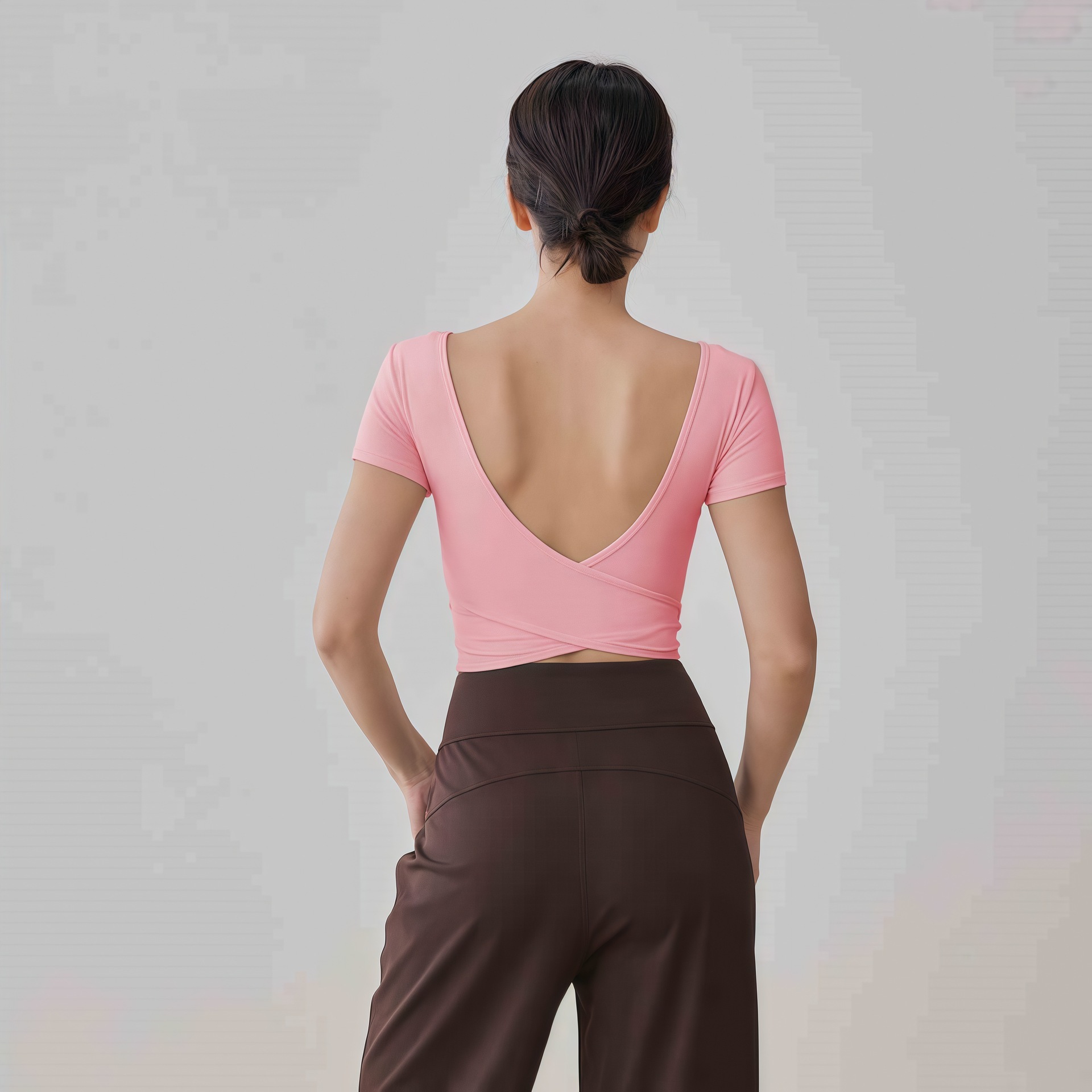 가슴 패드 반팔 티셔츠를 입은 국경 간 프렌치 스퀘어 칼라 요가 의류 슬림 핏 V 백 피트니스 아이언 압연 탑 필라테스토어 가기
