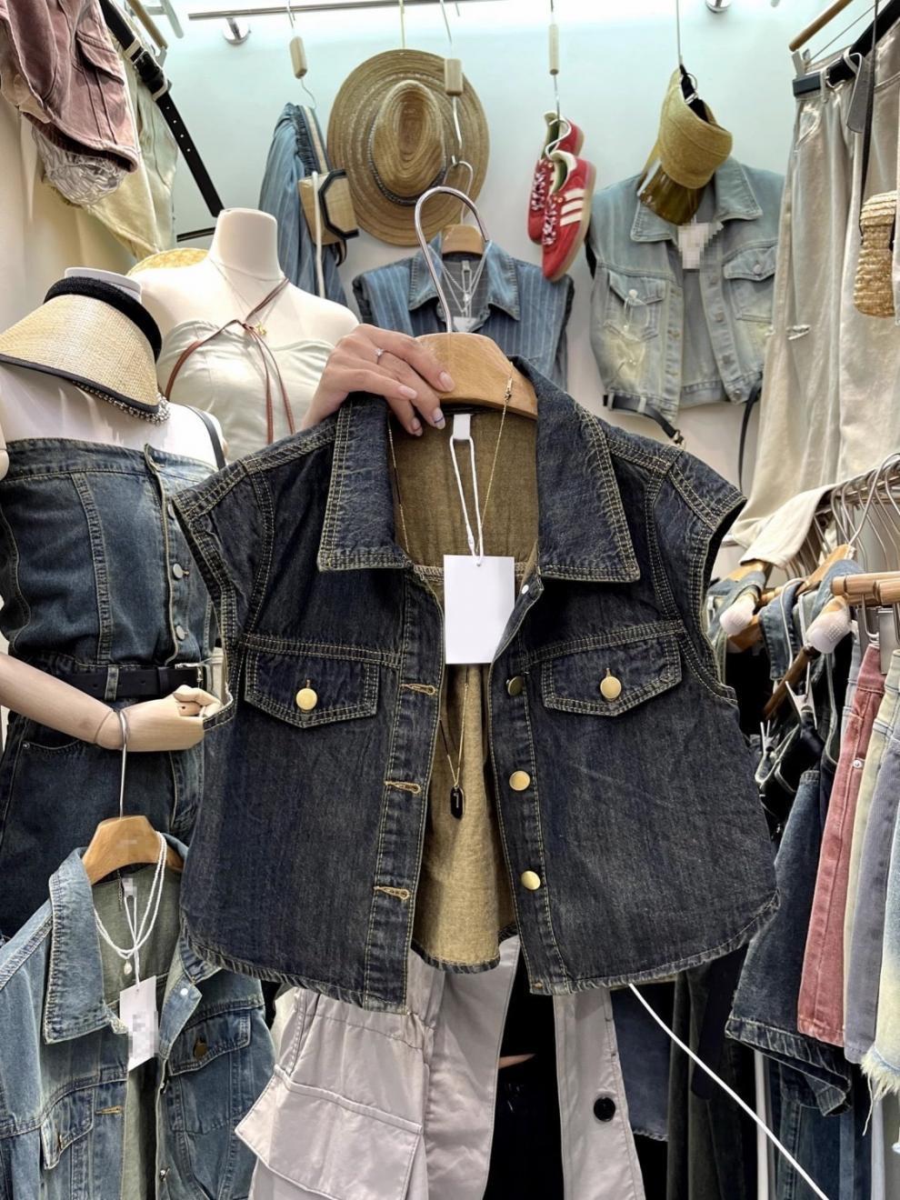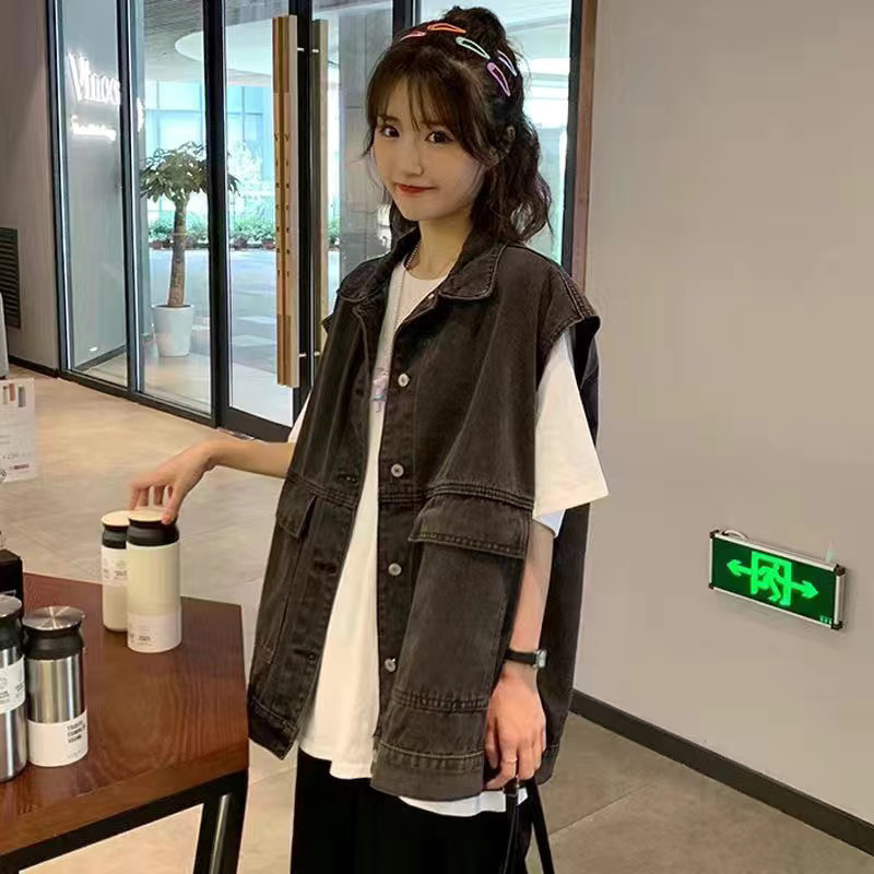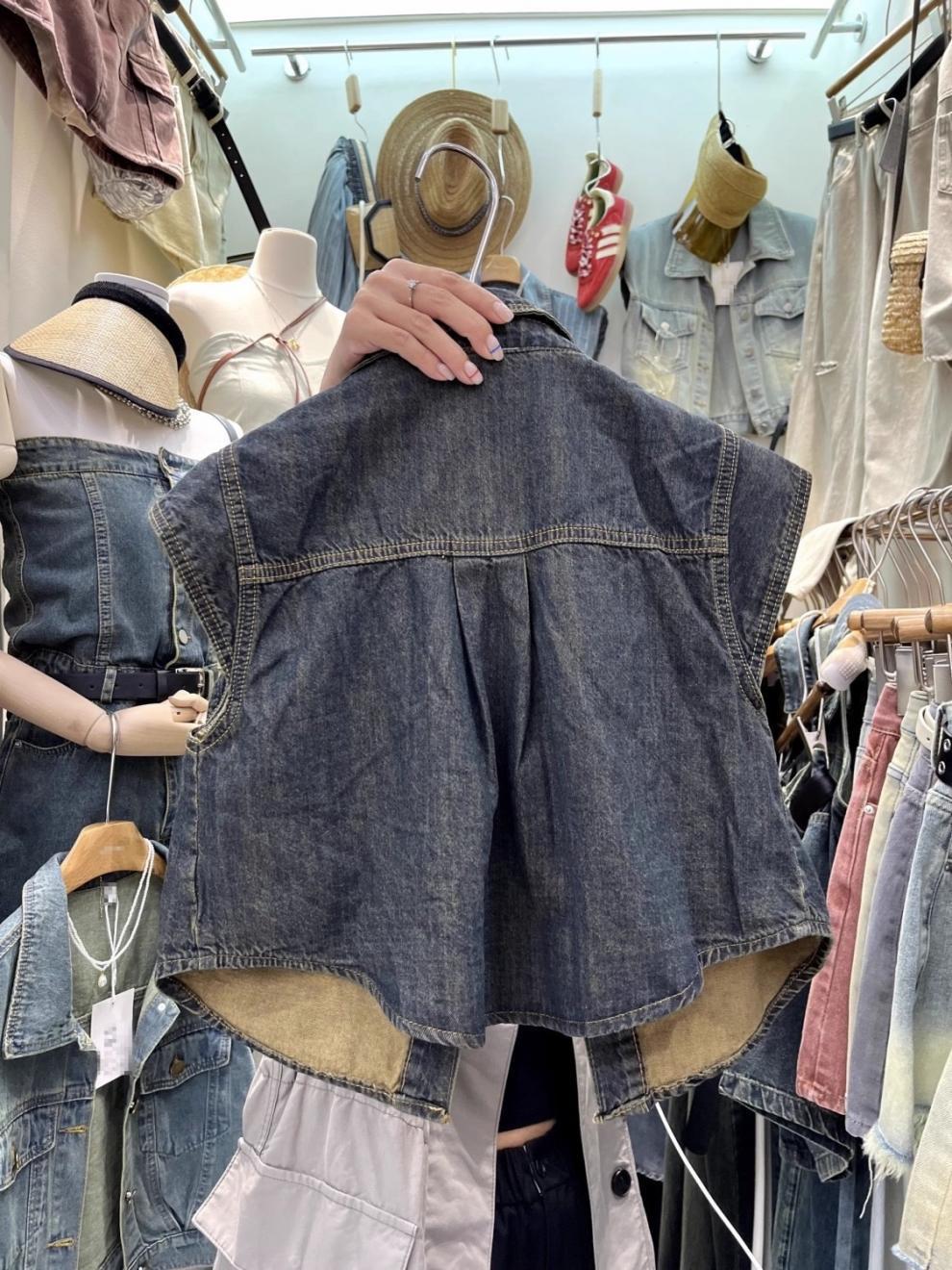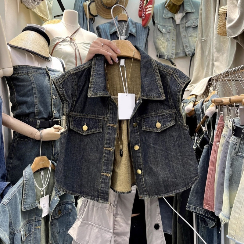 13 라인 여름 새로운 홍콩 스타일 느슨한 슬리밍 짧은 조끼 미국 스타일 레트로 데님 조끼 여성 조끼