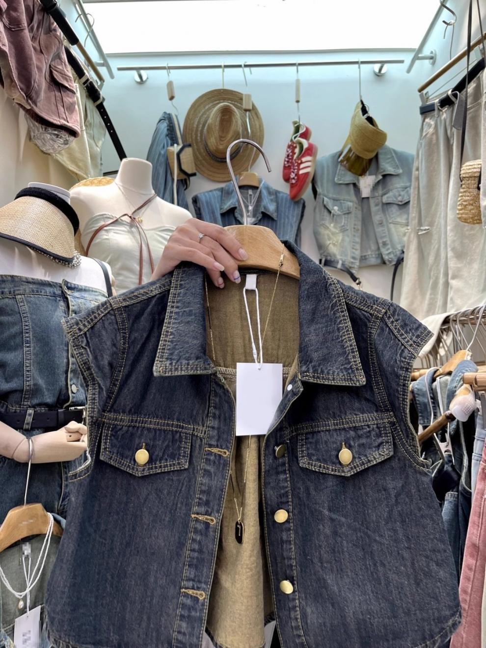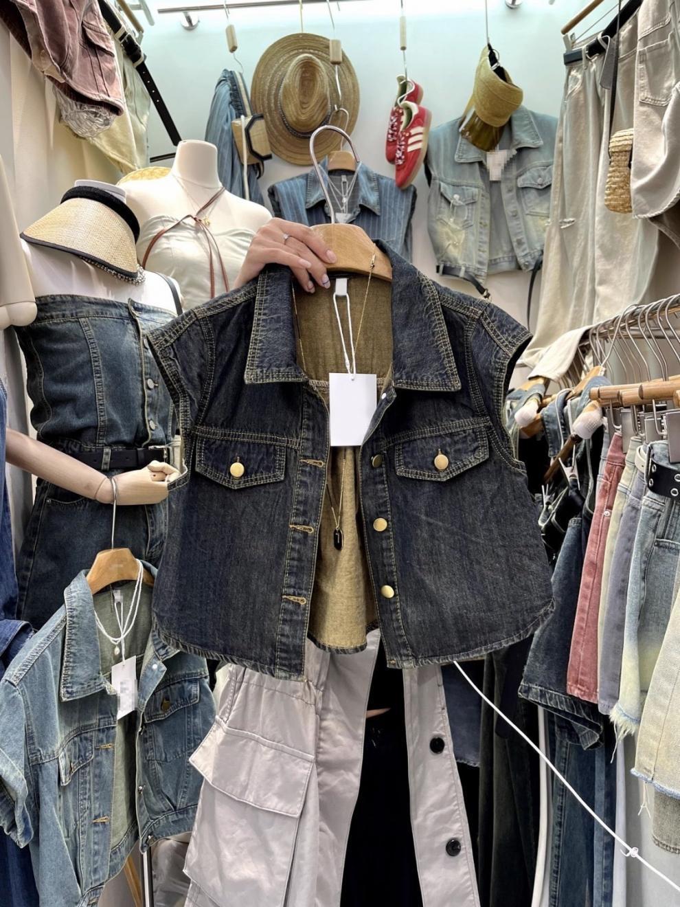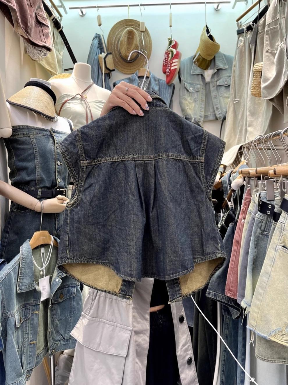 13 라인 여름 새로운 홍콩 스타일 느슨한 슬리밍 짧은 조끼 미국 스타일 레트로 데님 조끼 여성 조끼스토어 가기