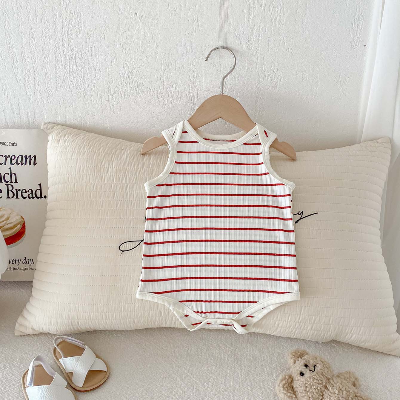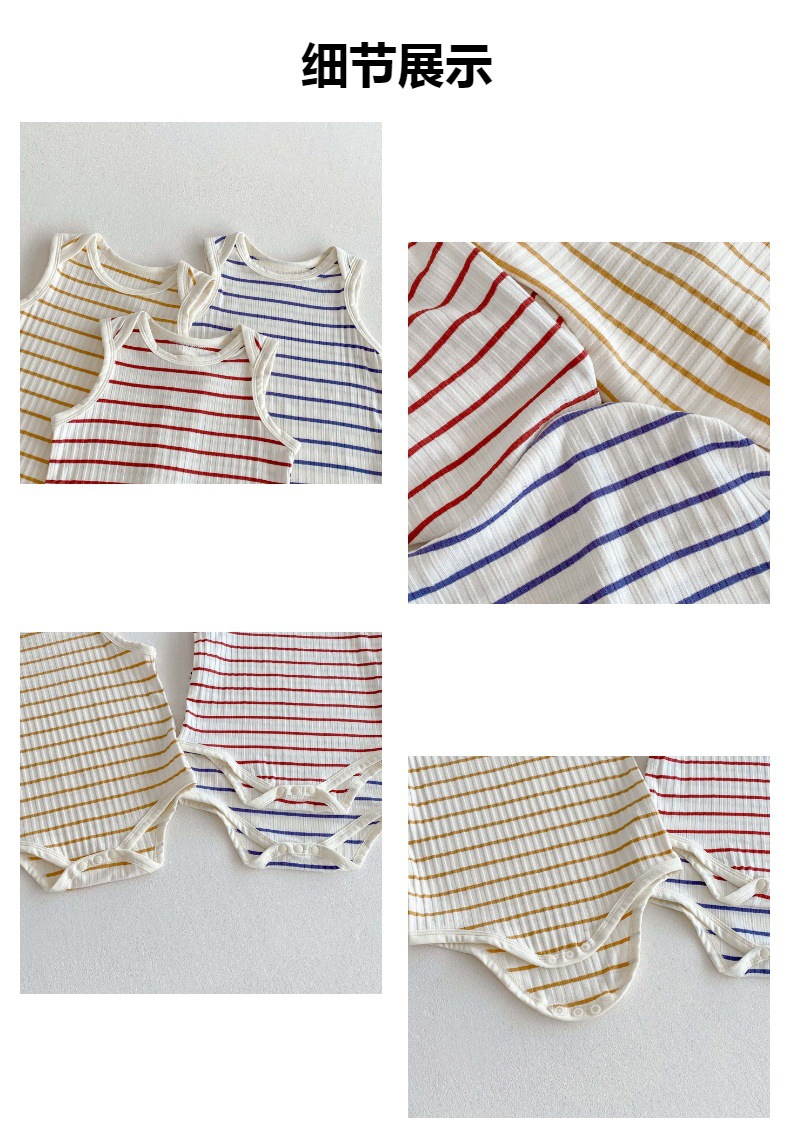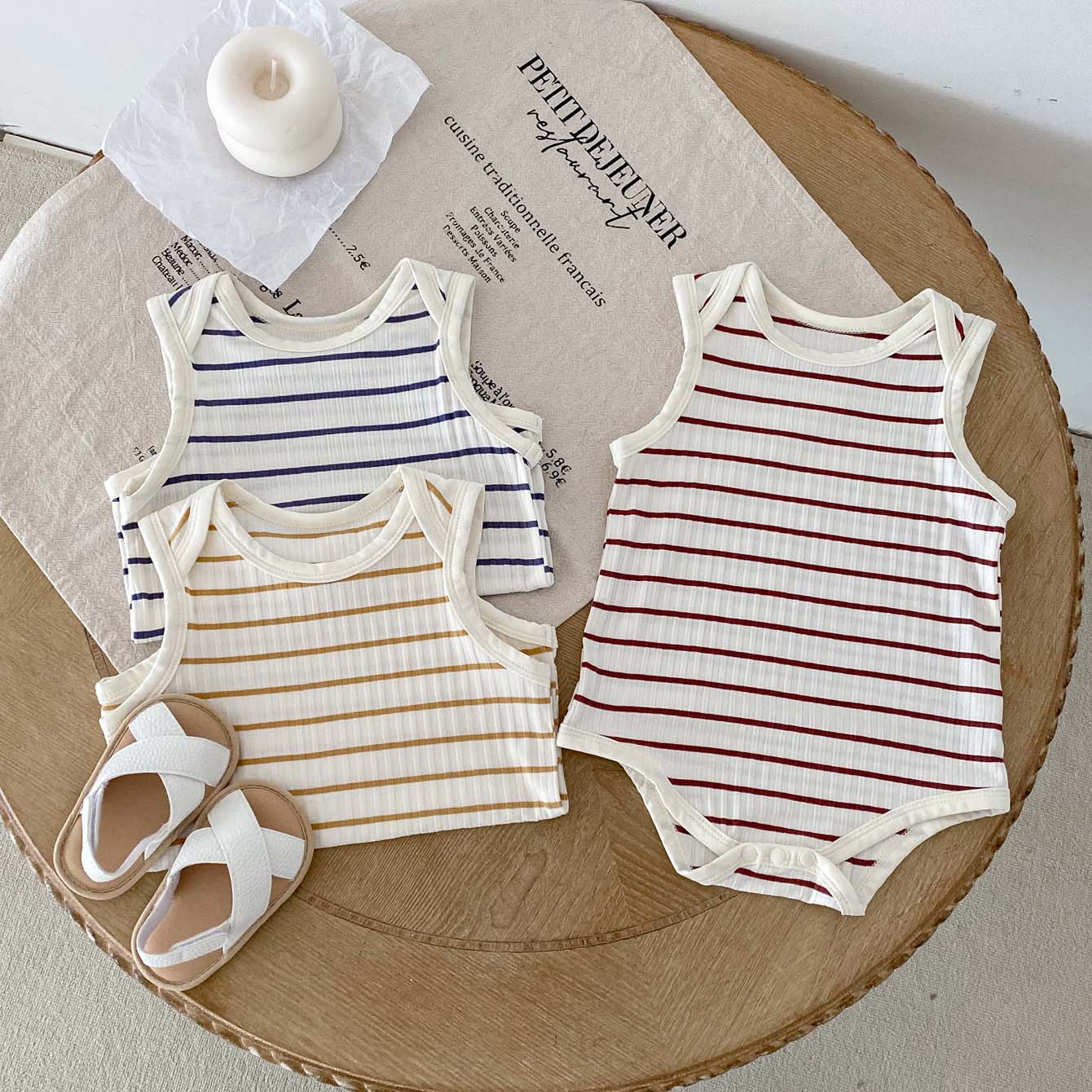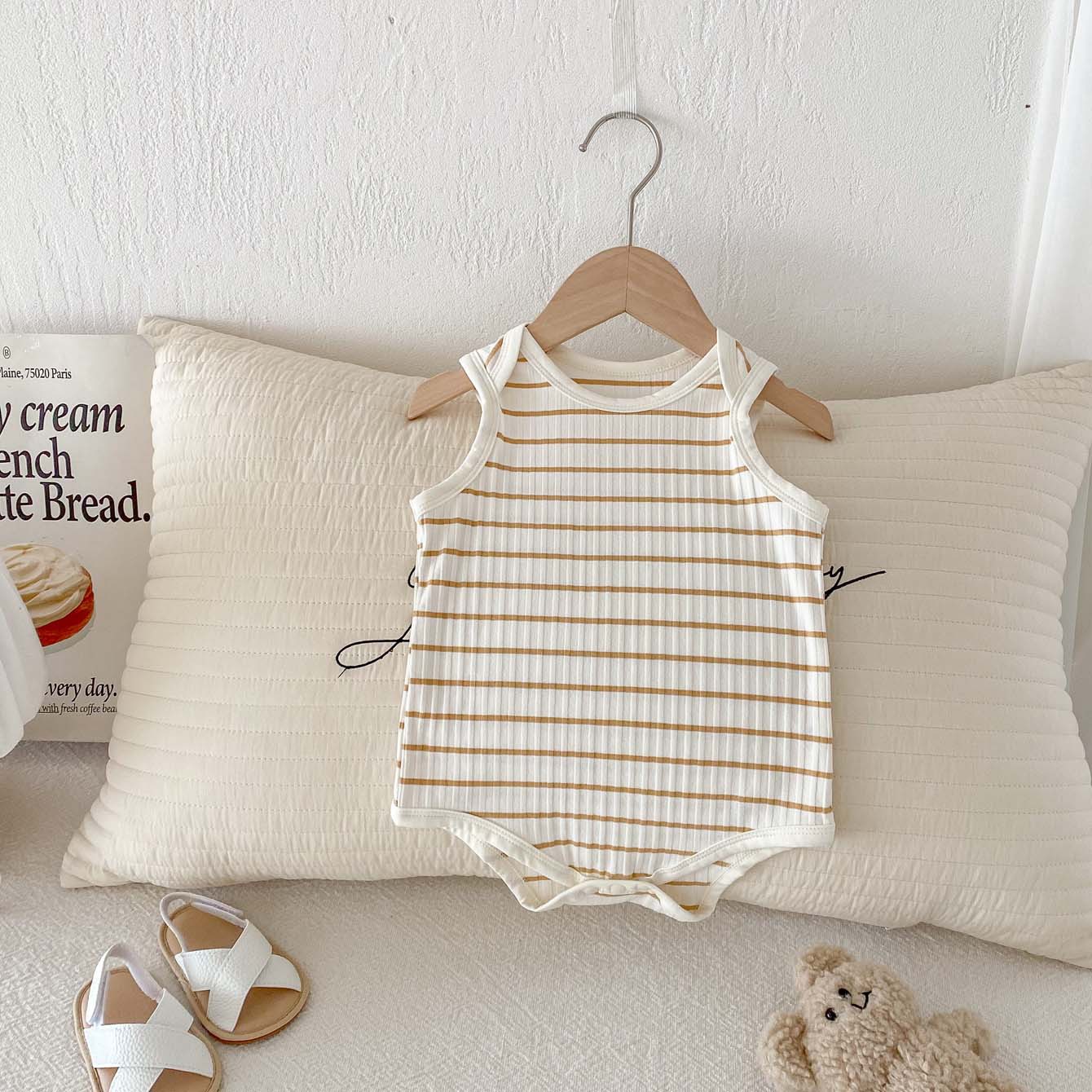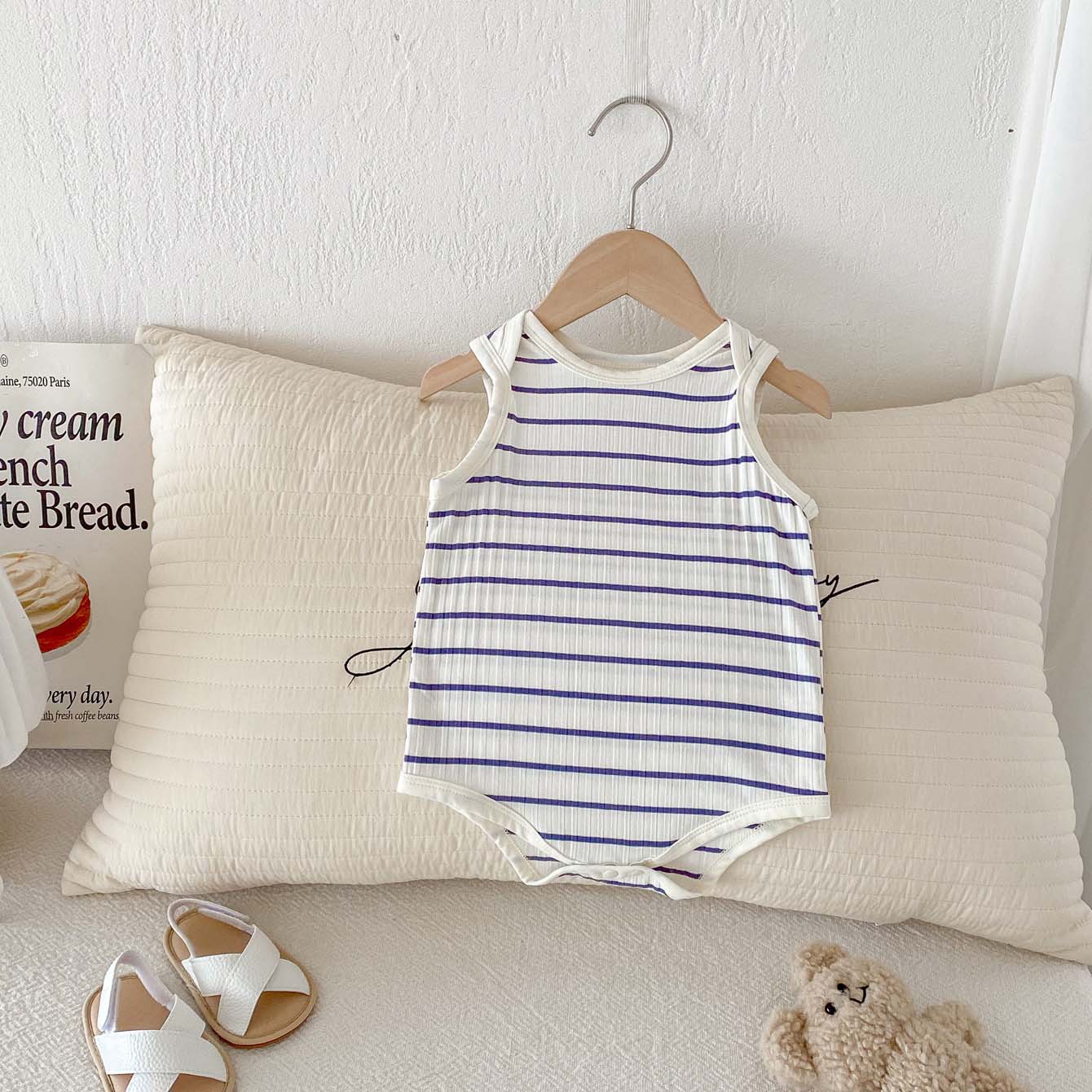 여름 신생아 조끼 점프 수트 한국 민소매 줄무늬 점프 수트 아기 소년과 소녀 아기 봉투 풀오버 얇은