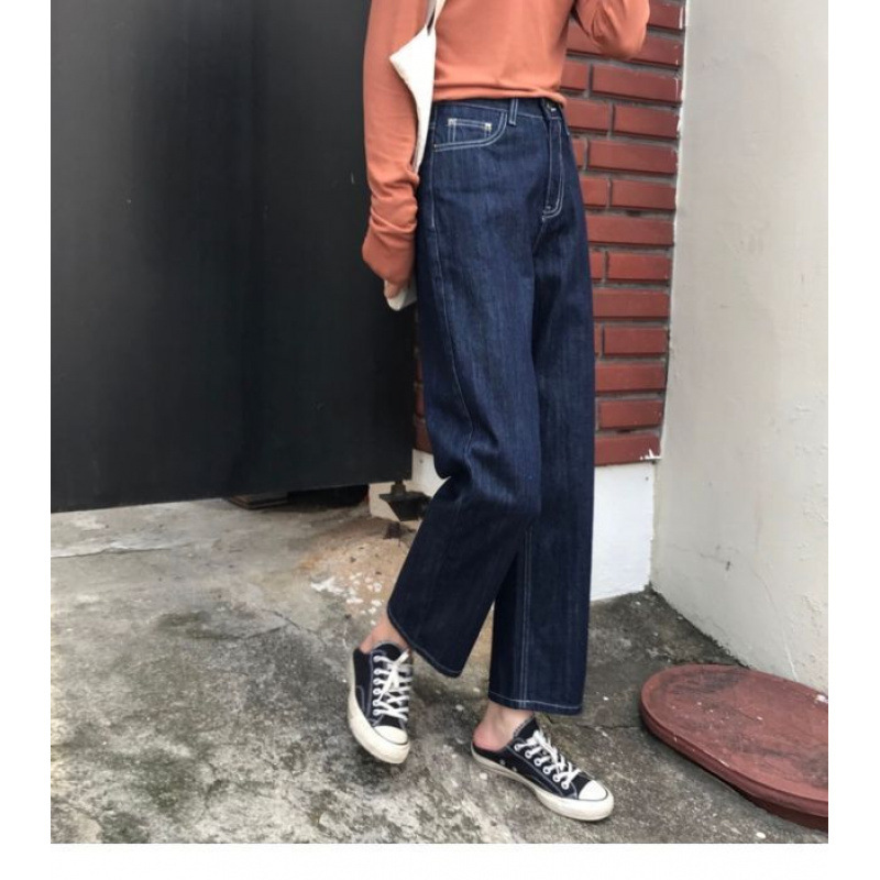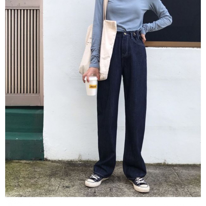 한국 스타일 높은 허리 다크 블루 청바지 디자인 센스 플러스 사이즈 느슨한 넓은 다리 바지 담그는 감각적 인 유행 올매치 스트레이트 바지 트렌디스토어 가기
