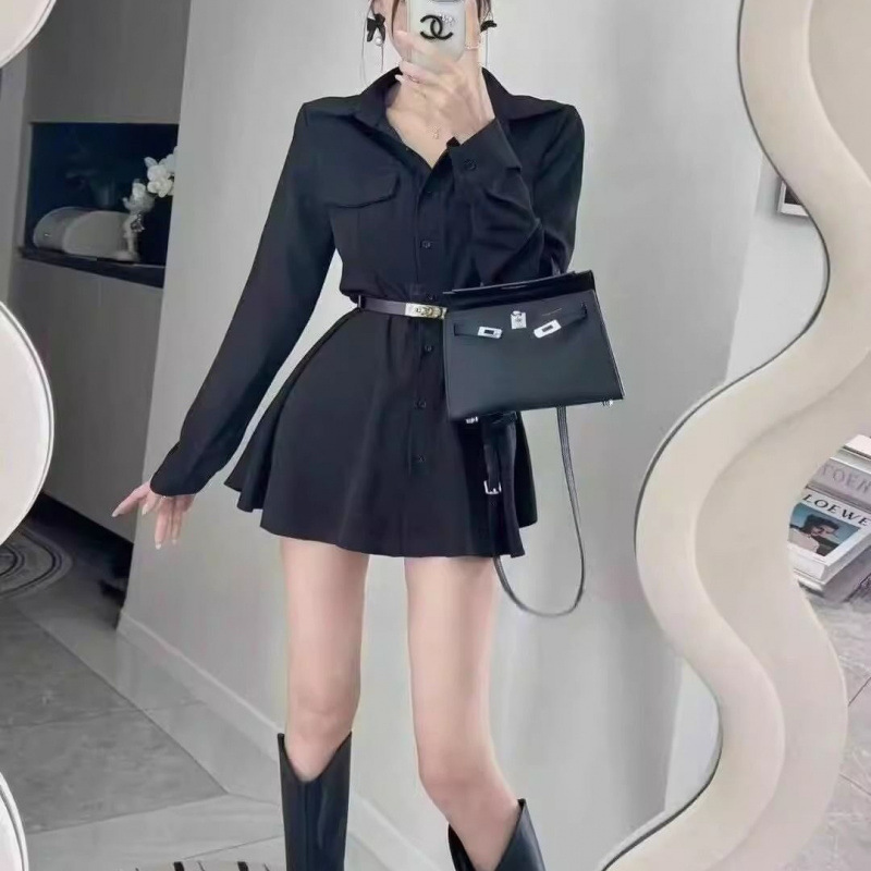 韩系气质收腰polo领长袖衬衫连衣裙女2024早秋修身显瘦百搭A字裙