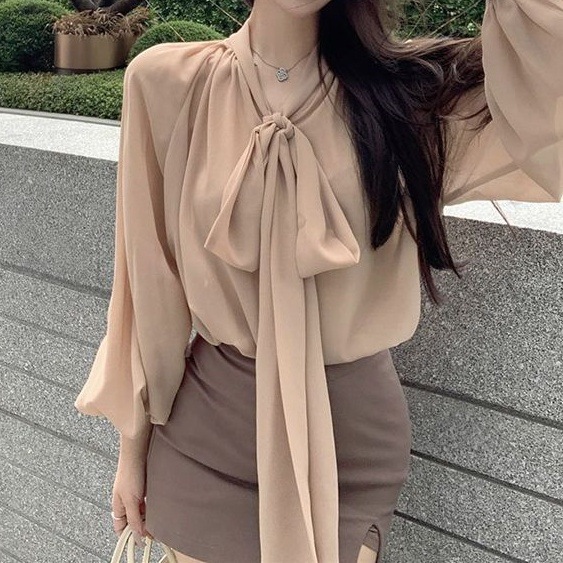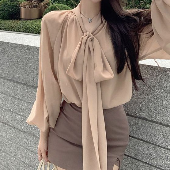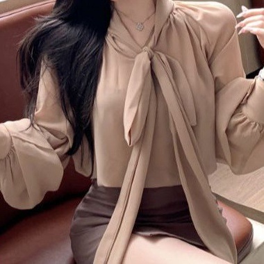 프렌치 보우 스트랩 긴팔 쉬폰 셔츠 여성의 새로운 루즈 디자인 센스 우아한 올매치 미드 길이 탑