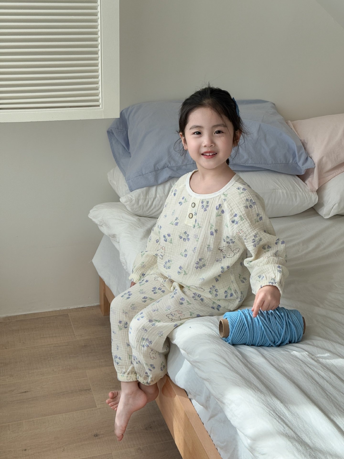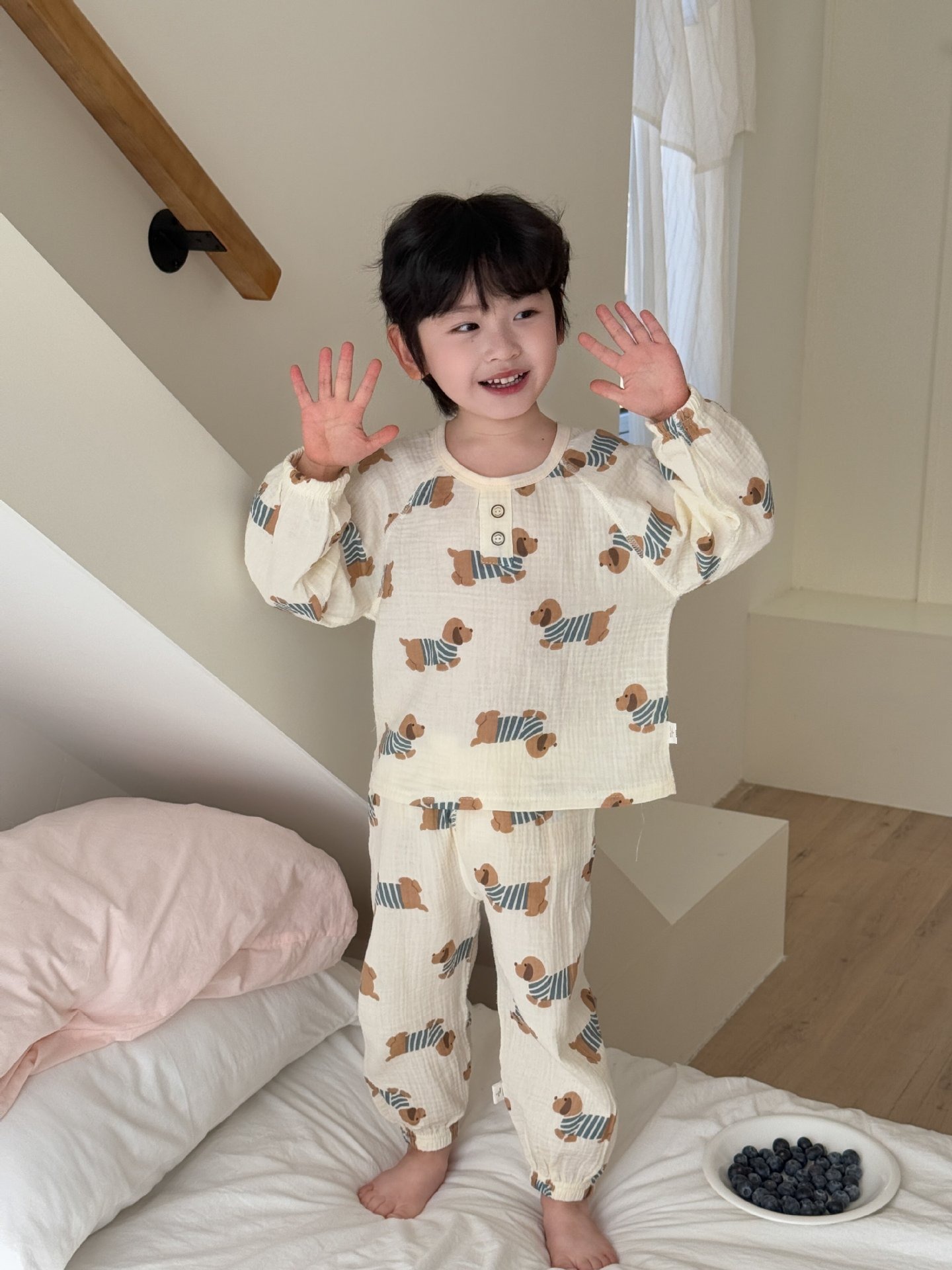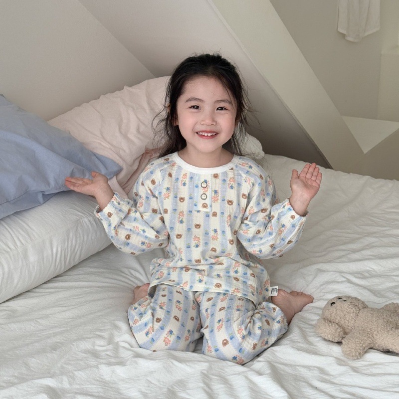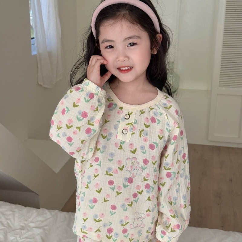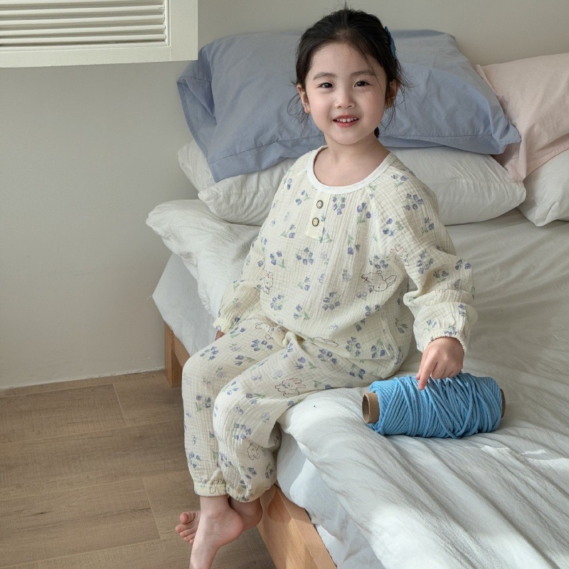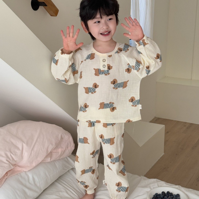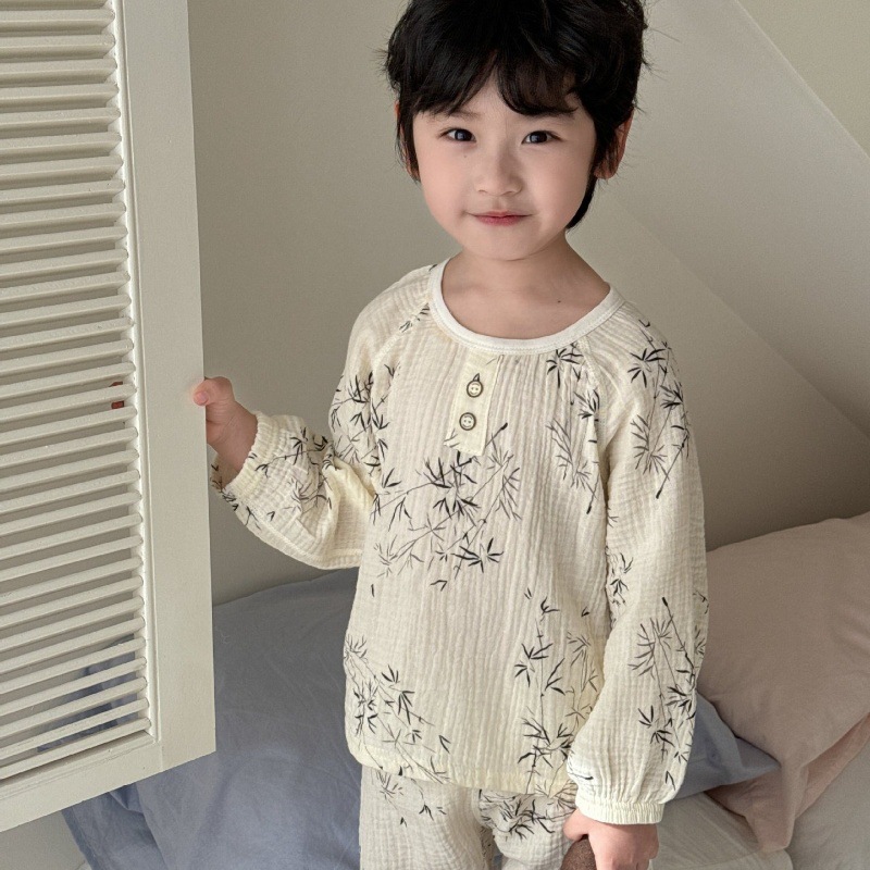 새로운 어린이 더블 거즈 홈 의류 소년과 소녀 코튼 원사 긴 소매 잠옷 면 풀오버 거즈 에어컨 의류 세트스토어 가기
