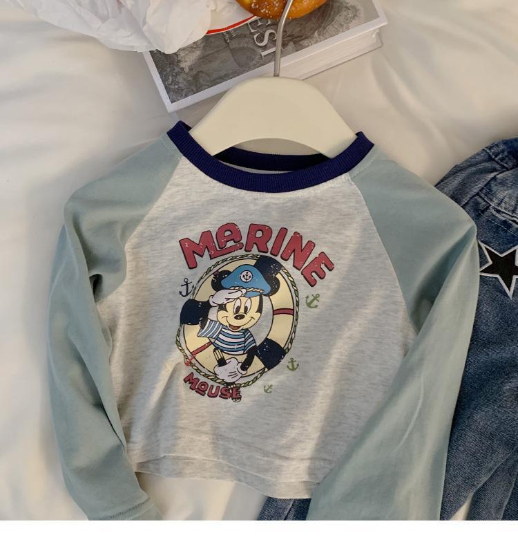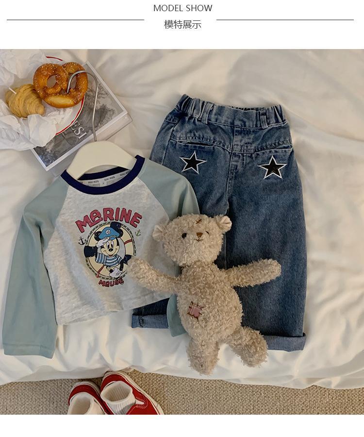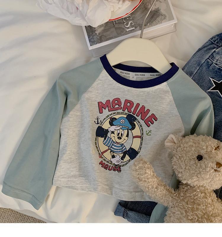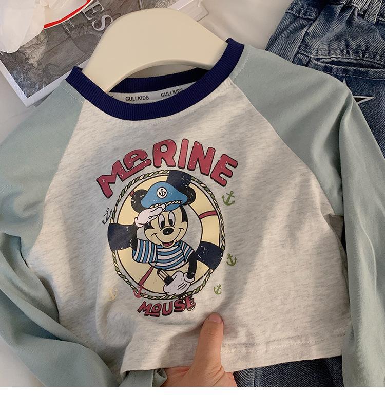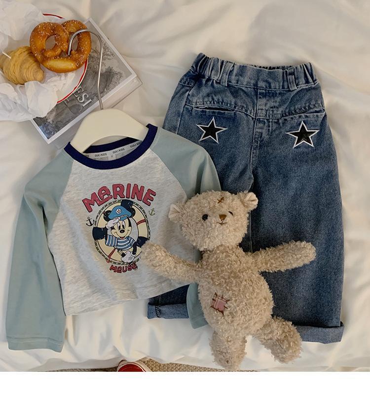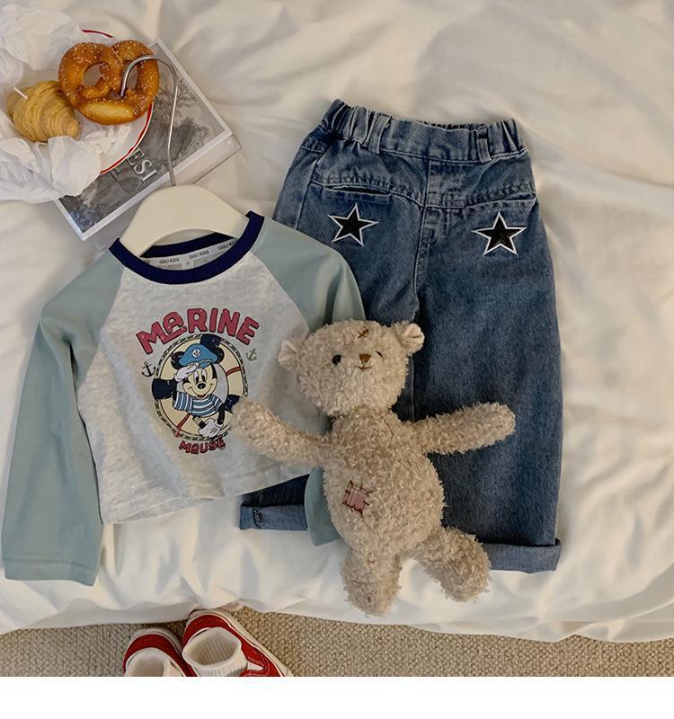 여자 티셔츠 봄과 가을 새로운 한국어 스타일 만화 라글란 슬리브 바닥 셔츠 여자 스타일 짧은 탑 청바지 정장스토어 가기
