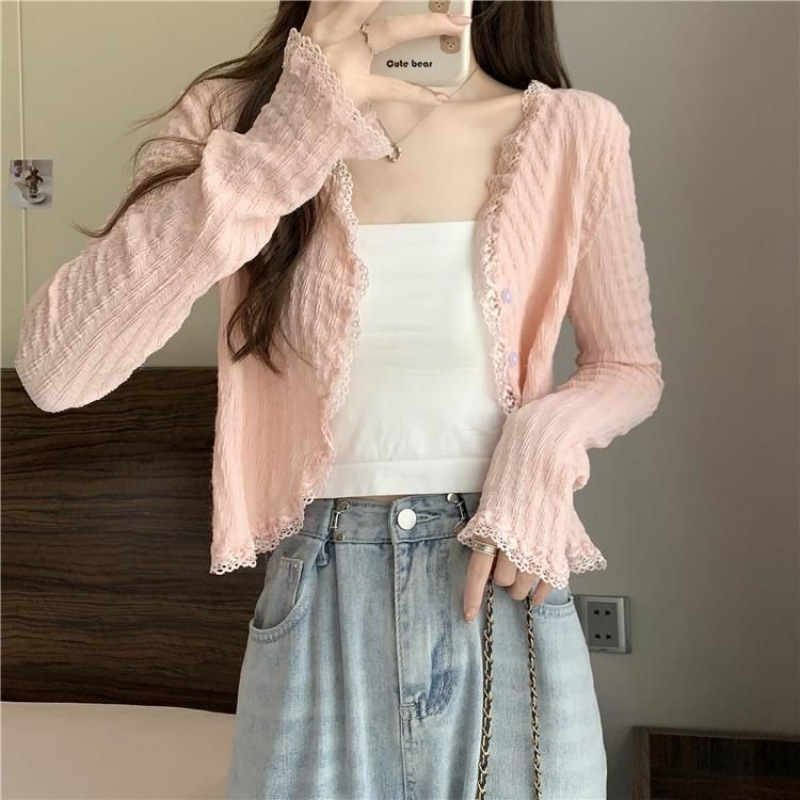 레이스 올 매치 선스크린 니트 카디건 여성 여름 V-넥 디자인 센스 틈새 독특한 세련된 작은 탑