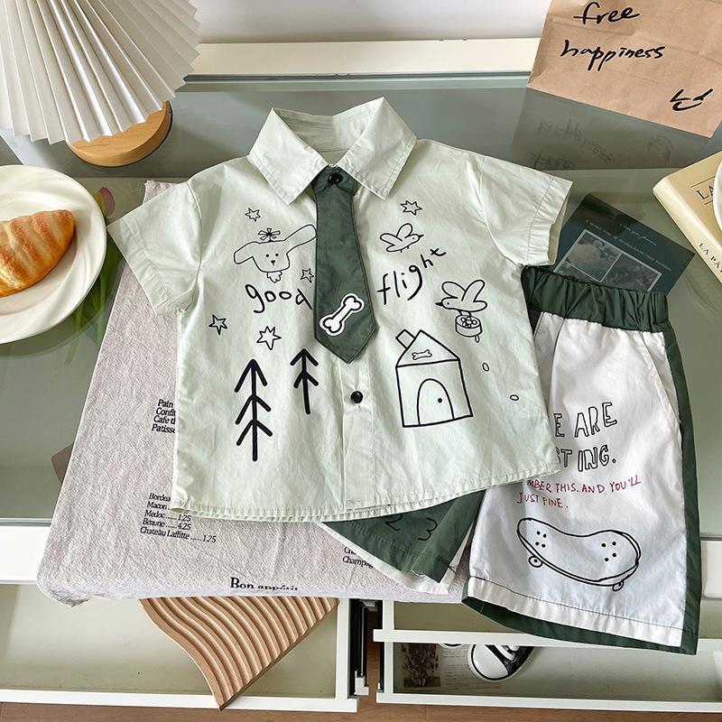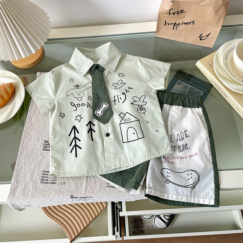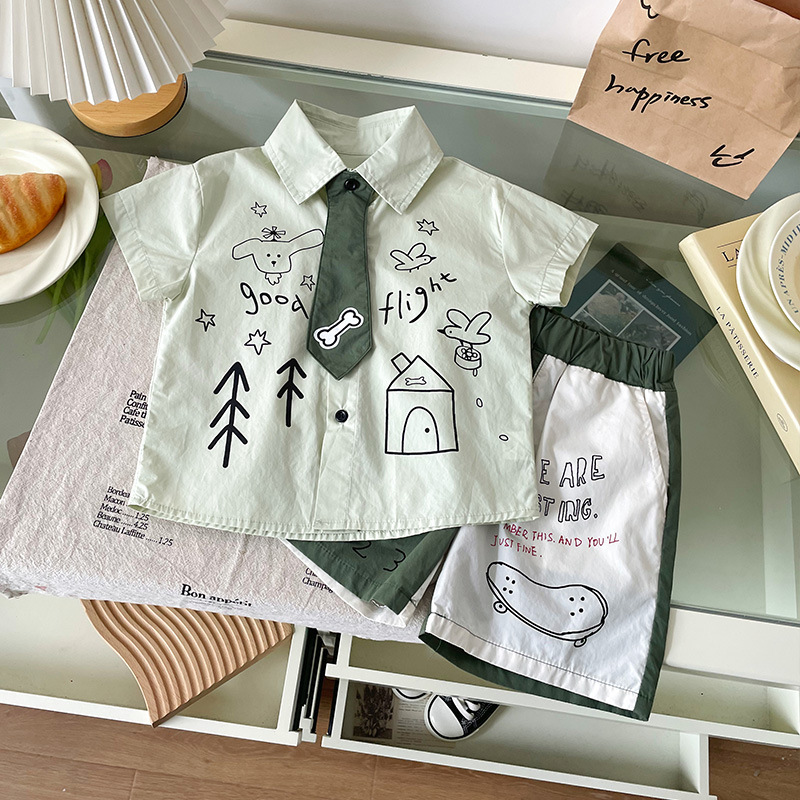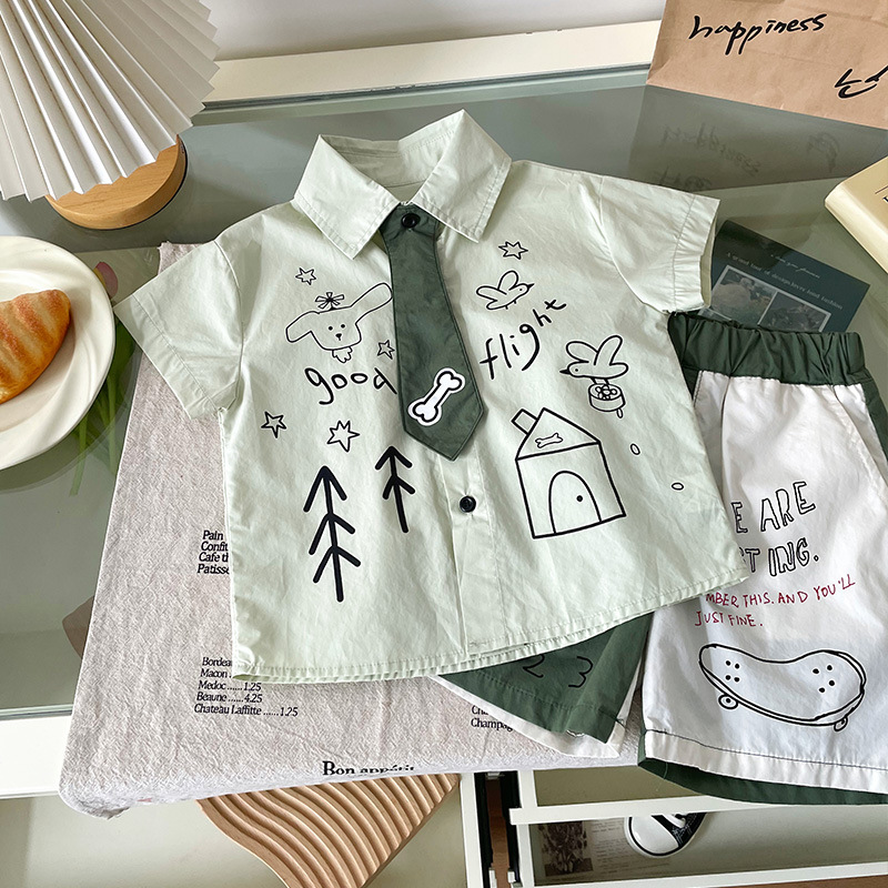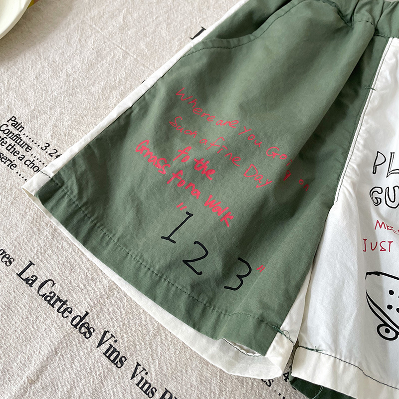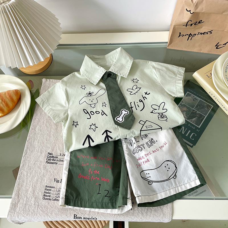 【재고 있음】남아 셔츠 세트 2025 여름 대학풍 멋스럽고 어린애같은 디자인 핸드페인팅 그래피티 반팔