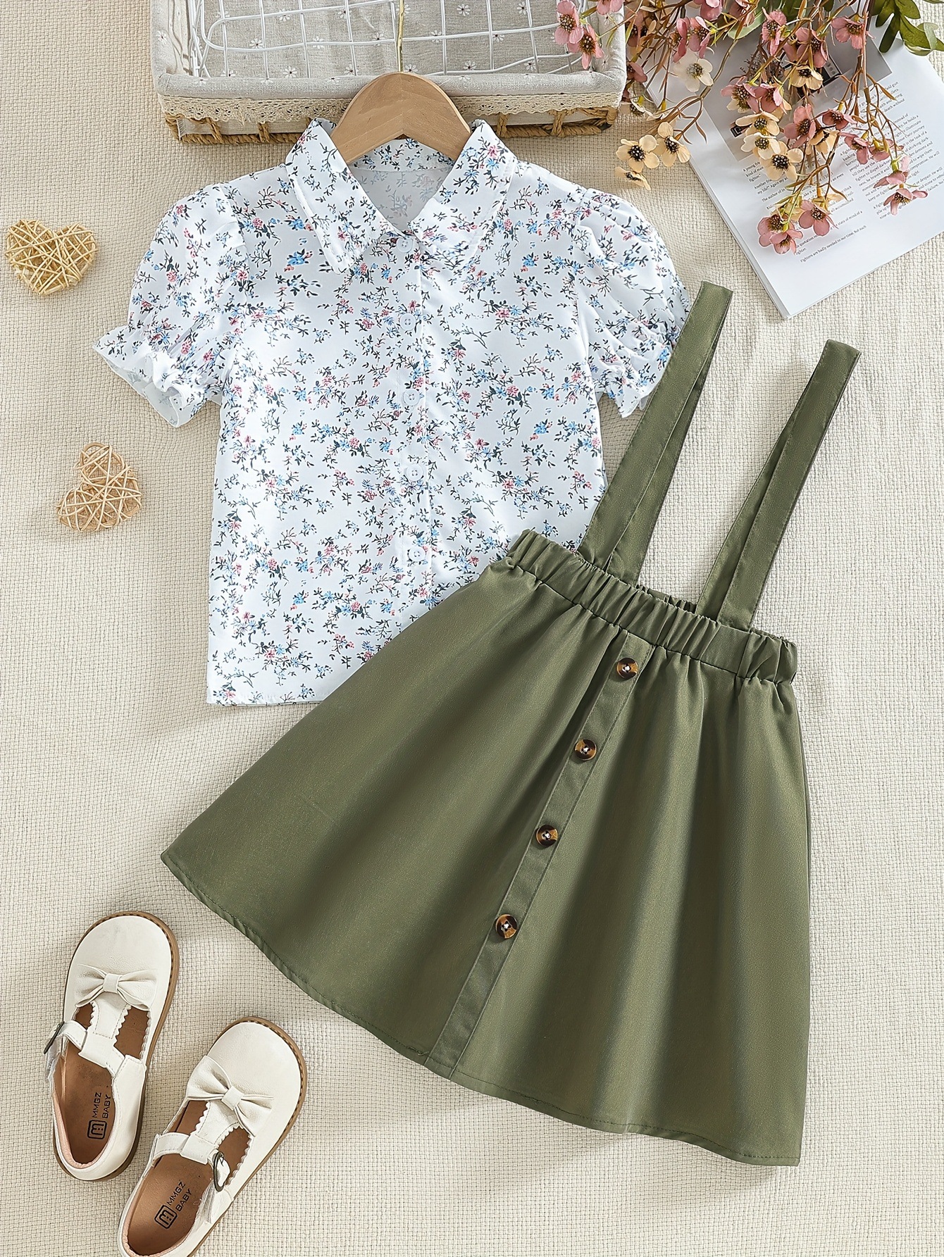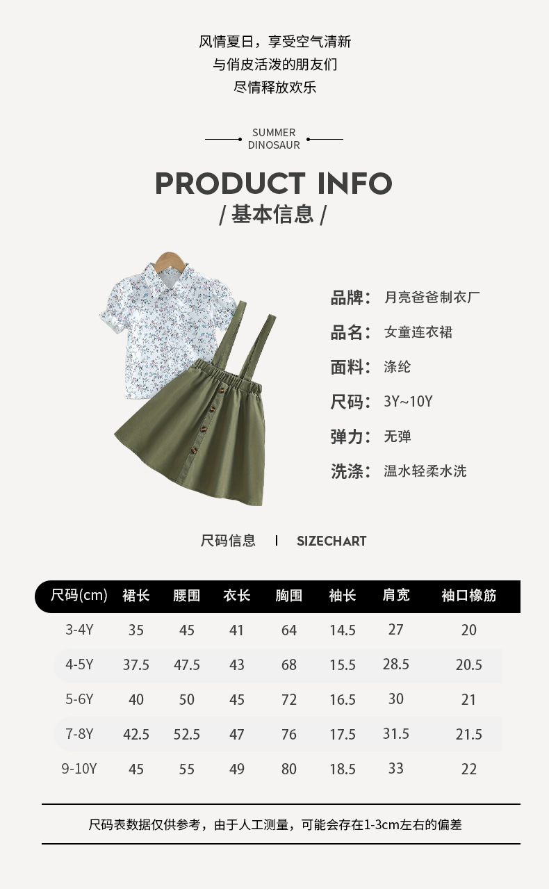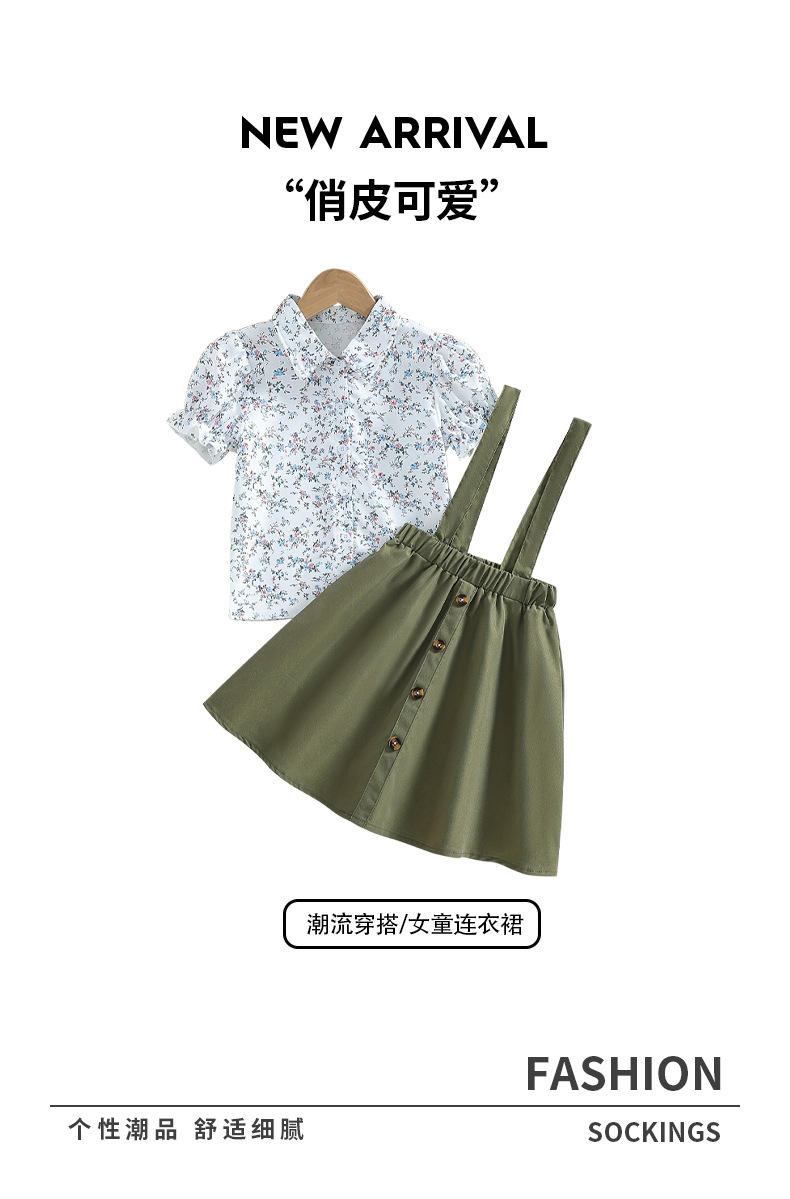 국경 간 소녀 슬링 셔츠 원피스 플로렛 패턴 조끼 어깨 카키 스커트 어린이 투피스 원피스스토어 가기