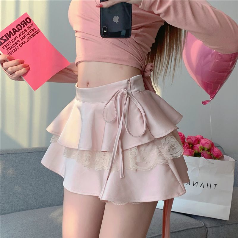 레이스 푹신한 치마 여자 여름 높은 허리 슬리밍 핑크 케이크 스커트 짧은 치마 발레 주름 치마