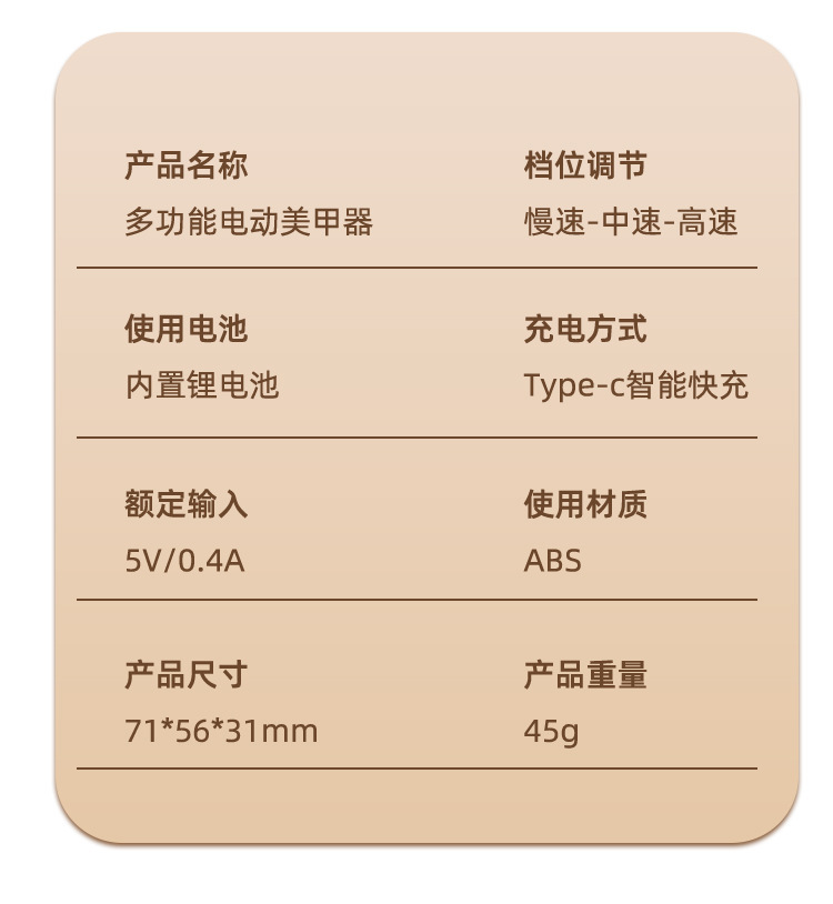 此链接是低配版磨甲器:单个产品配砂纸磨头(磨头是紫色的),电池容量150mah,充电线长度0.2m,单个产品彩盒包装,产品+充电线+说明书+彩盒 重量60克左右,200个一箱, 箱子尺寸38.5*28*35cm ,毛重13.5kg左右