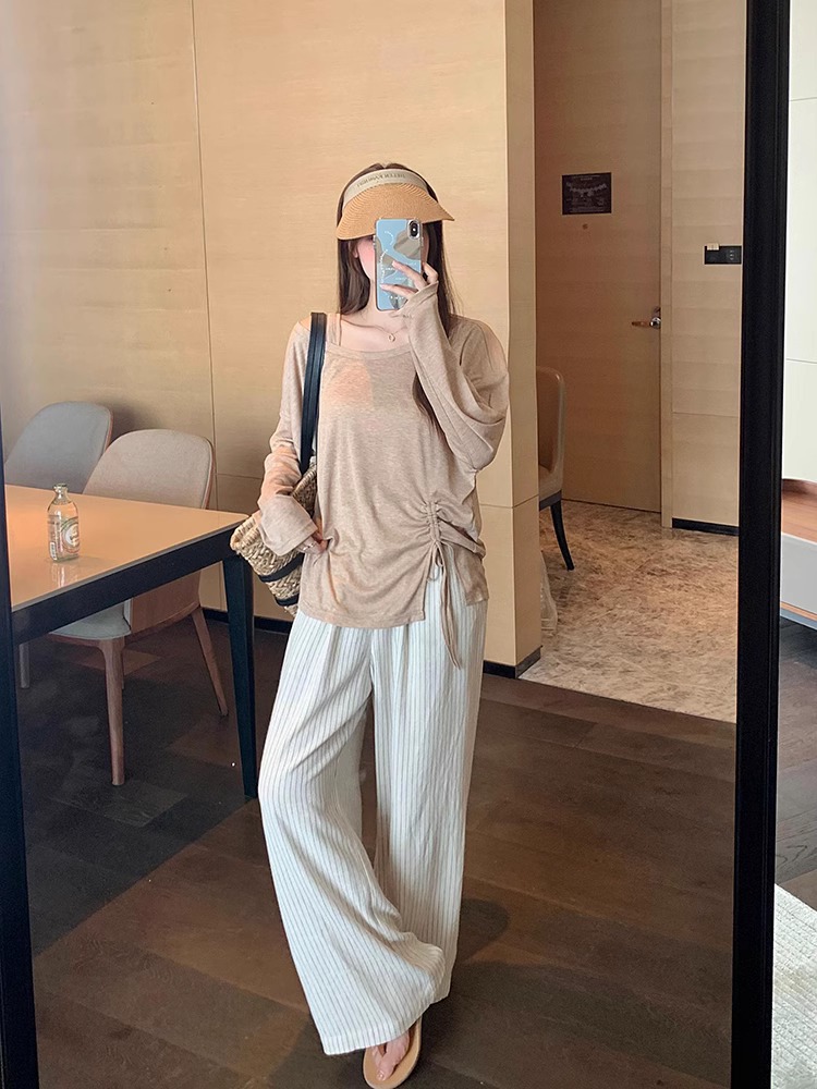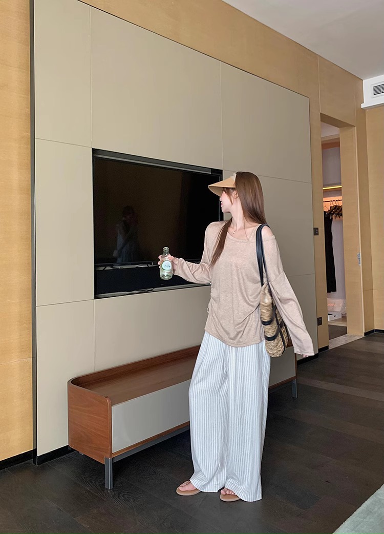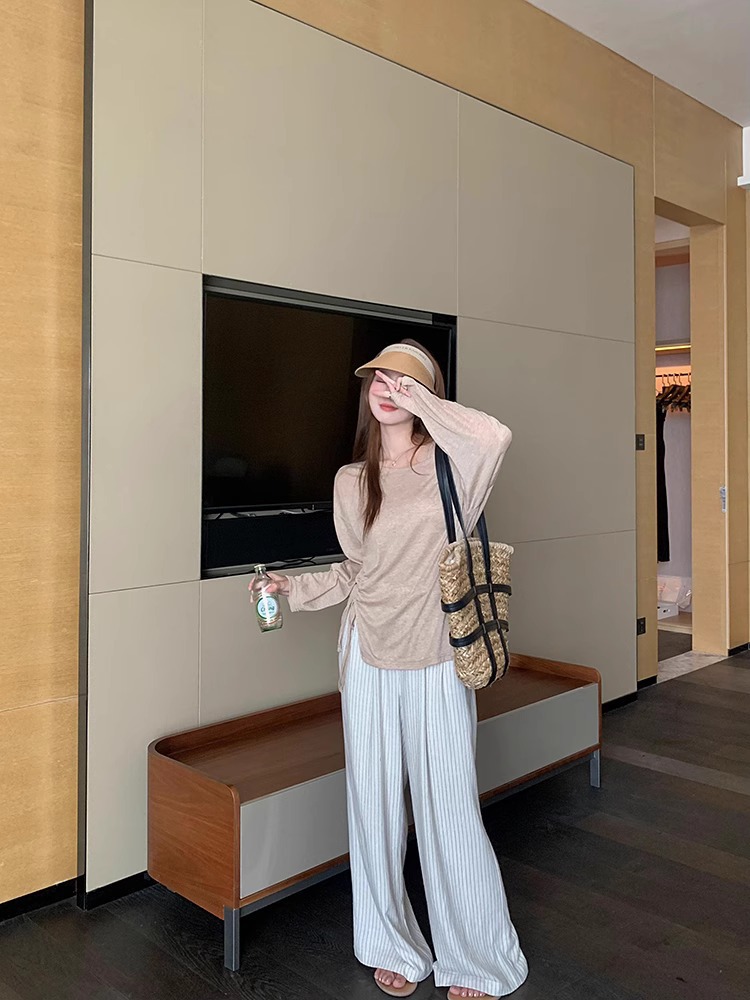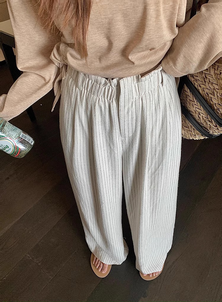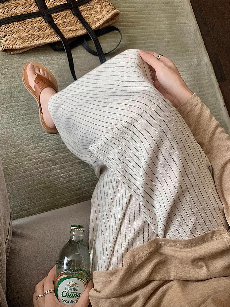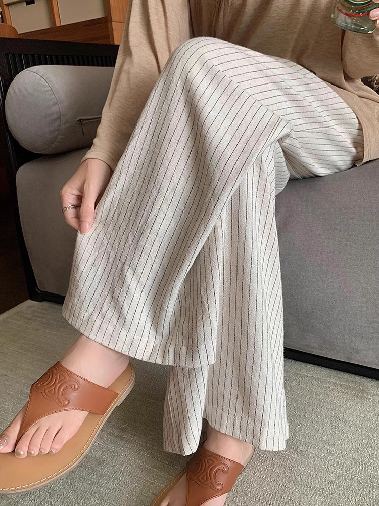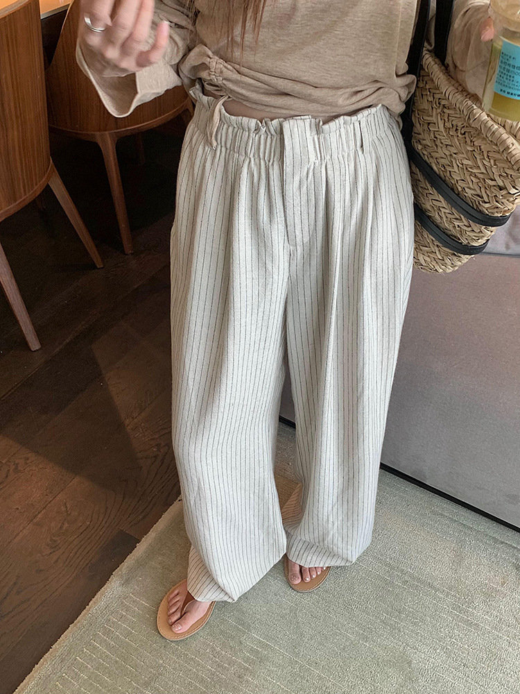松弛感条纹棉麻花苞休闲裤女松紧腰显瘦肌理垂感拖地长裤春季