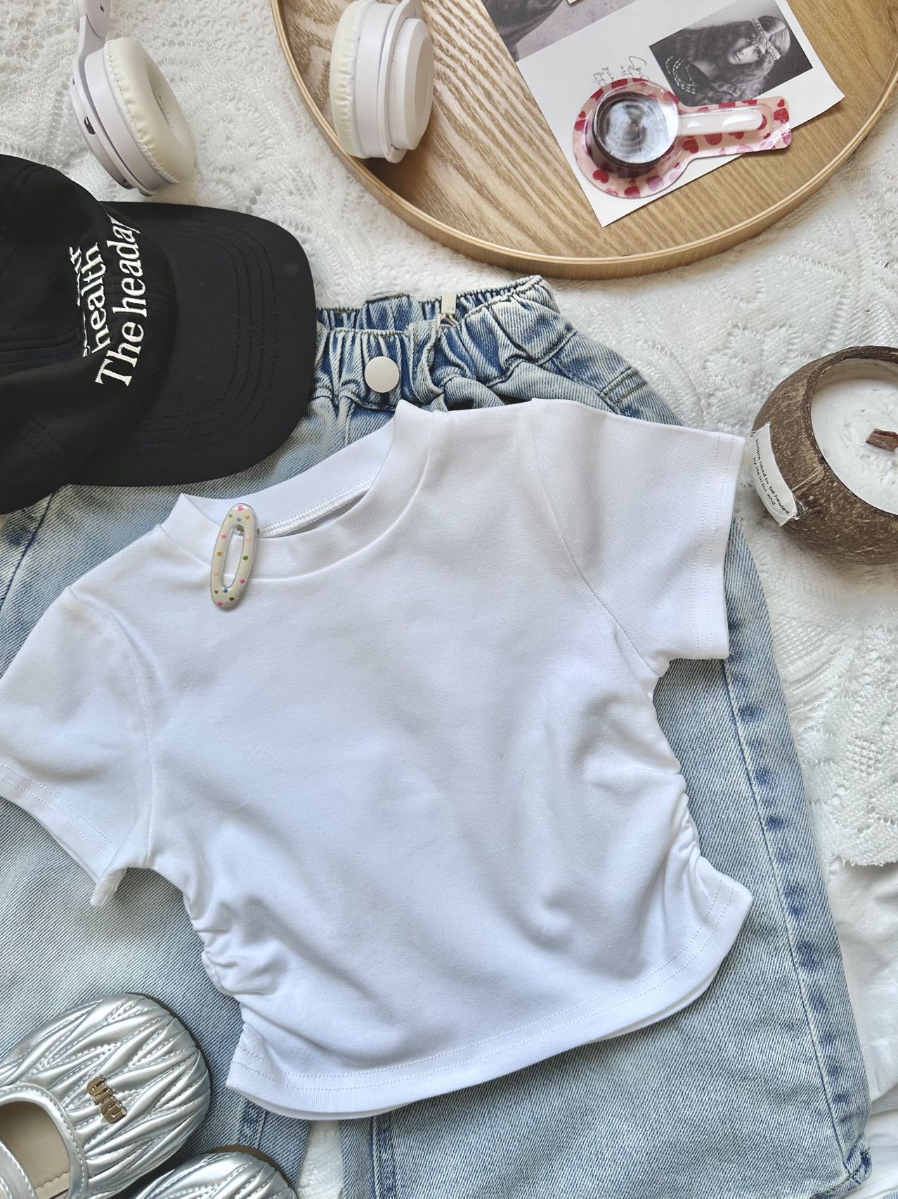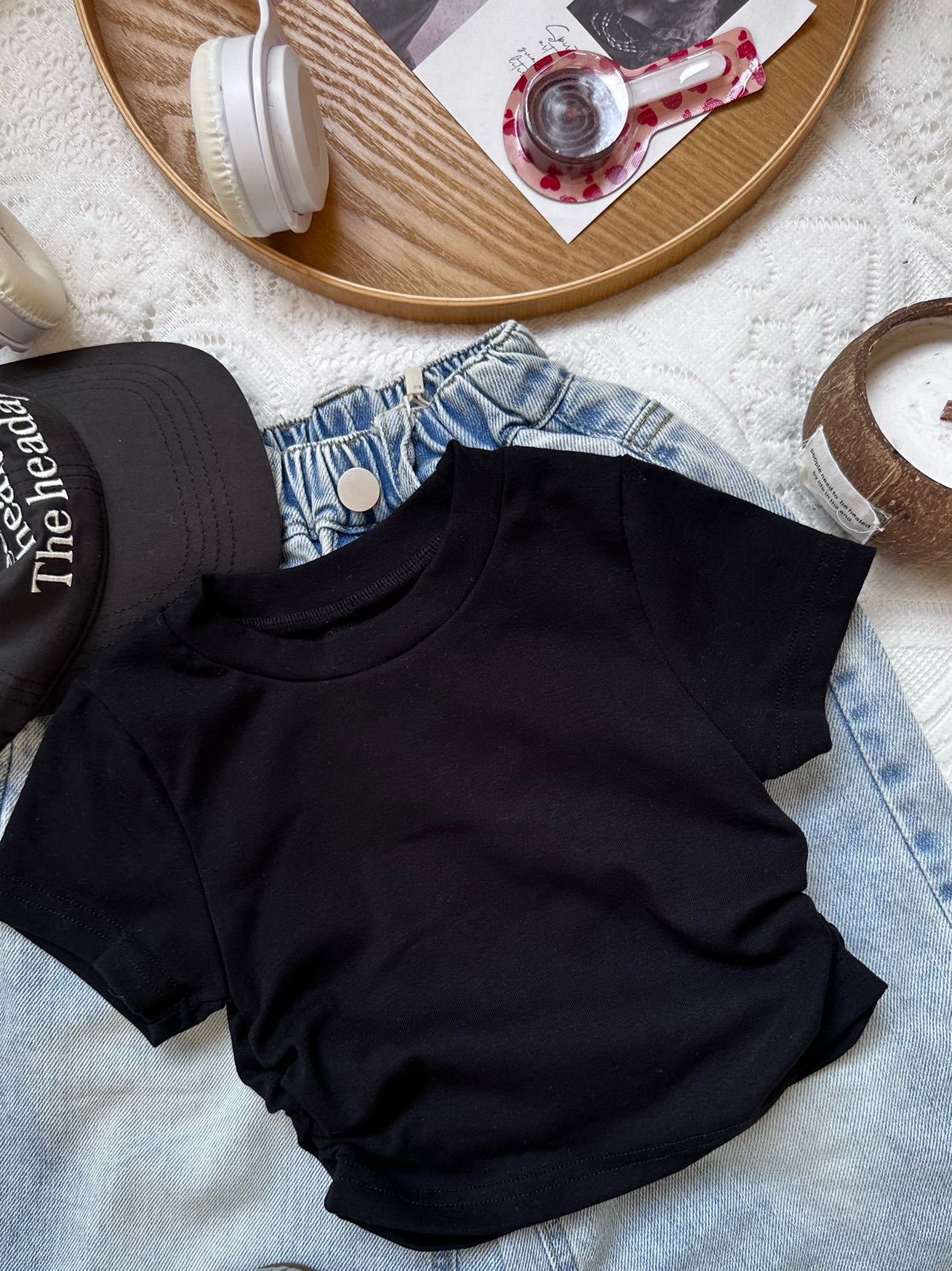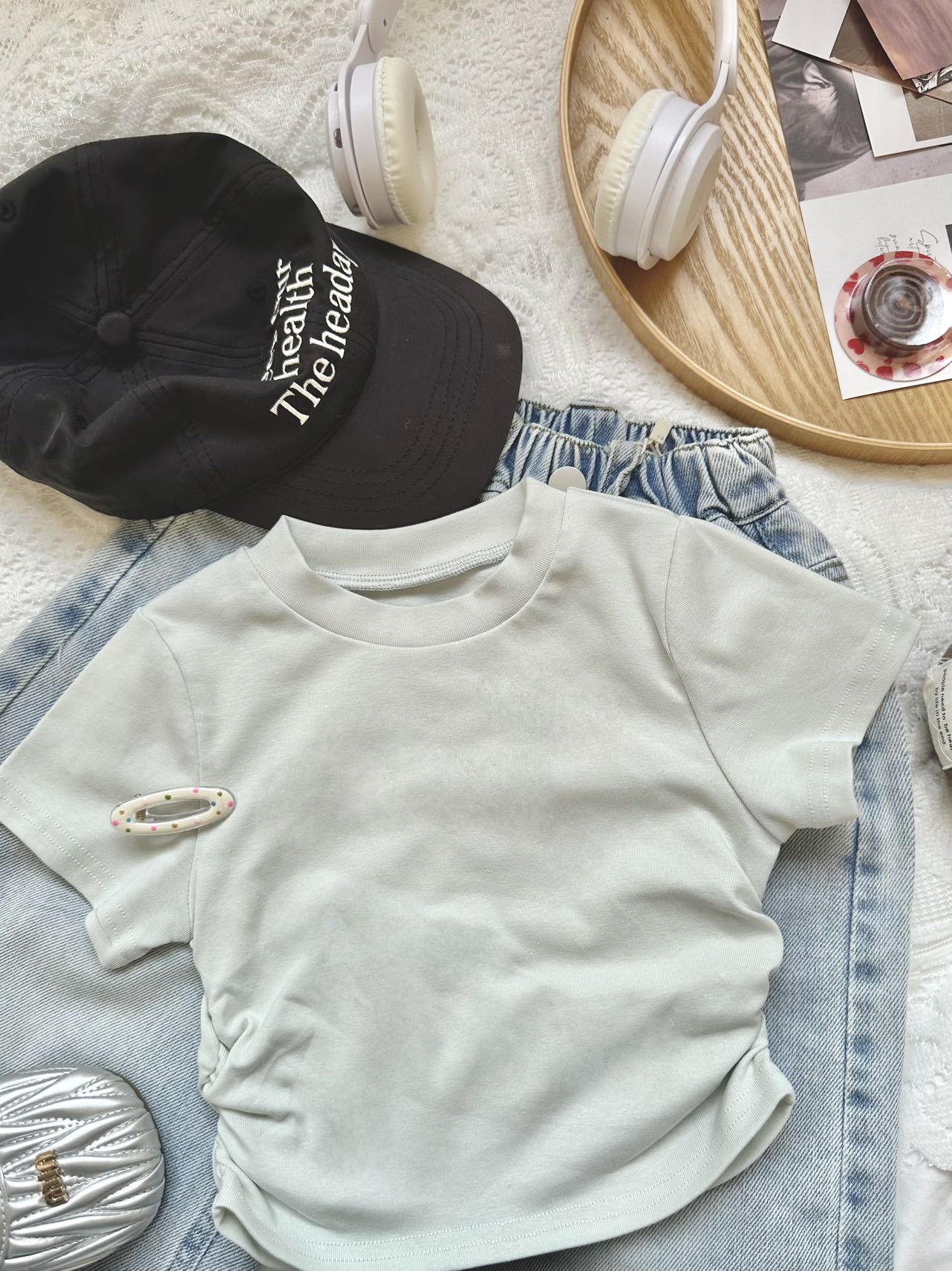 여자 티셔츠 2025 여름 새 한국 스타일 주름 티셔츠 올 매치 솔리드 컬러 반팔 웨스턴 스타일 기본 티셔츠